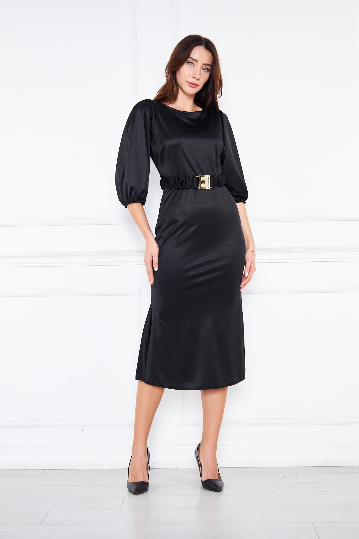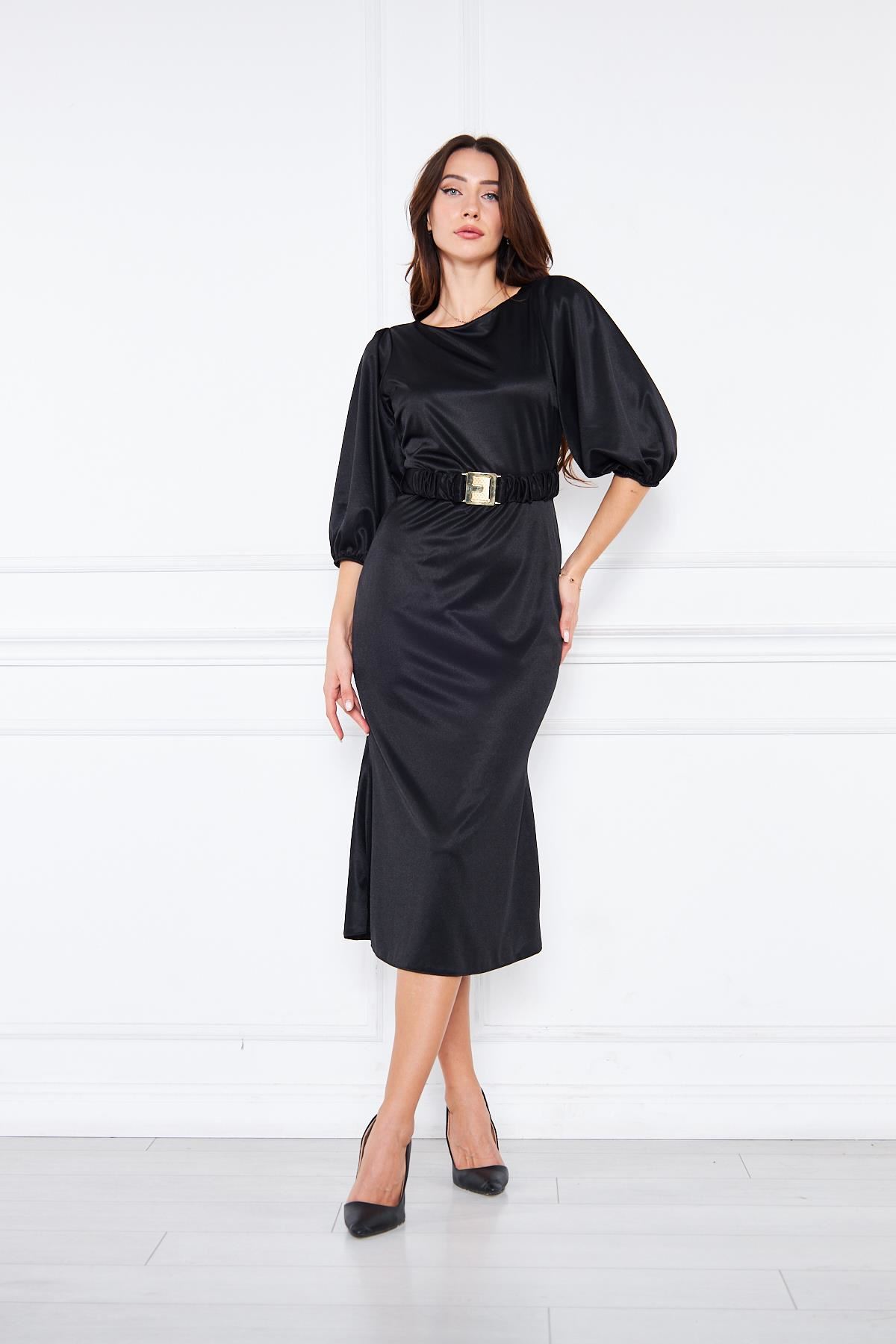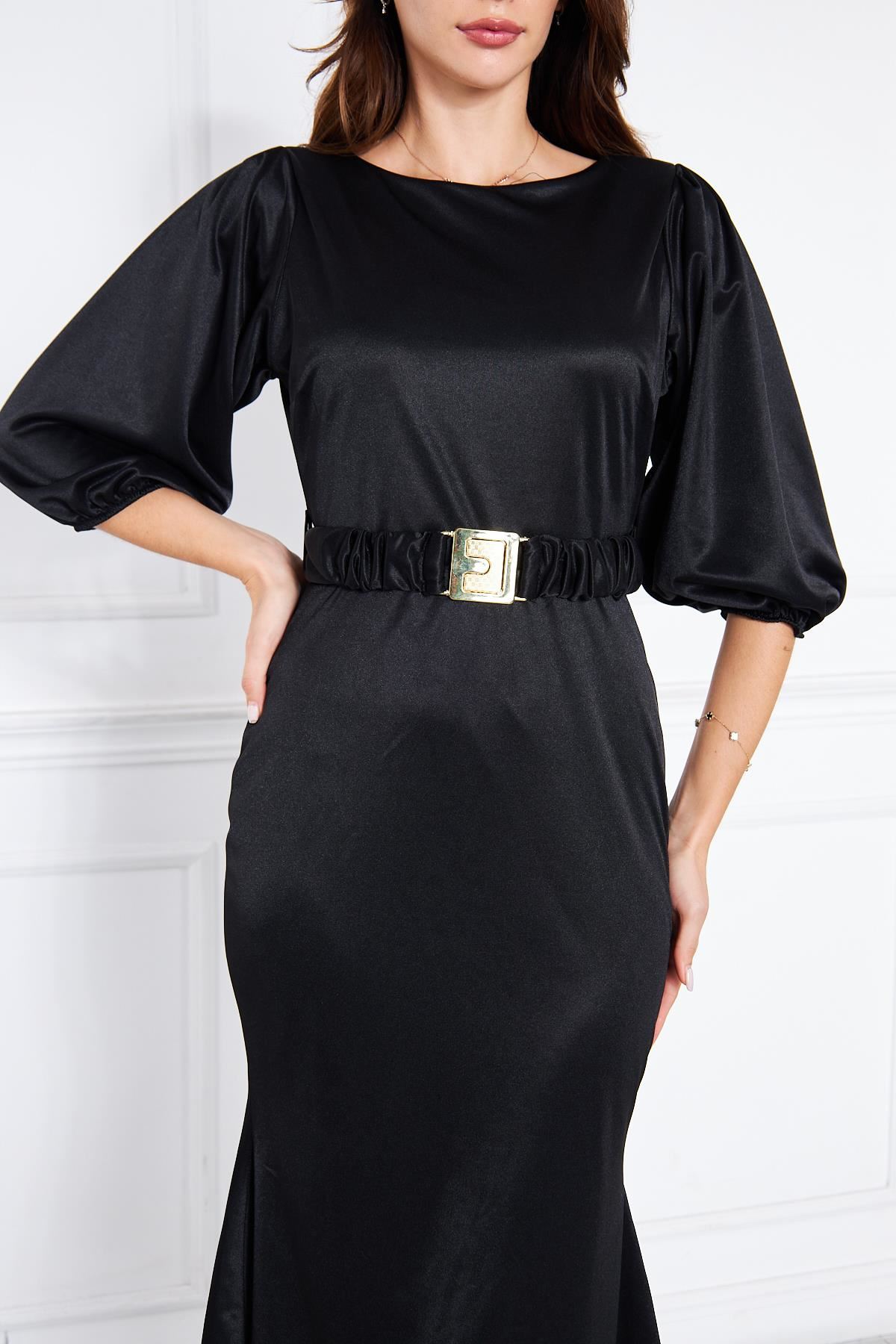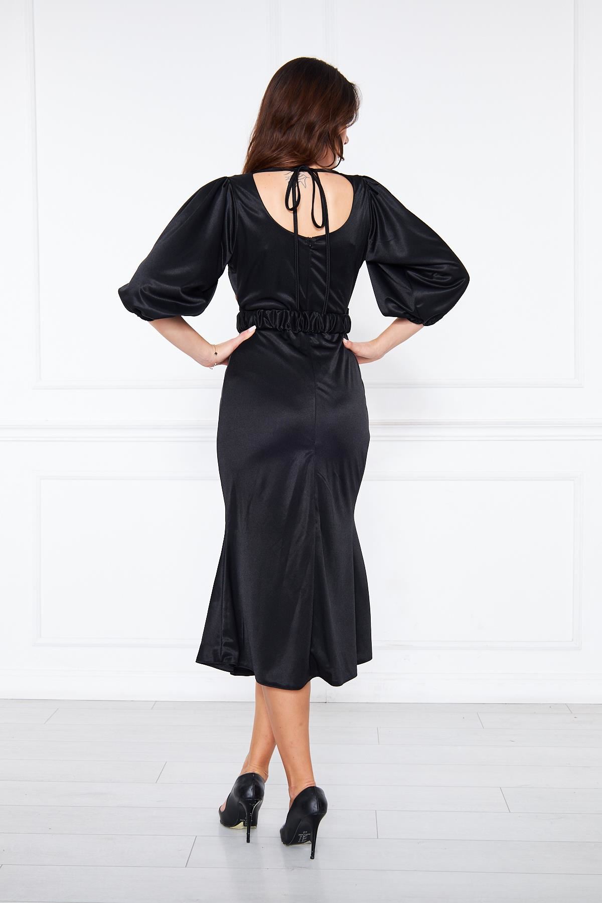 Arkası U Yakalı Lastik Kemerli Midi Boy Saten Abiye Elbise SİYAH