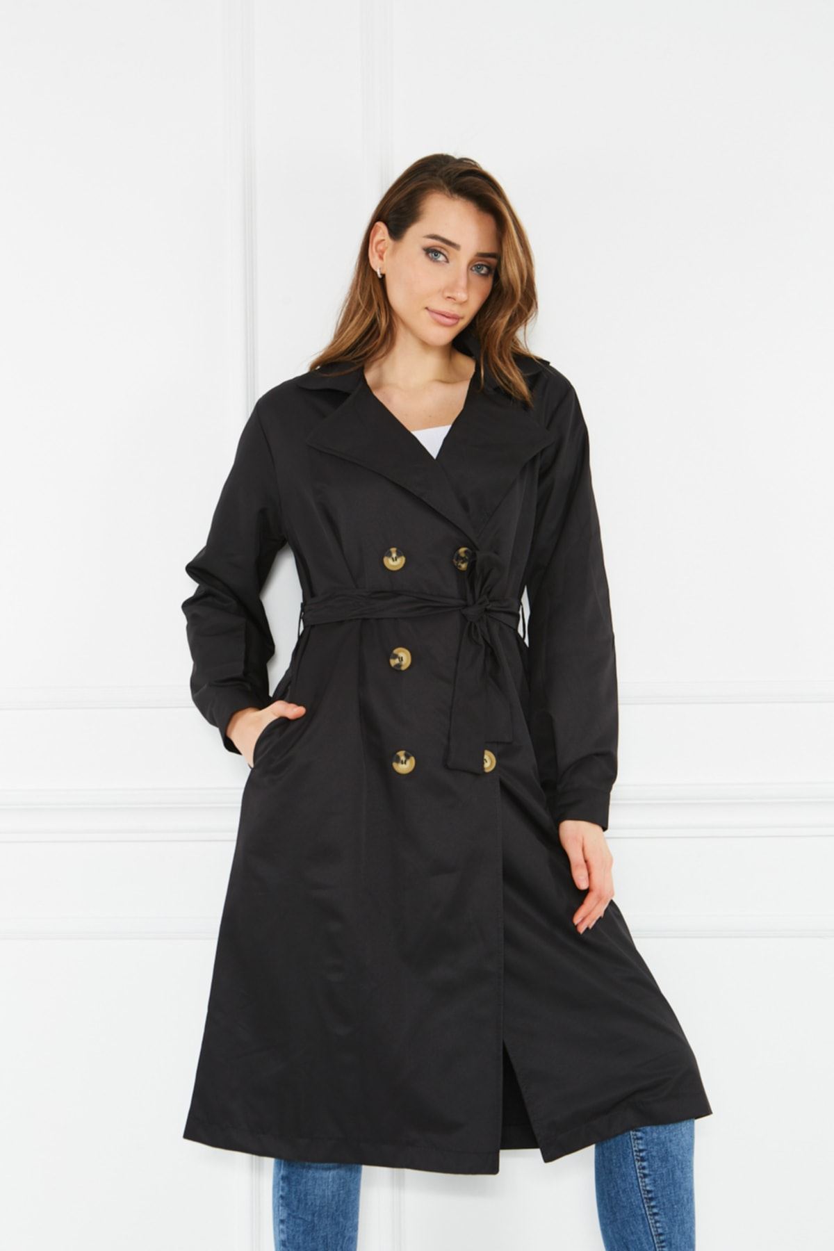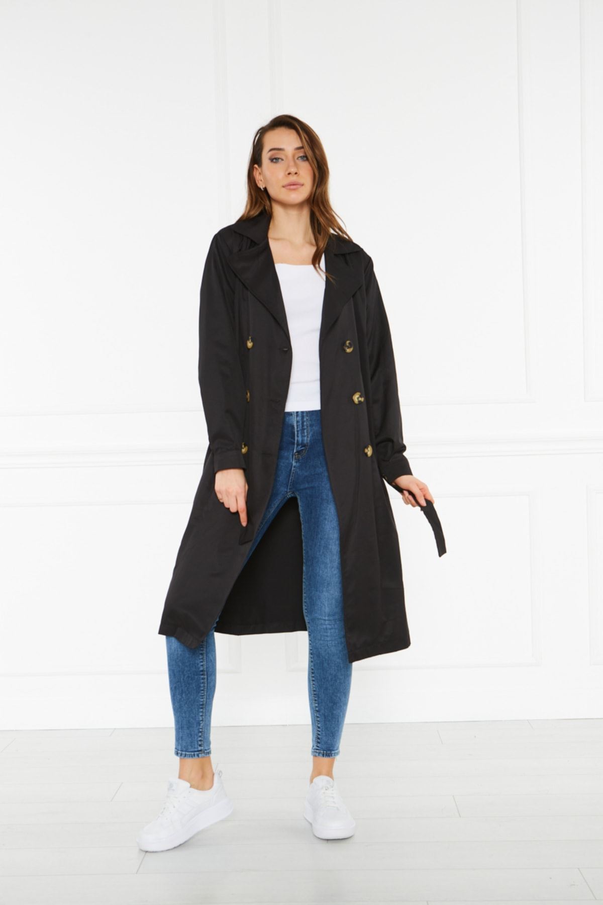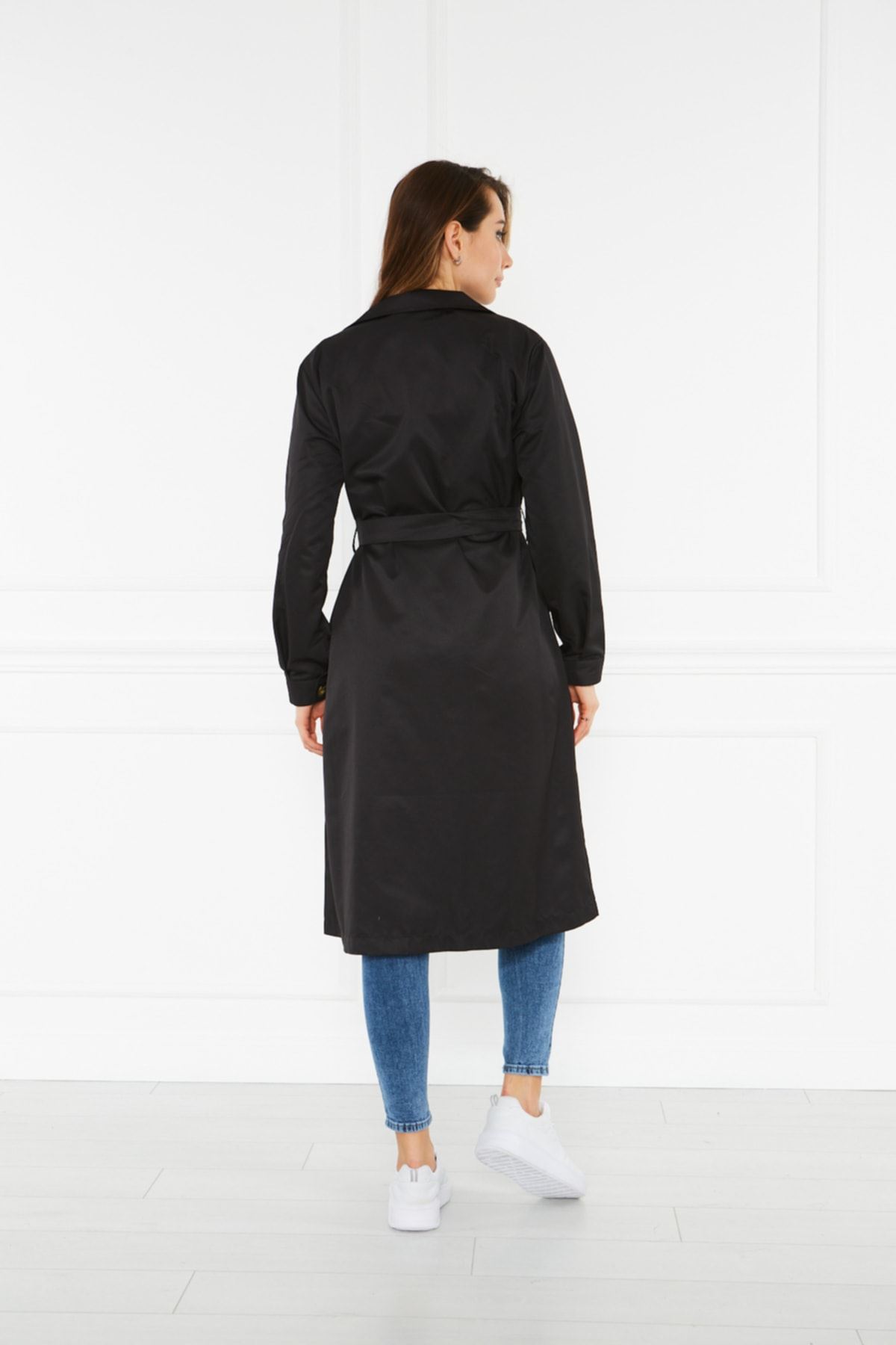 Astarsız Cepli Düğmeli Kuşaklı Yazlık Trenç SİYAH
