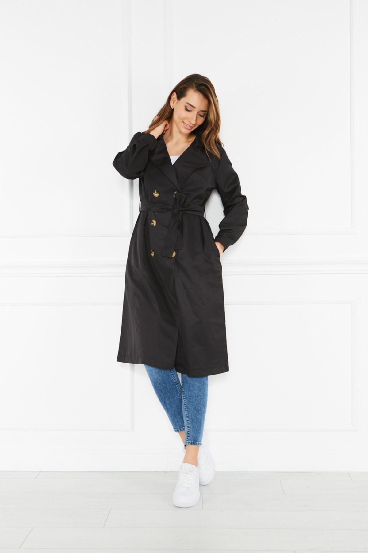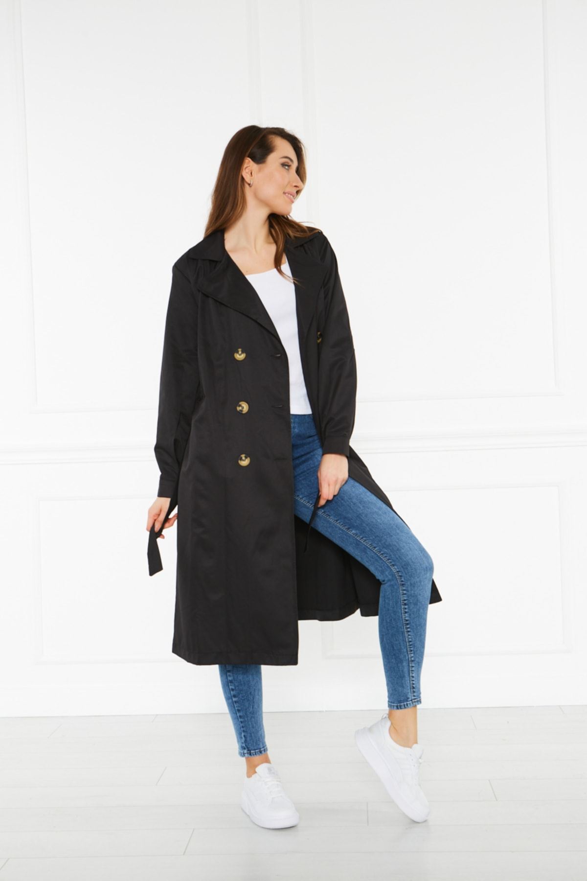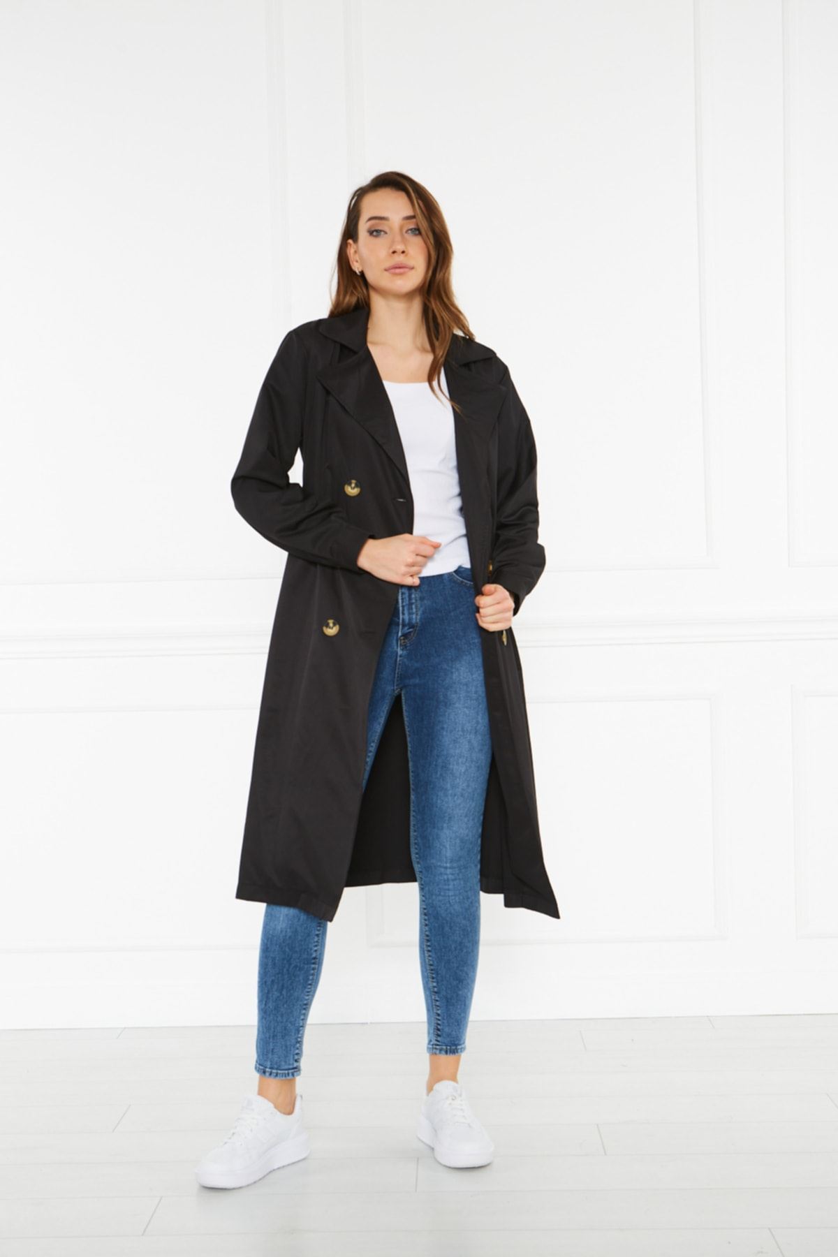 Astarsız Cepli Düğmeli Kuşaklı Yazlık Trenç SİYAH