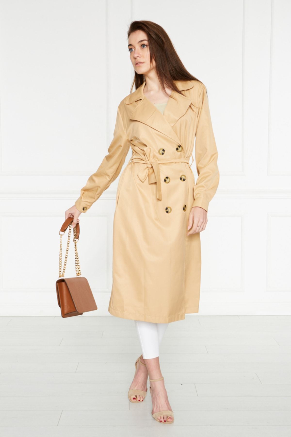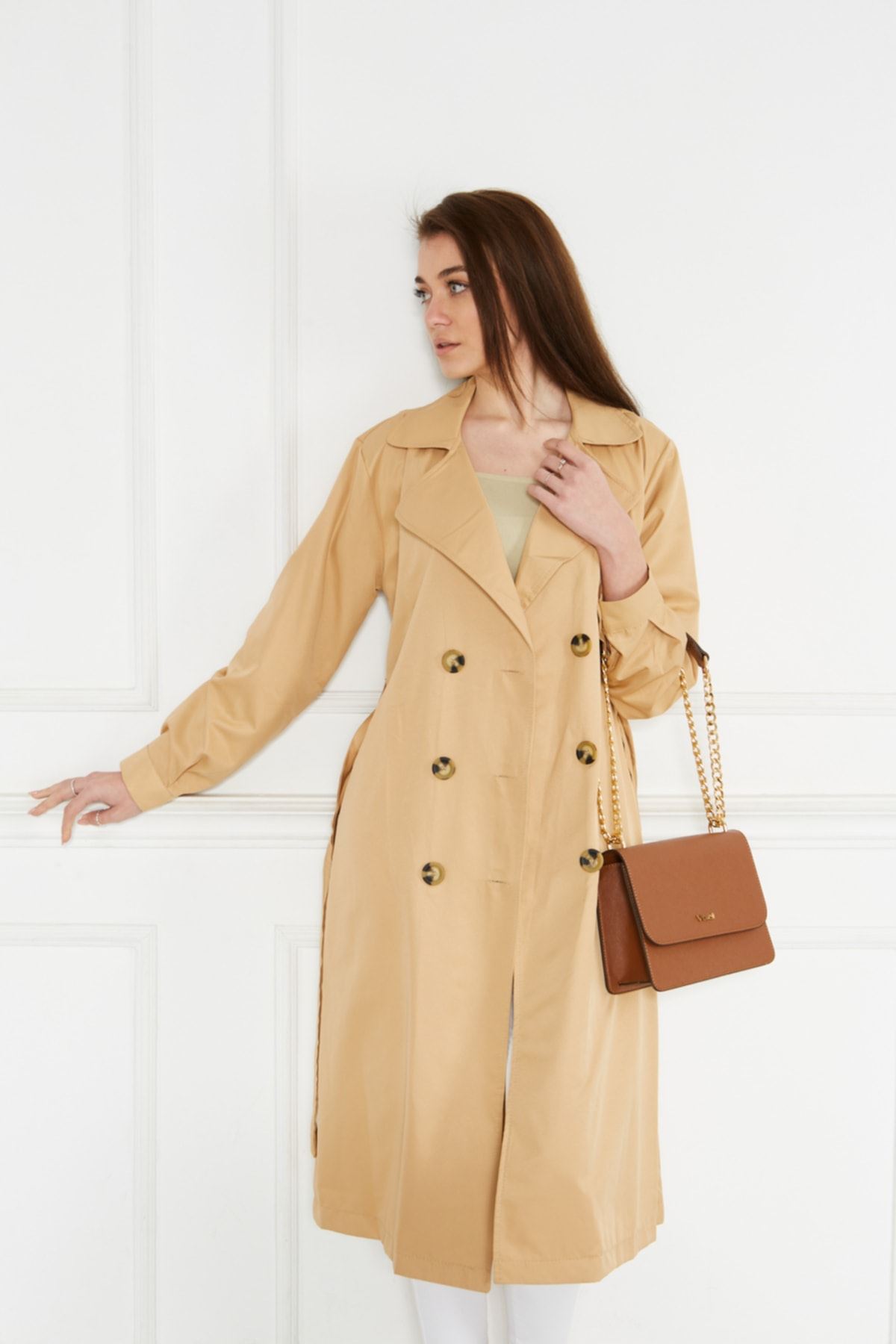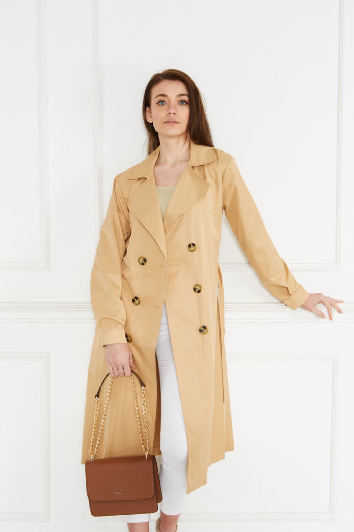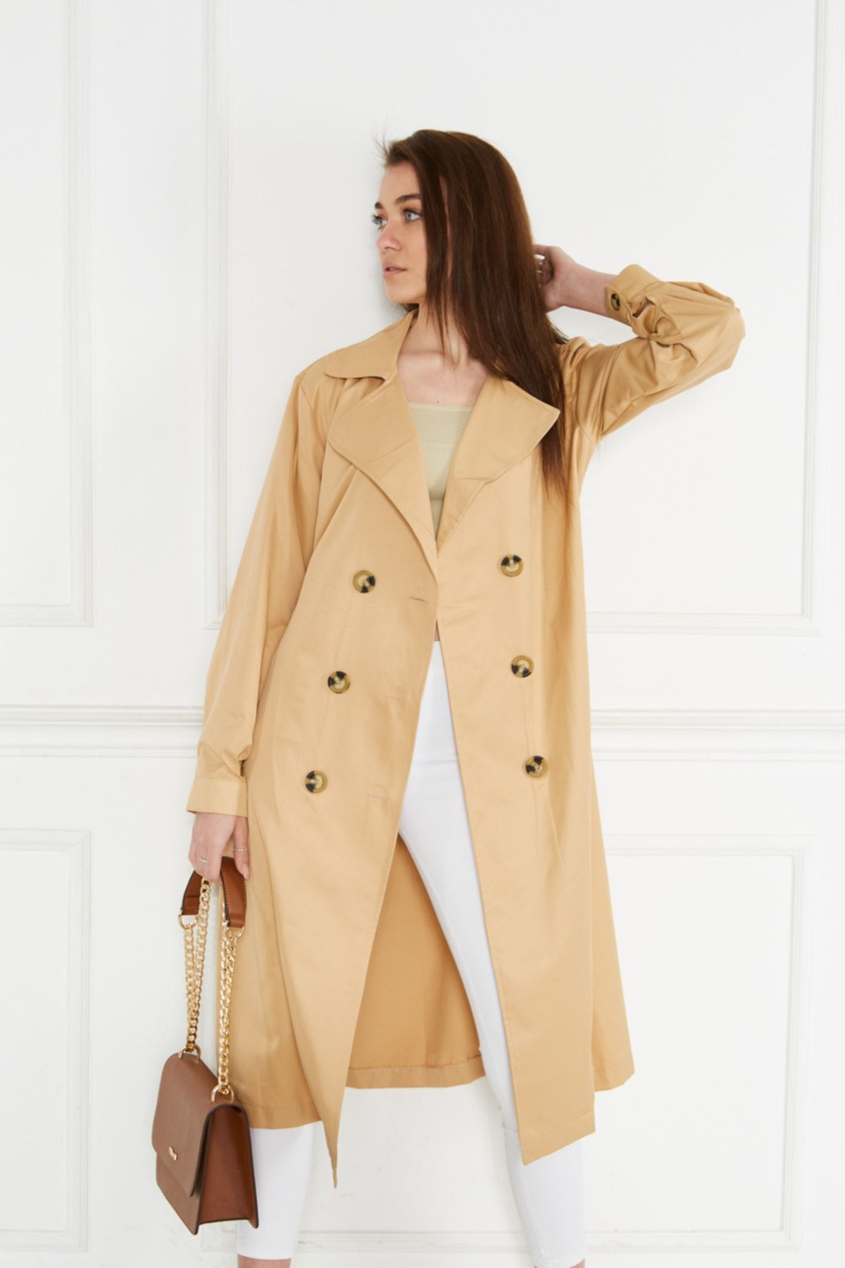 Astarsız Cepli Düğmeli Kuşaklı Yazlık Trenç Taba