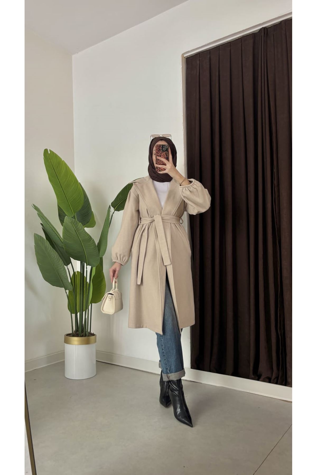 Balon Kol Kaşe Kaban Astarsız Belden Bağlamalı