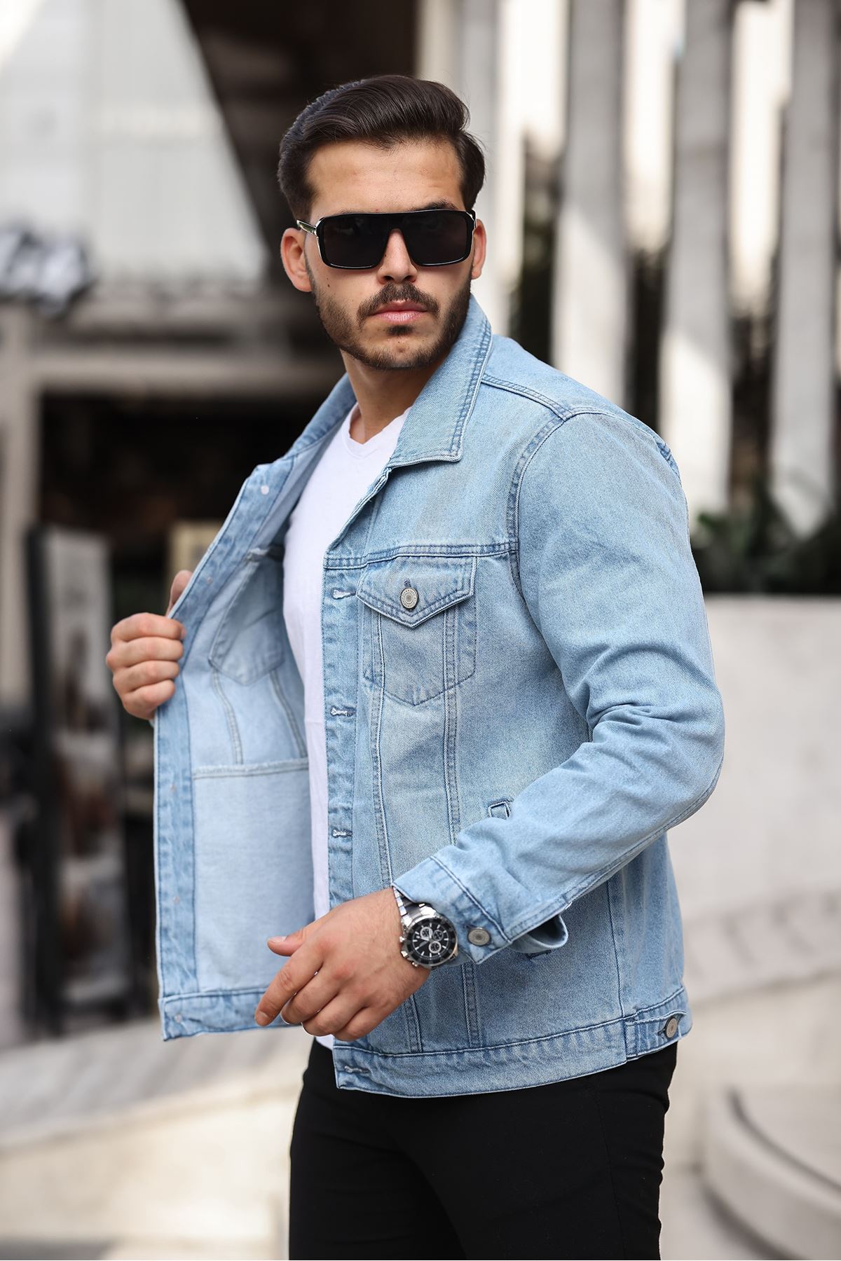 Erkek A Kalite Slim Fit Denim Kot Ceket BUZ MAVİ