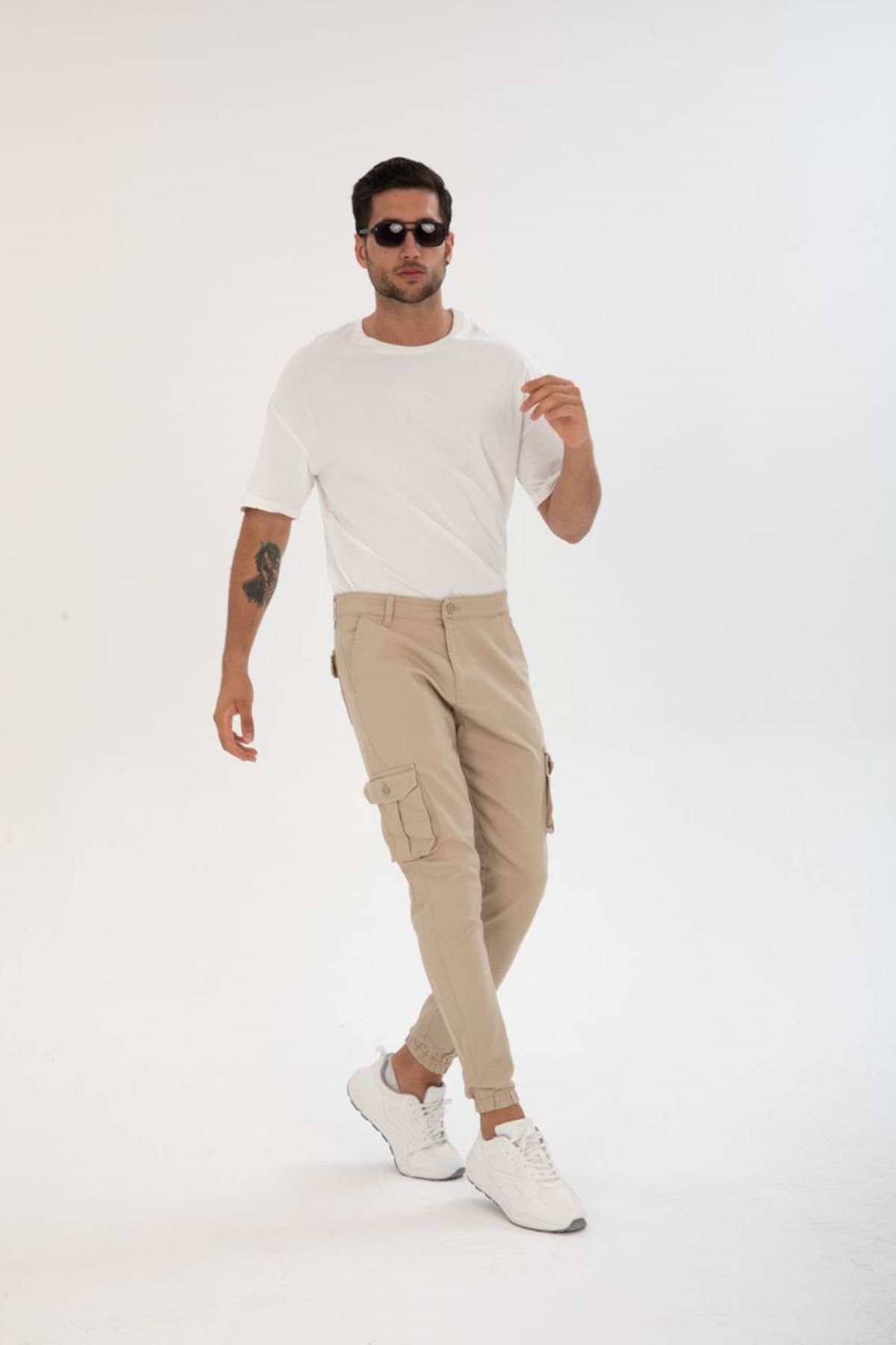 ERKEK BEL KEMERLİ KÖRÜKLÜ JOGGER PAÇA LASTİKLİ PANTOLON BEJ