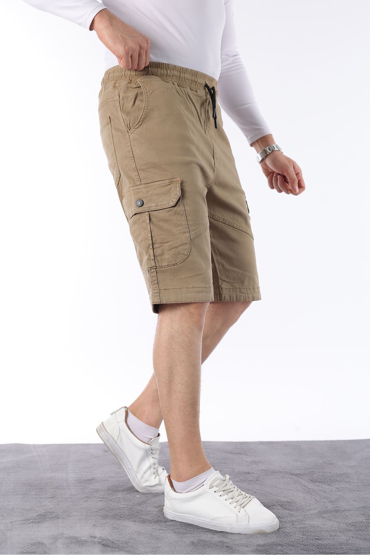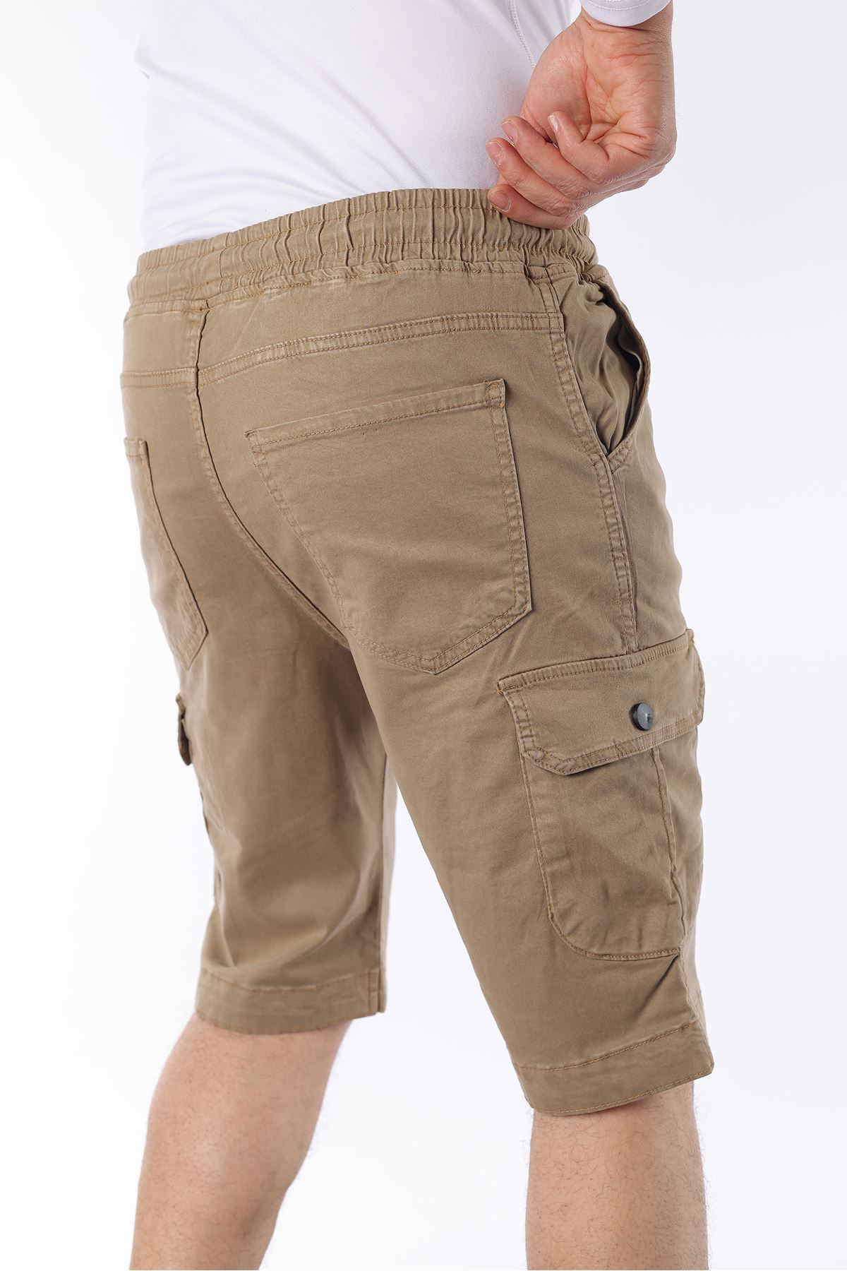 Erkek Beli Lastikli Dikiş Detaylı Kargo Cep Kapri Şort VİZON
