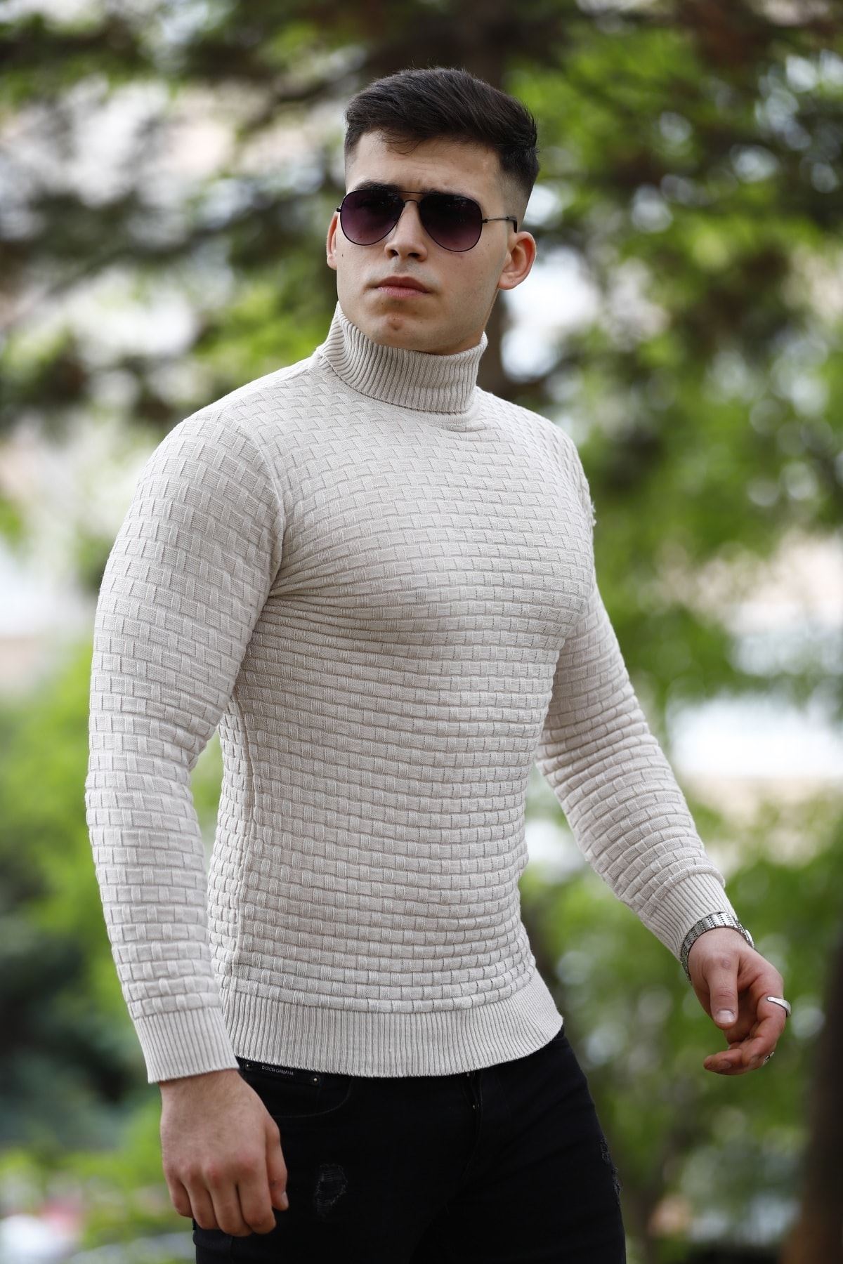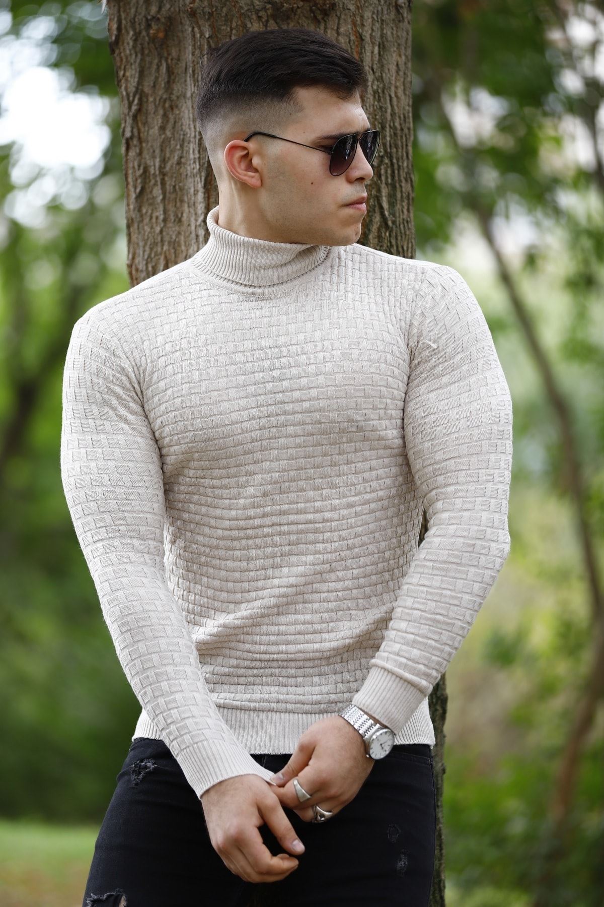 Erkek Desenli Günlük Balıkçı Yaka Vizon Triko Kazak