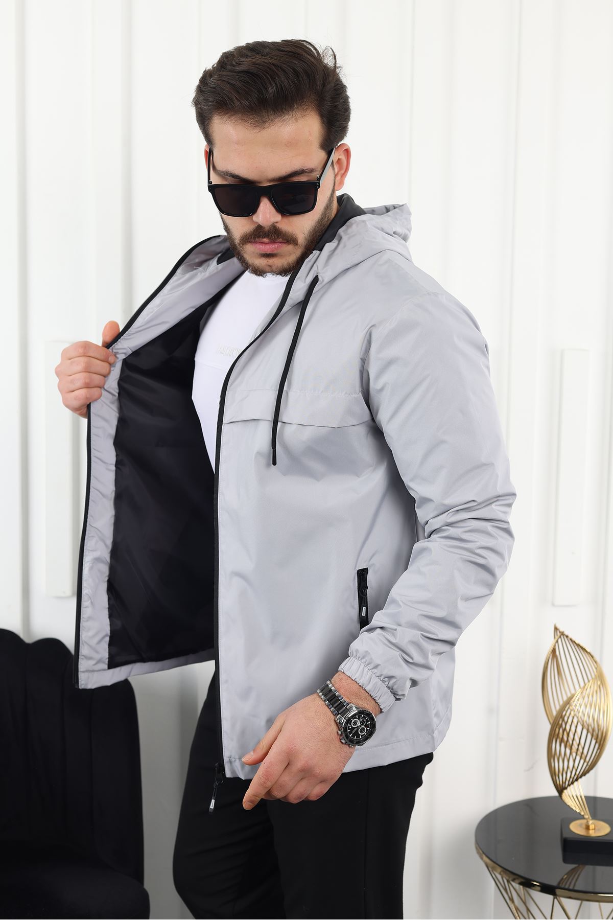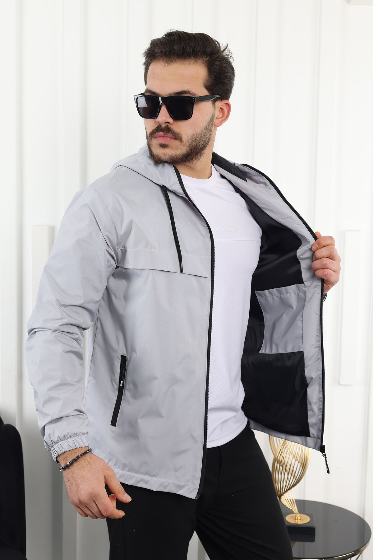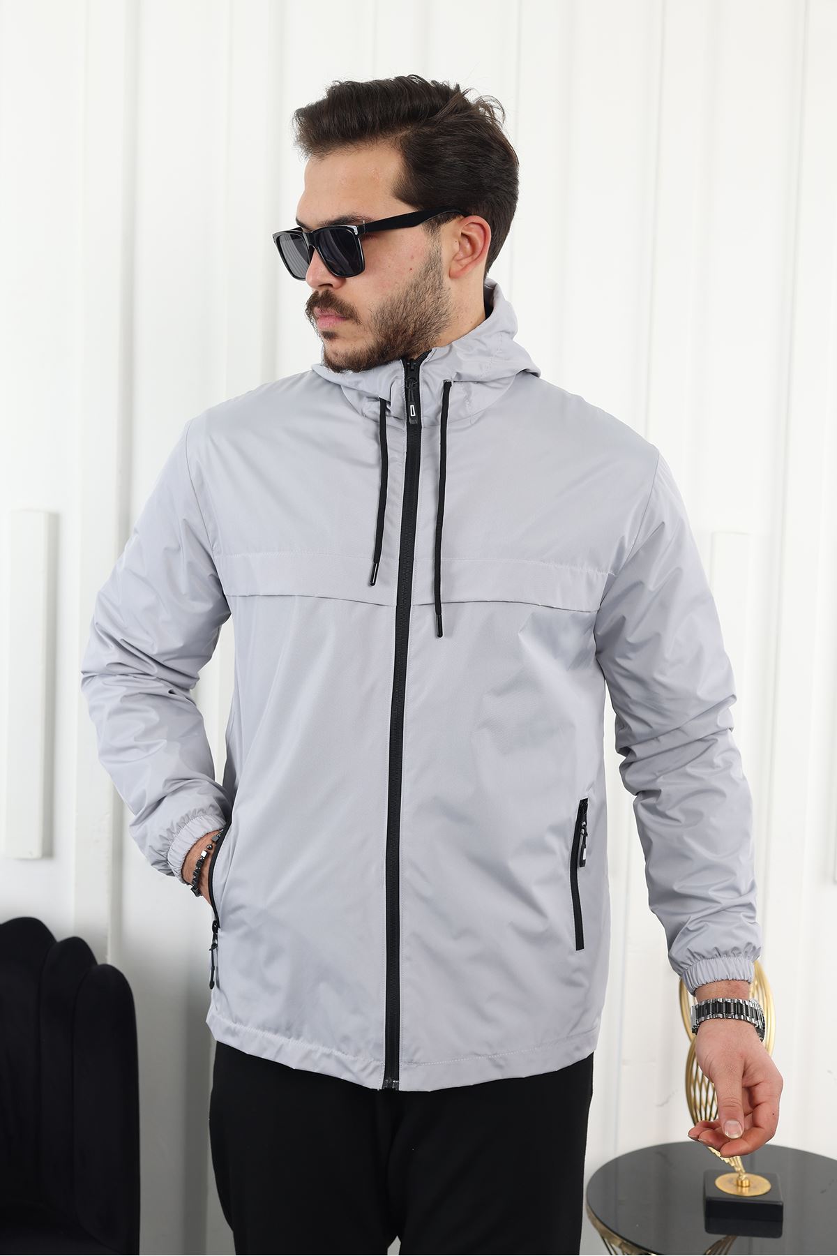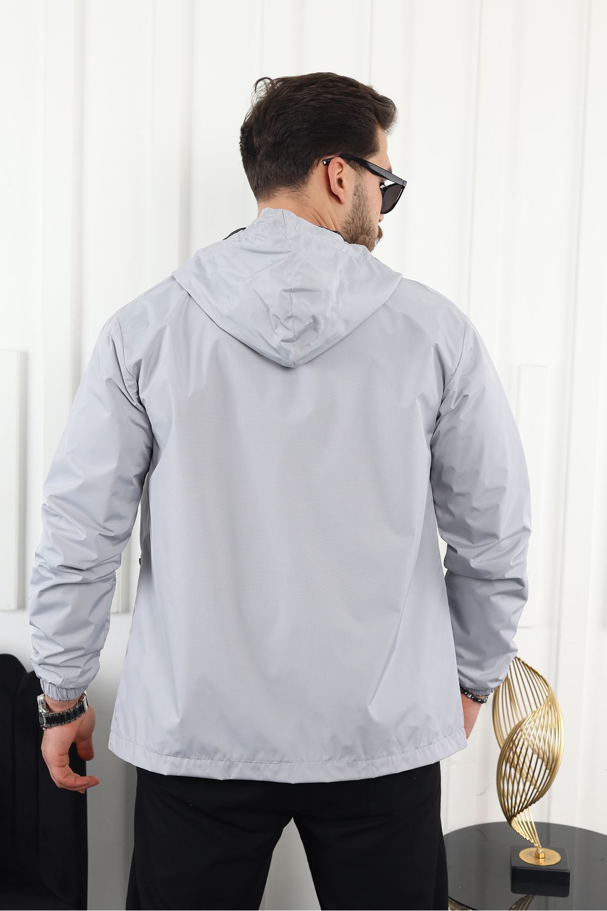 Erkek Içi Astarlı Suya Dayanıklı Kapüşonlu Cepli Yağmurluk A.GRİ