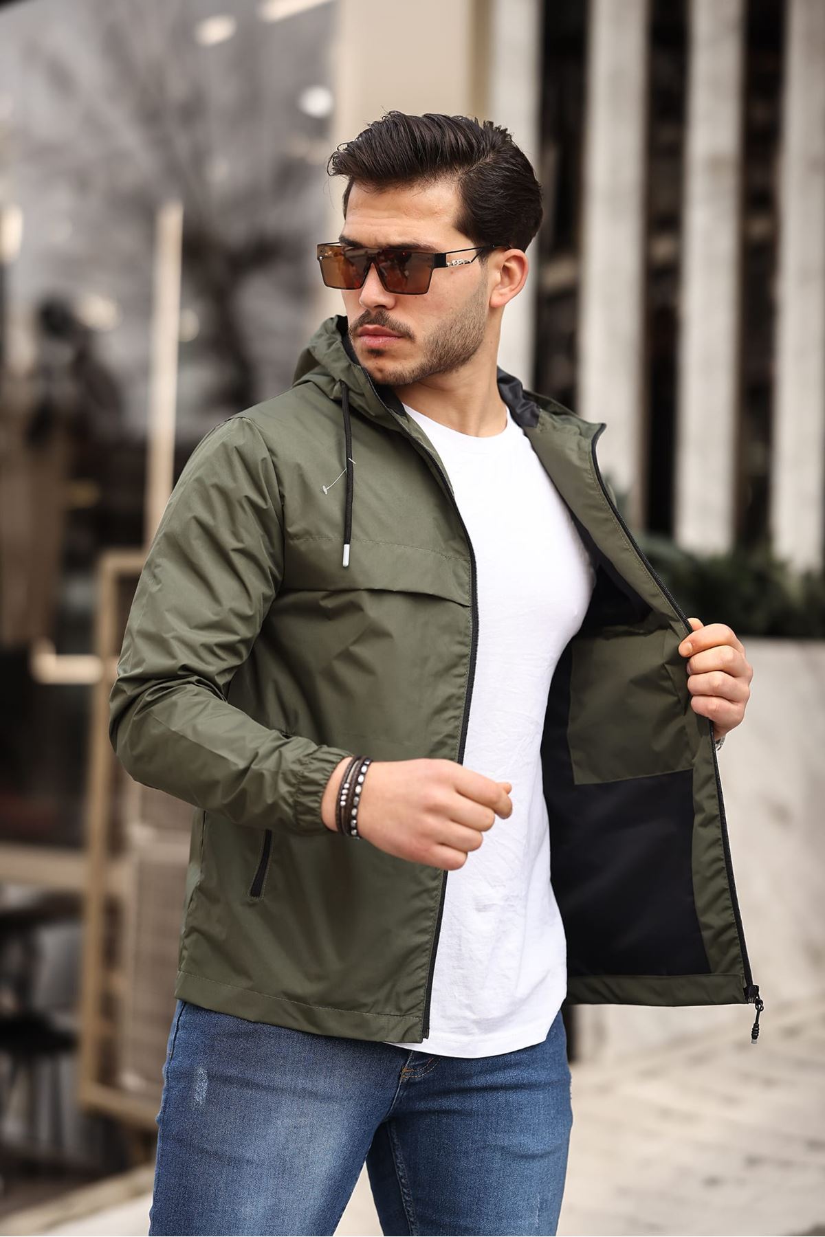Erkek Içi Astarlı Suya Dayanıklı Kapüşonlu Cepli Yağmurluk HAKİ