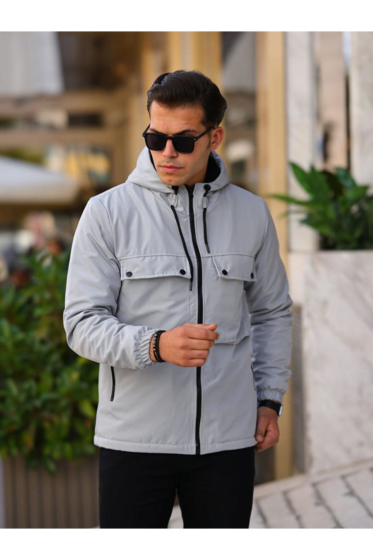 Erkek Içi Astarlı Suya Dayanıklı Kapüşonlu Cepli Yağmurluk A.GRİ