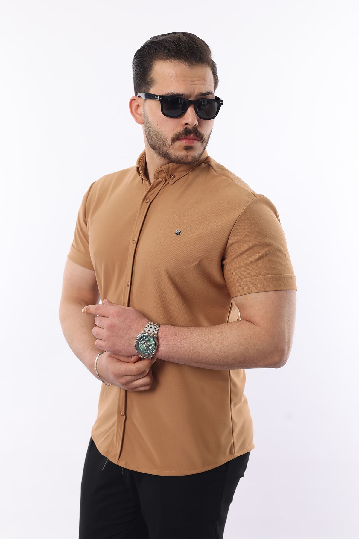 Erkek Kısa Kollu Slim Fit Yazlık Basic Şık Gömlek CAMEL