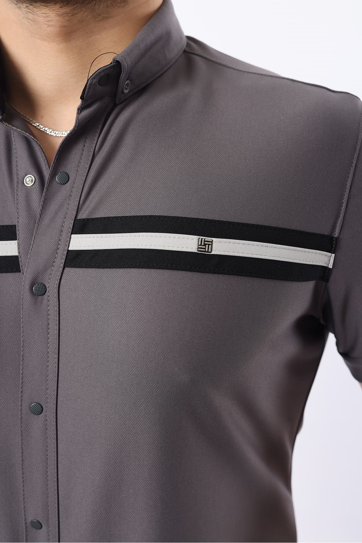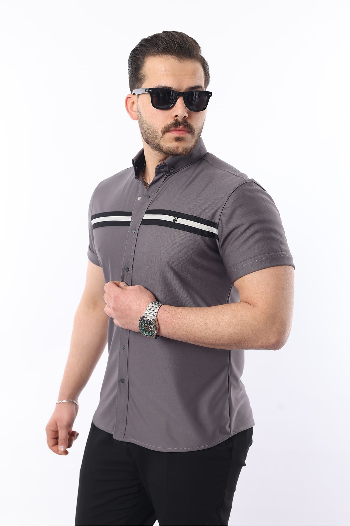 Erkek Kısa Kollu Slim Fit Yazlık Çift Çizgili Gömlek Antrasit