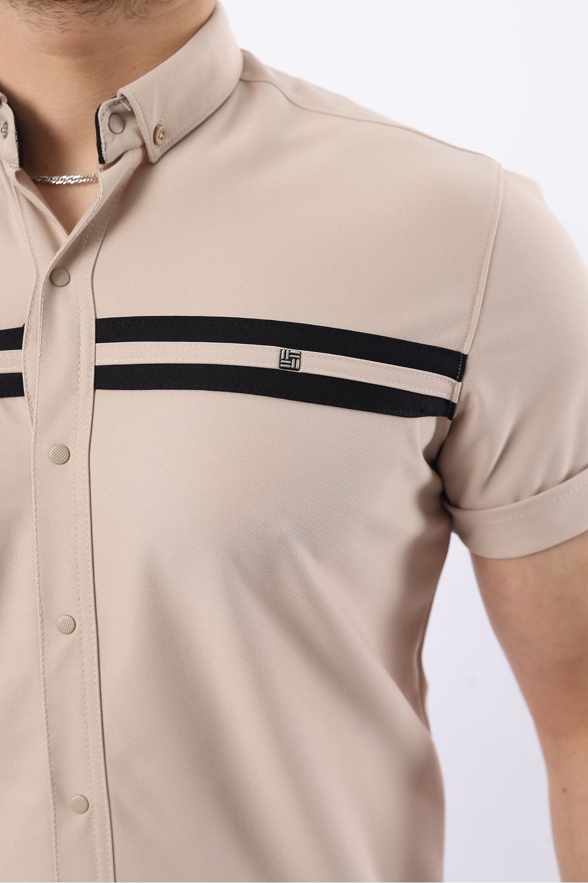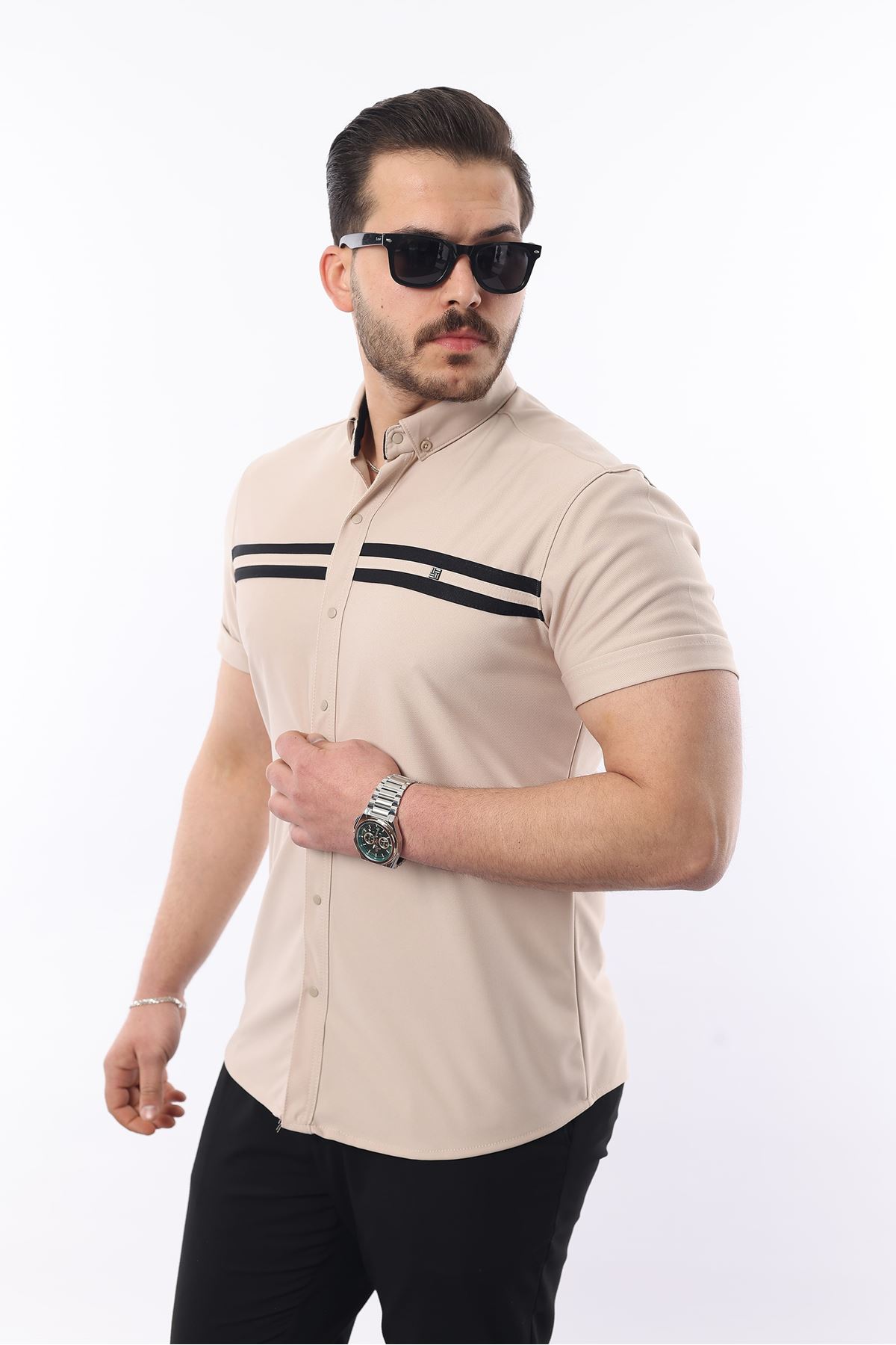 Erkek Kısa Kollu Slim Fit Yazlık Çift Çizgili Gömlek BEJ