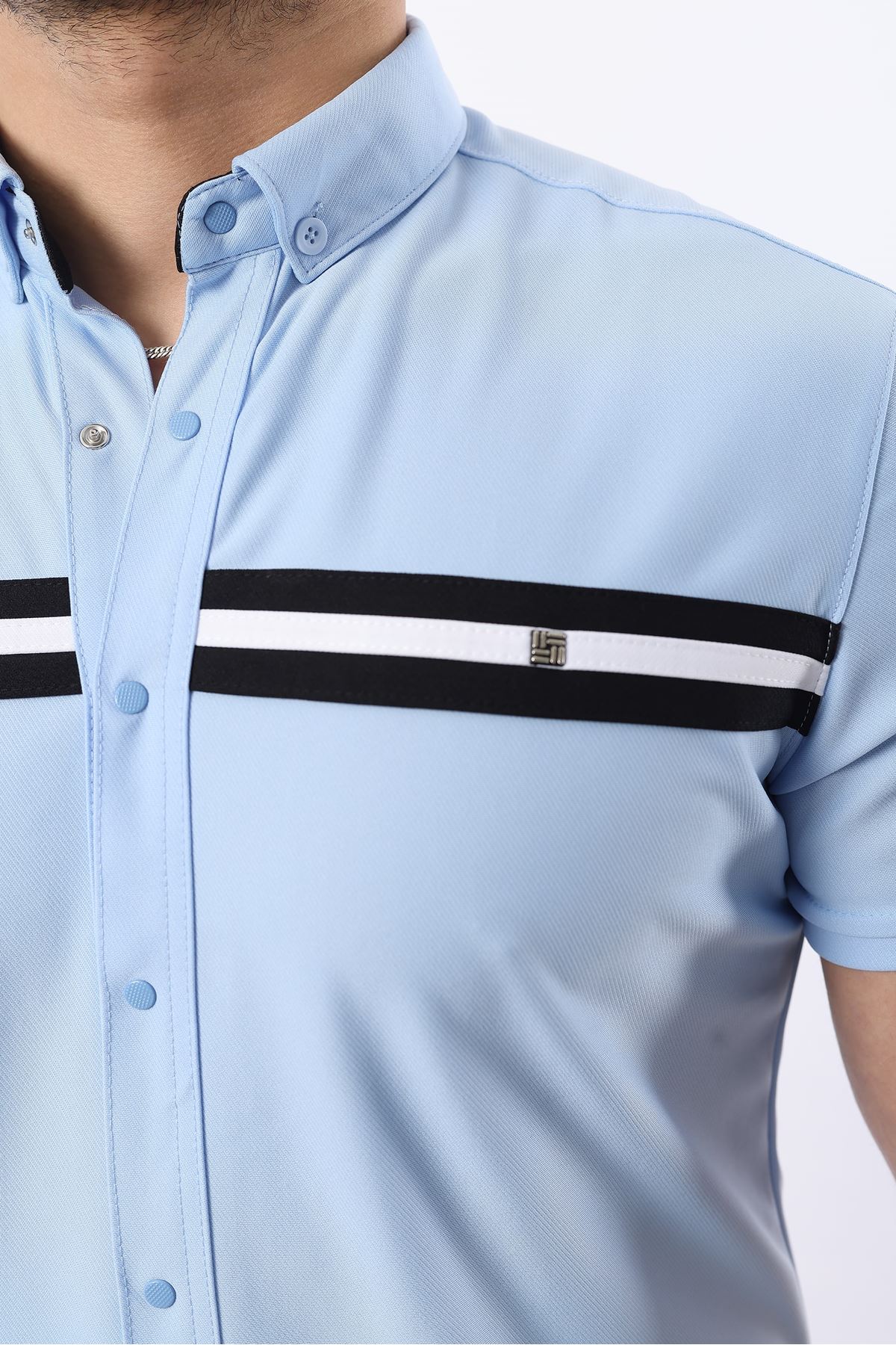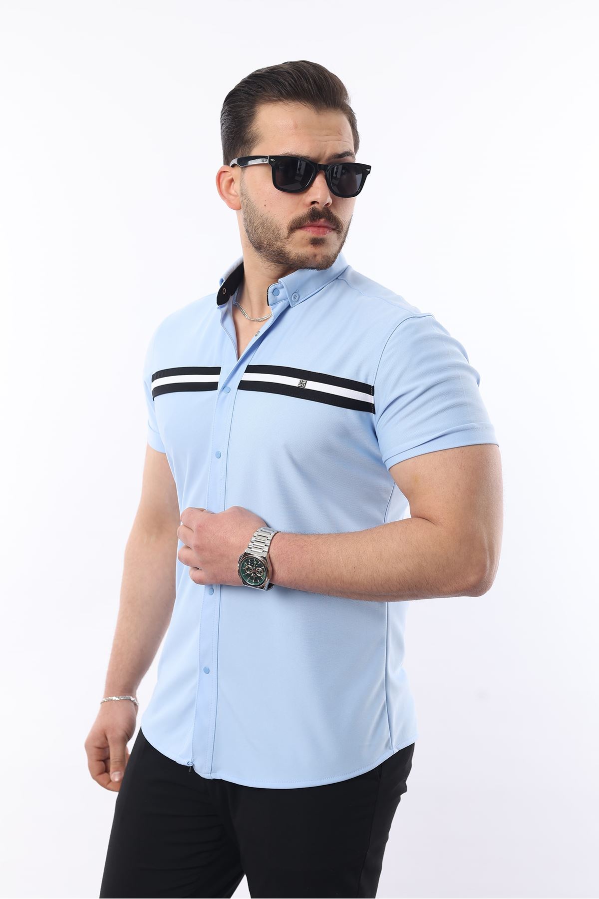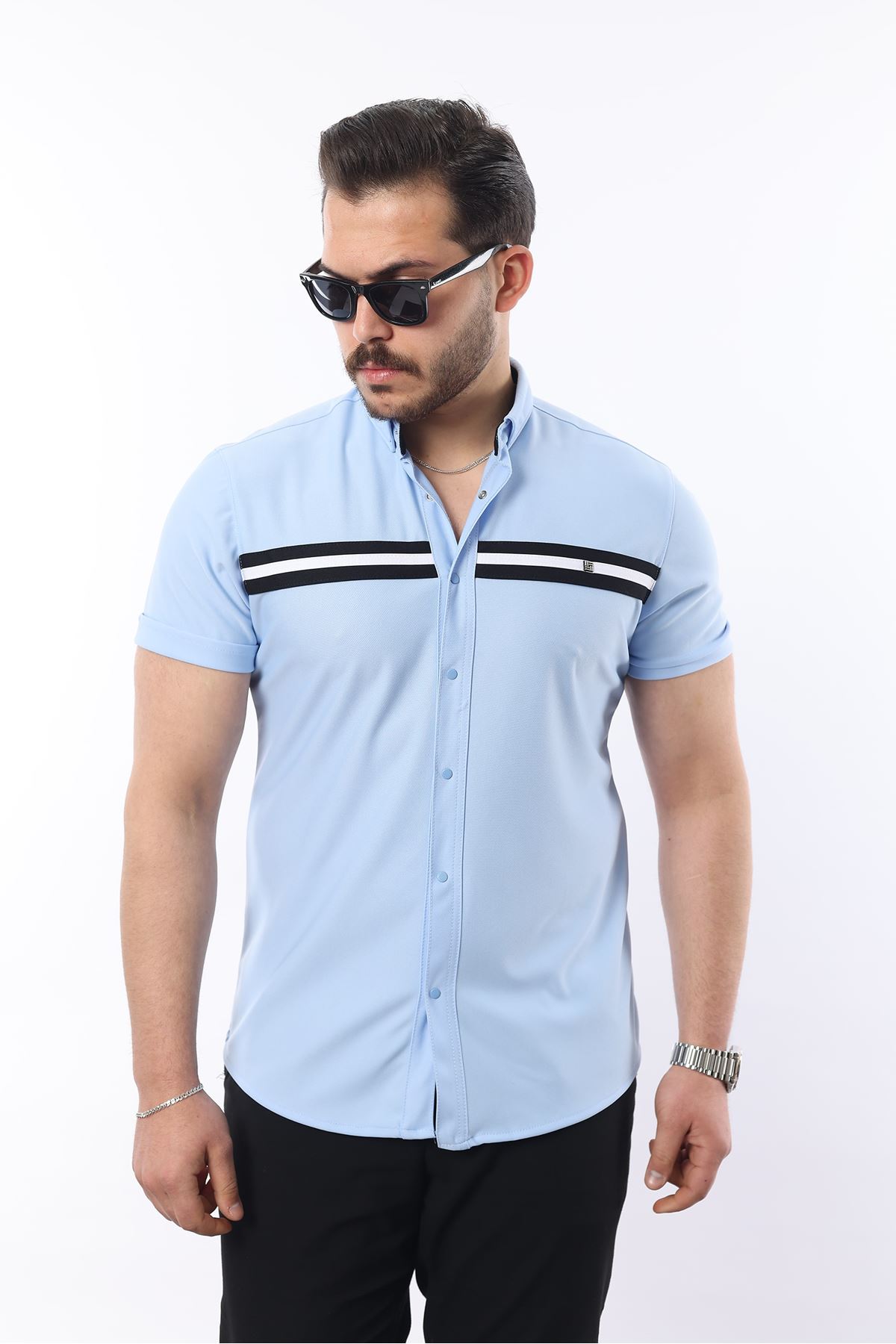Erkek Kısa Kollu Slim Fit Yazlık Çift Çizgili Gömlek MAVİ