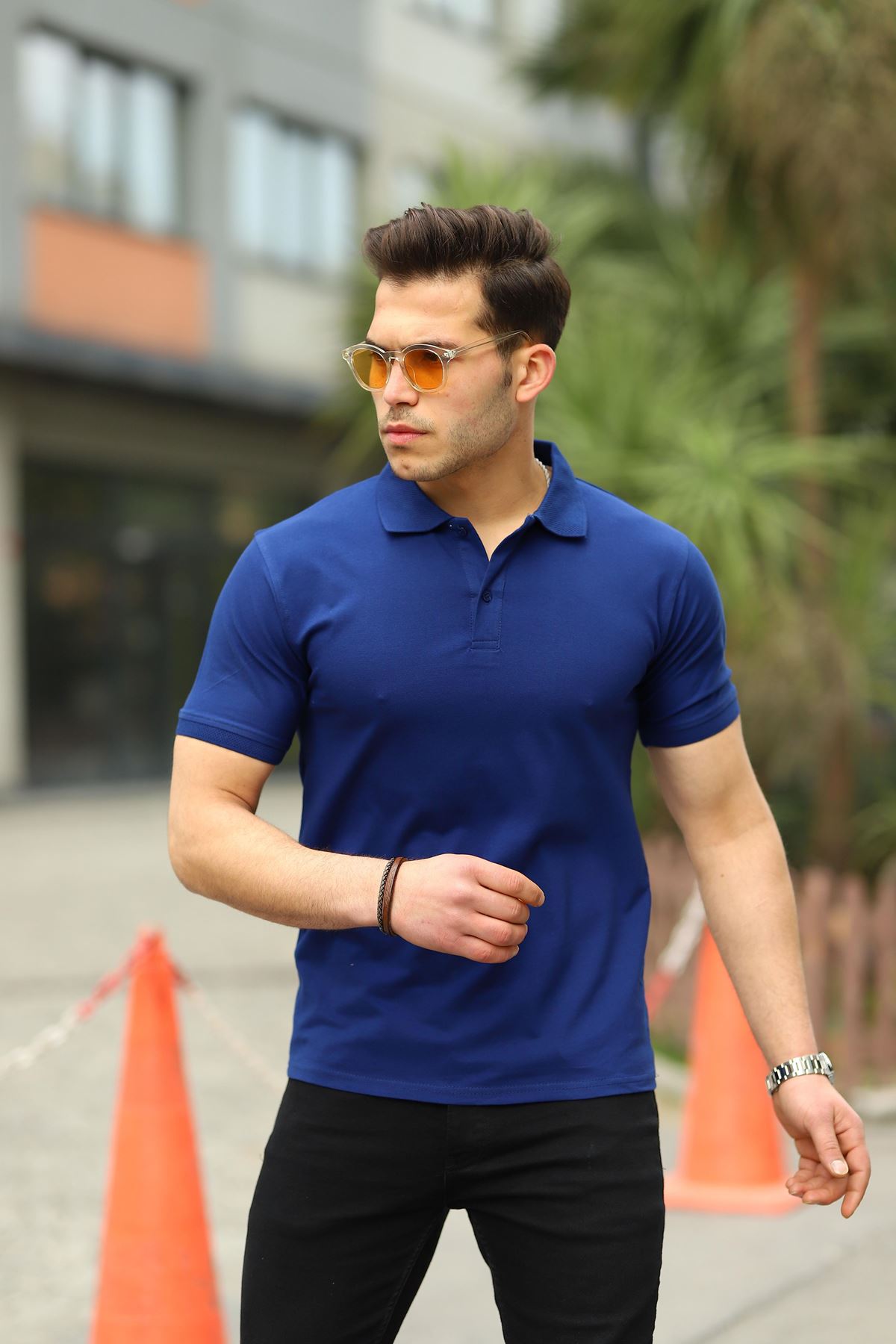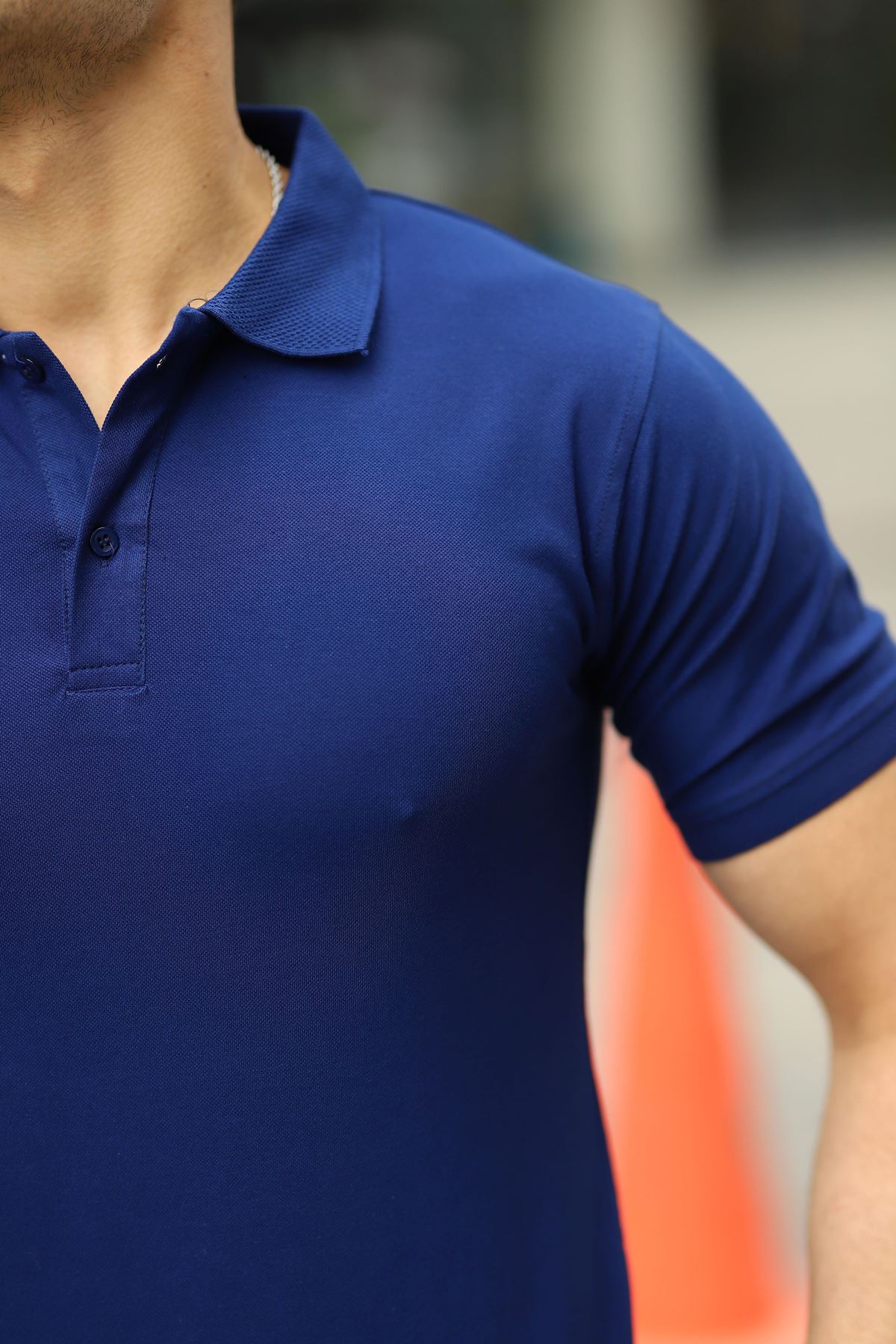 Erkek Kıvrılmaz Polo Yaka Cepsiz Slim Fit Dar Kesim Düz T-Shirt LACİVERT