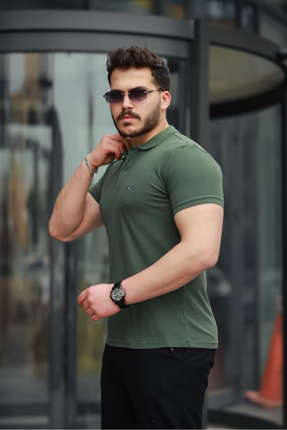 Erkek Kıvrılmaz Polo Yaka Cepsiz Slim Fit Dar Kesim T-Shirt HAKİ