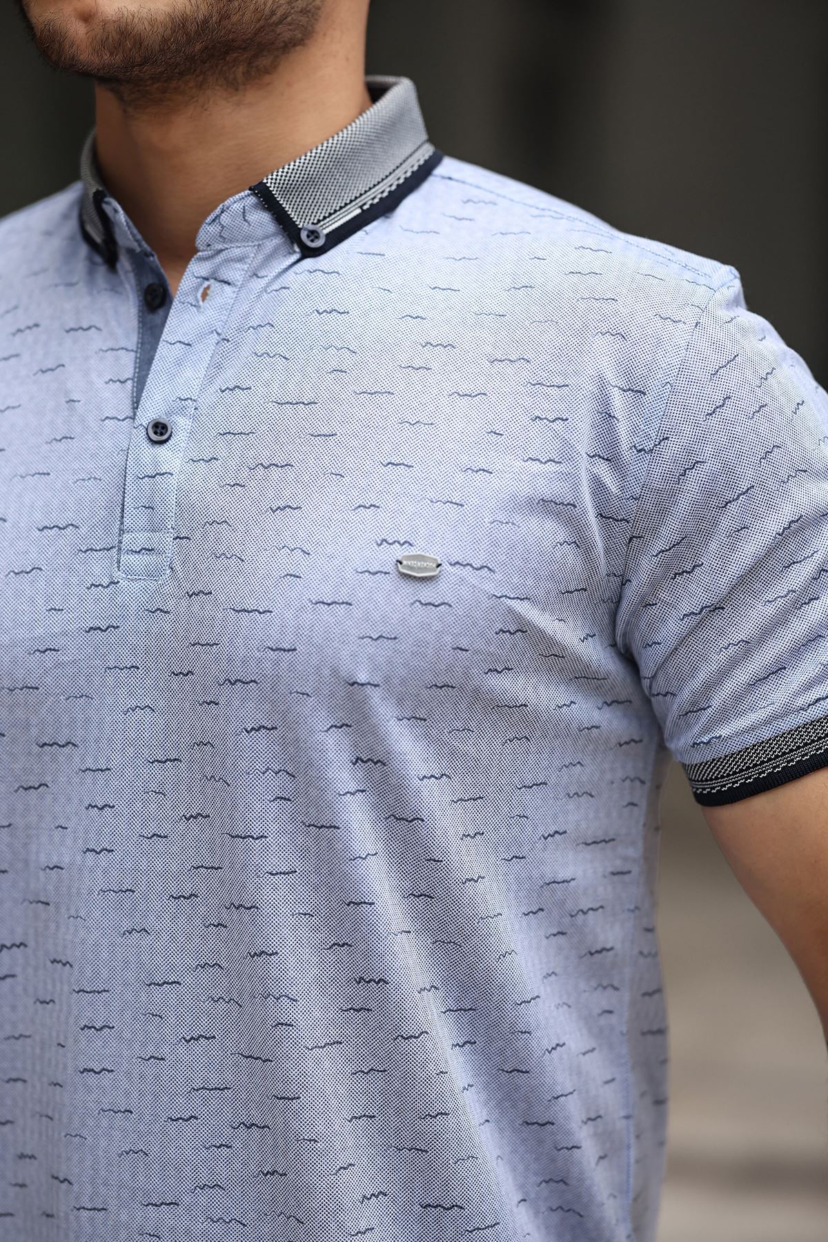 Erkek Kıvrılmaz Polo Yaka Cepsiz Slim Fit Desenli T-Shirt BUZ MAVİ