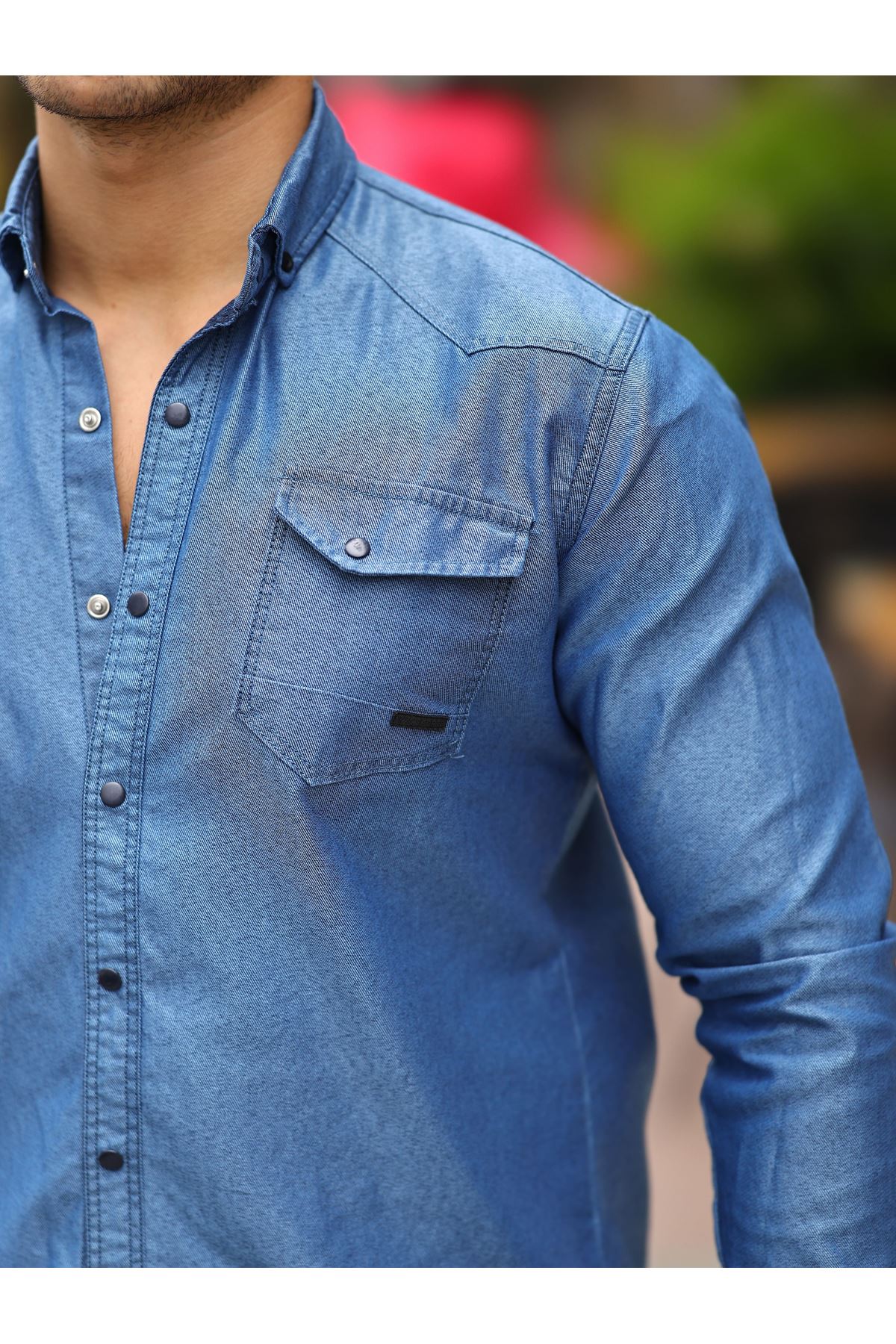 Erkek Slim Fit Çift Cepli Kot Gömlek LACİVERT