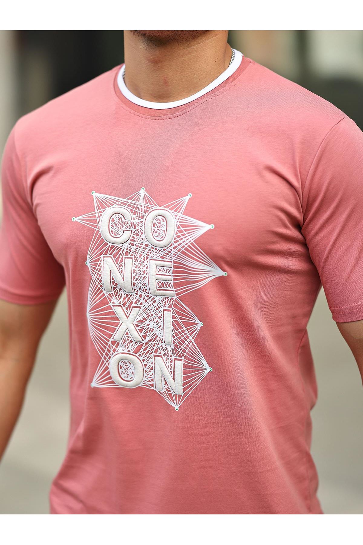 Erkek Slim Fit Nakış Desenli T-Shirt GÜL KURUSU