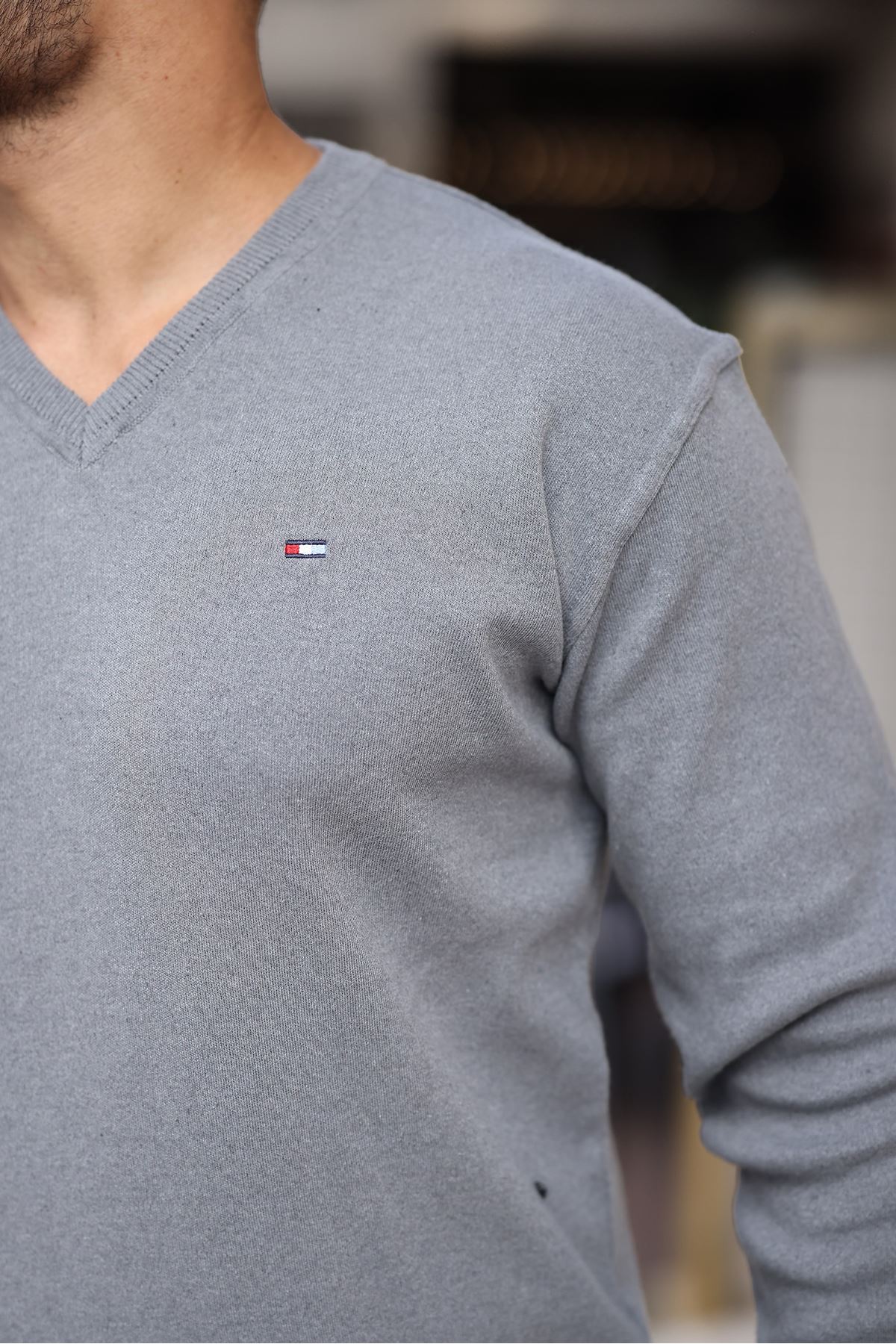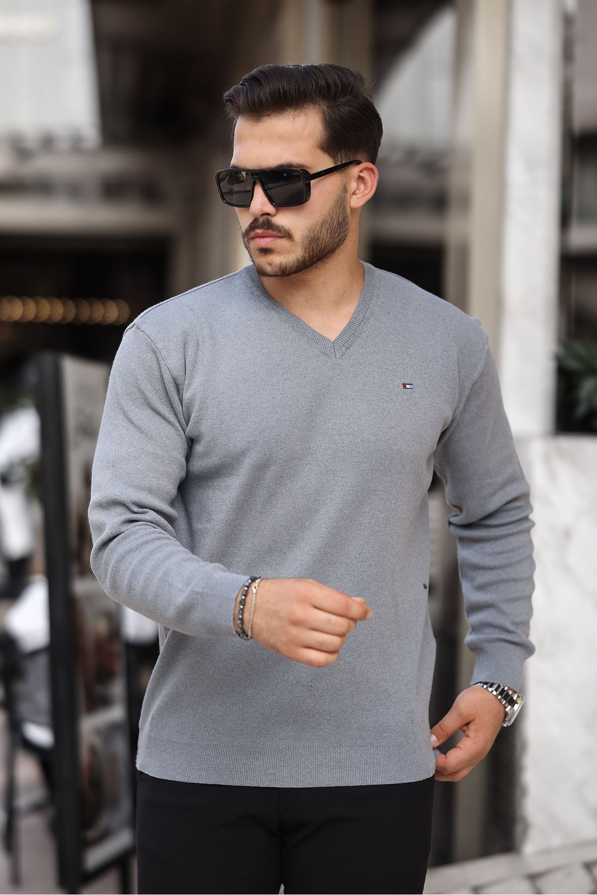 Erkek V Yaka Pamuklu Triko Kazak GRİ