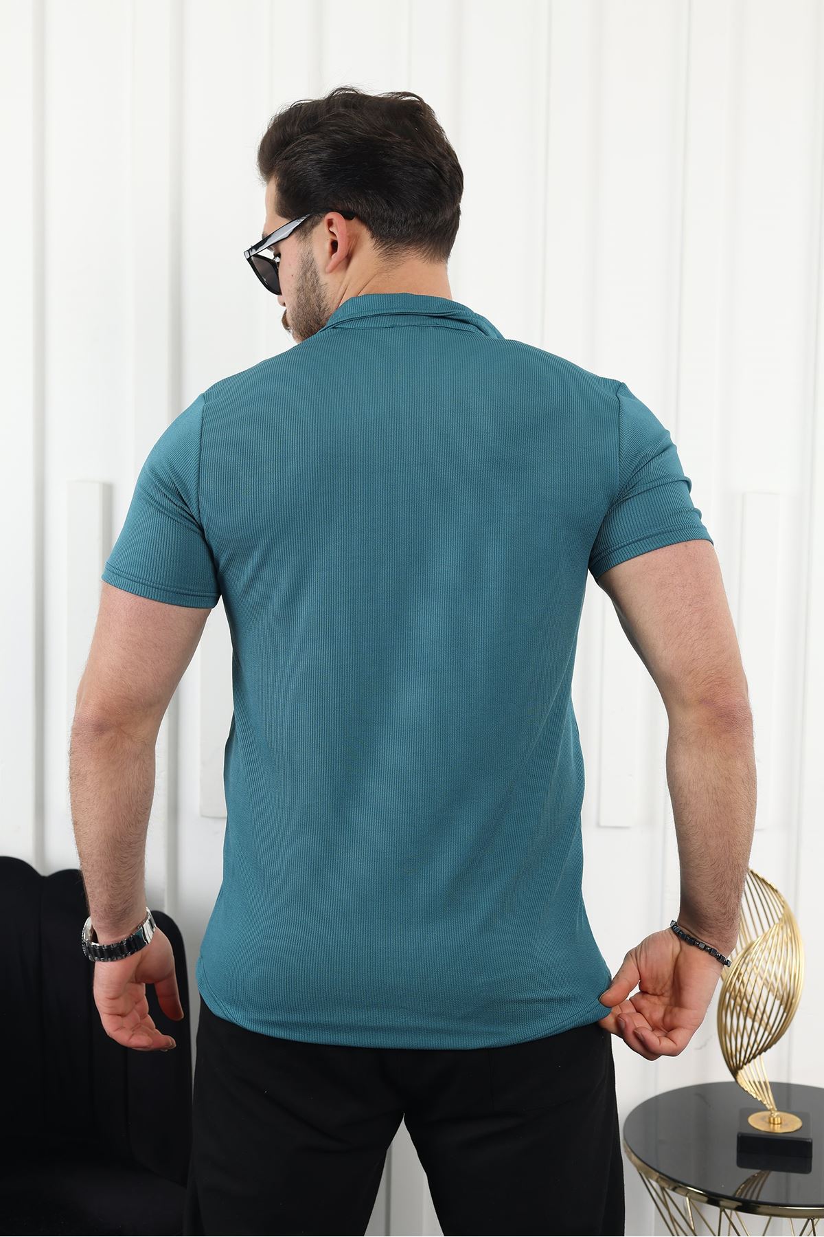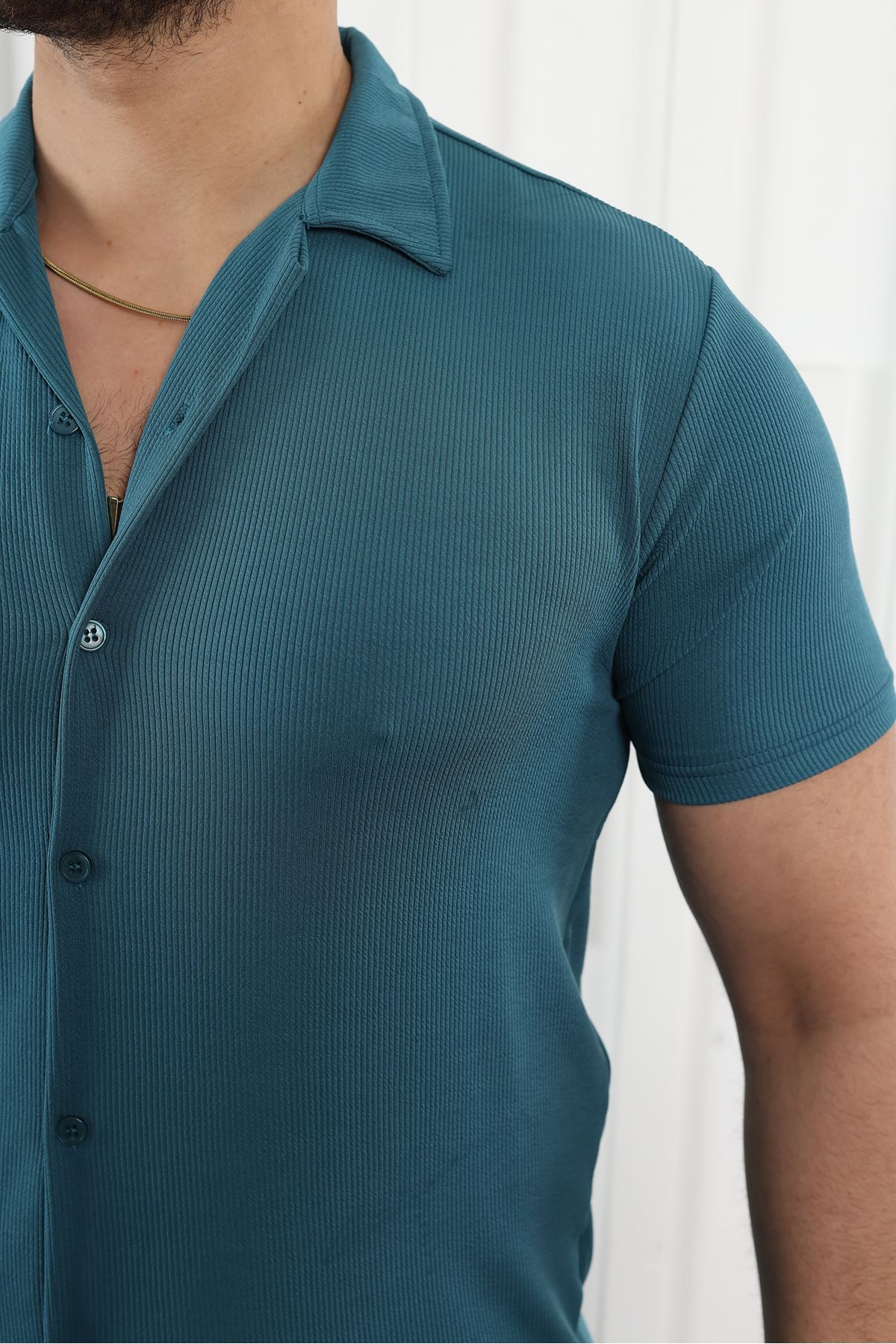 Erkek Yazlık Likralı Slim Fit Gömlek Yaka Kısa Kollu Gömlek PETROL