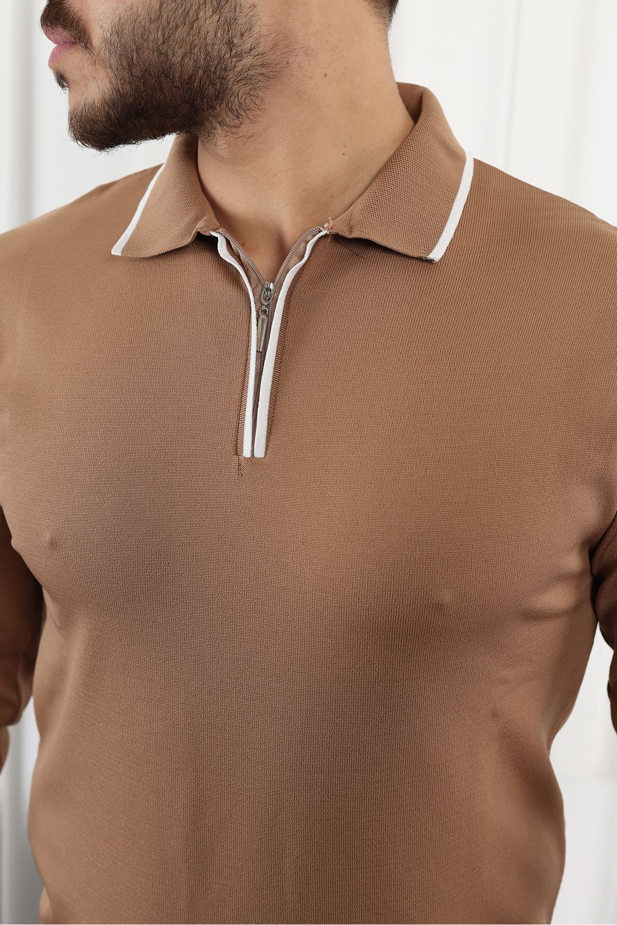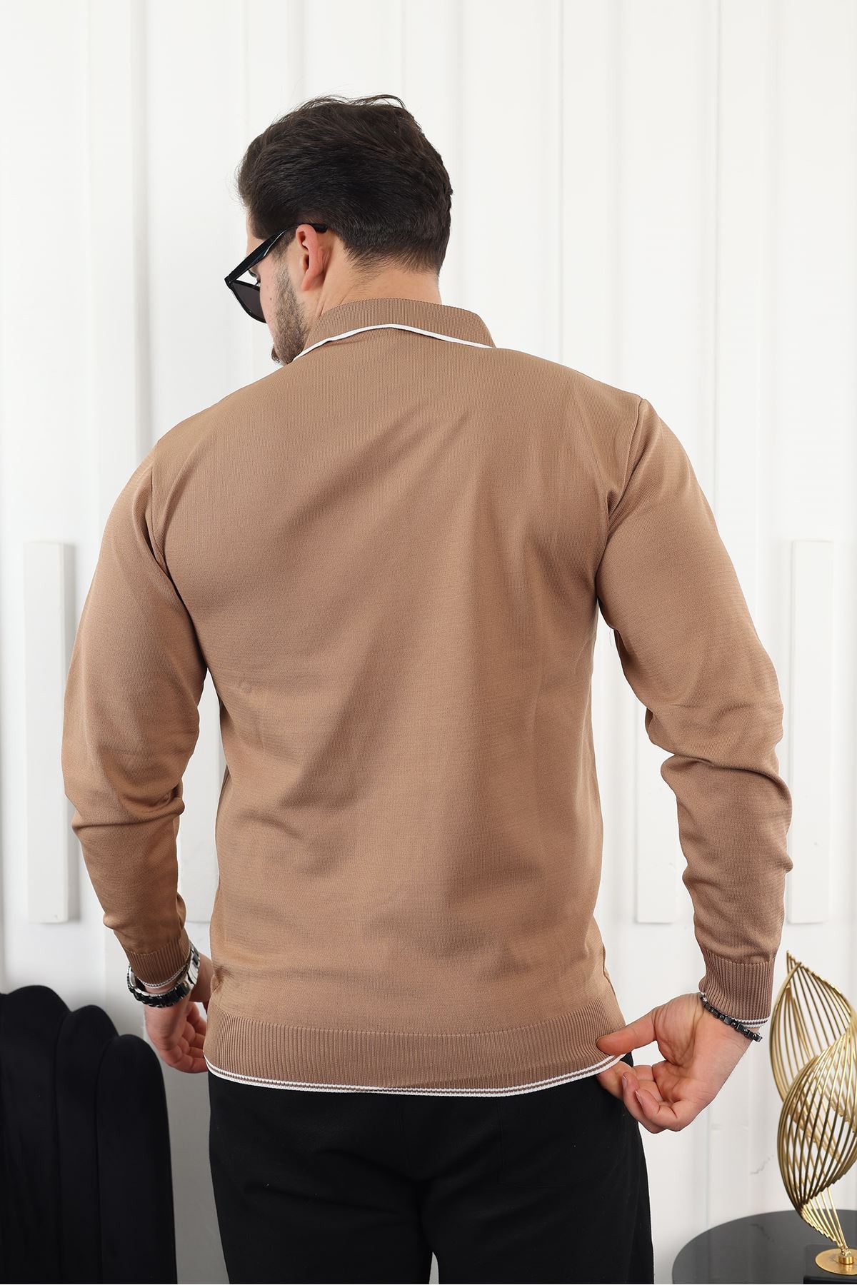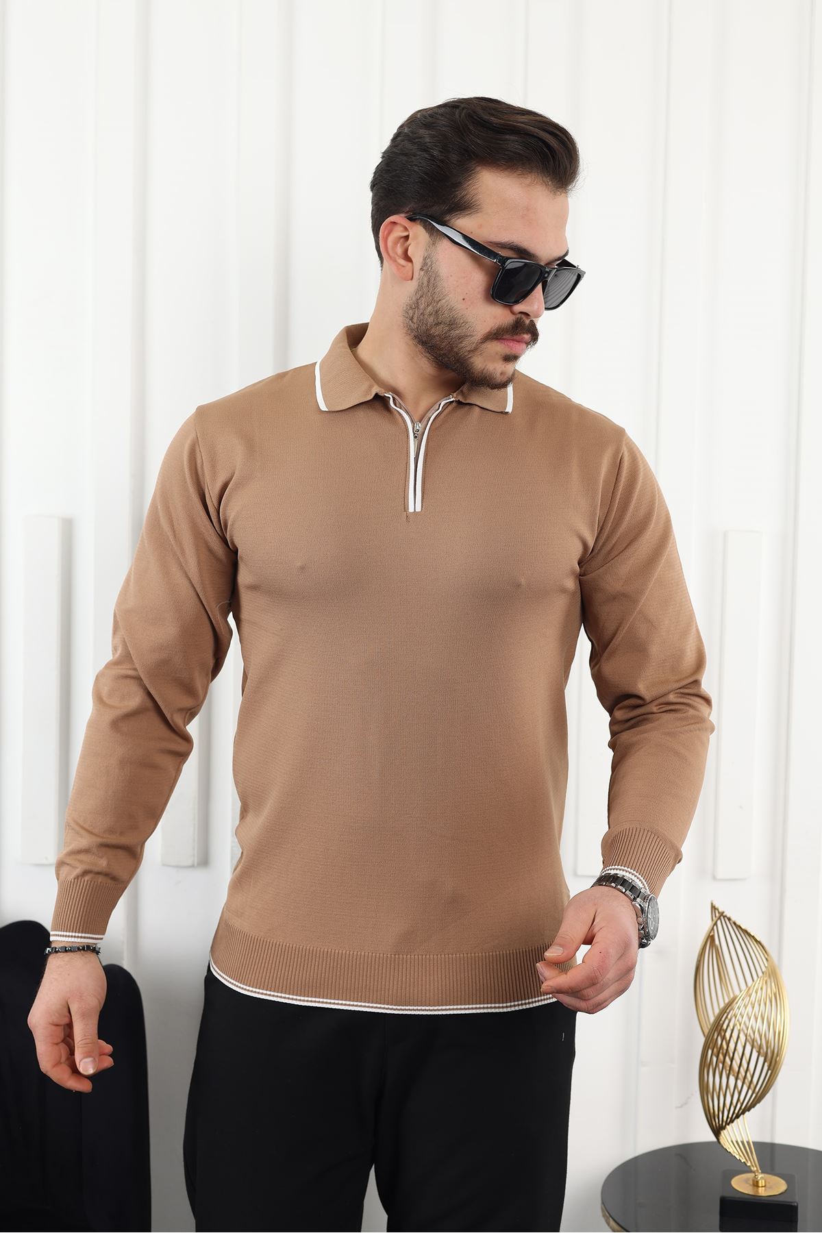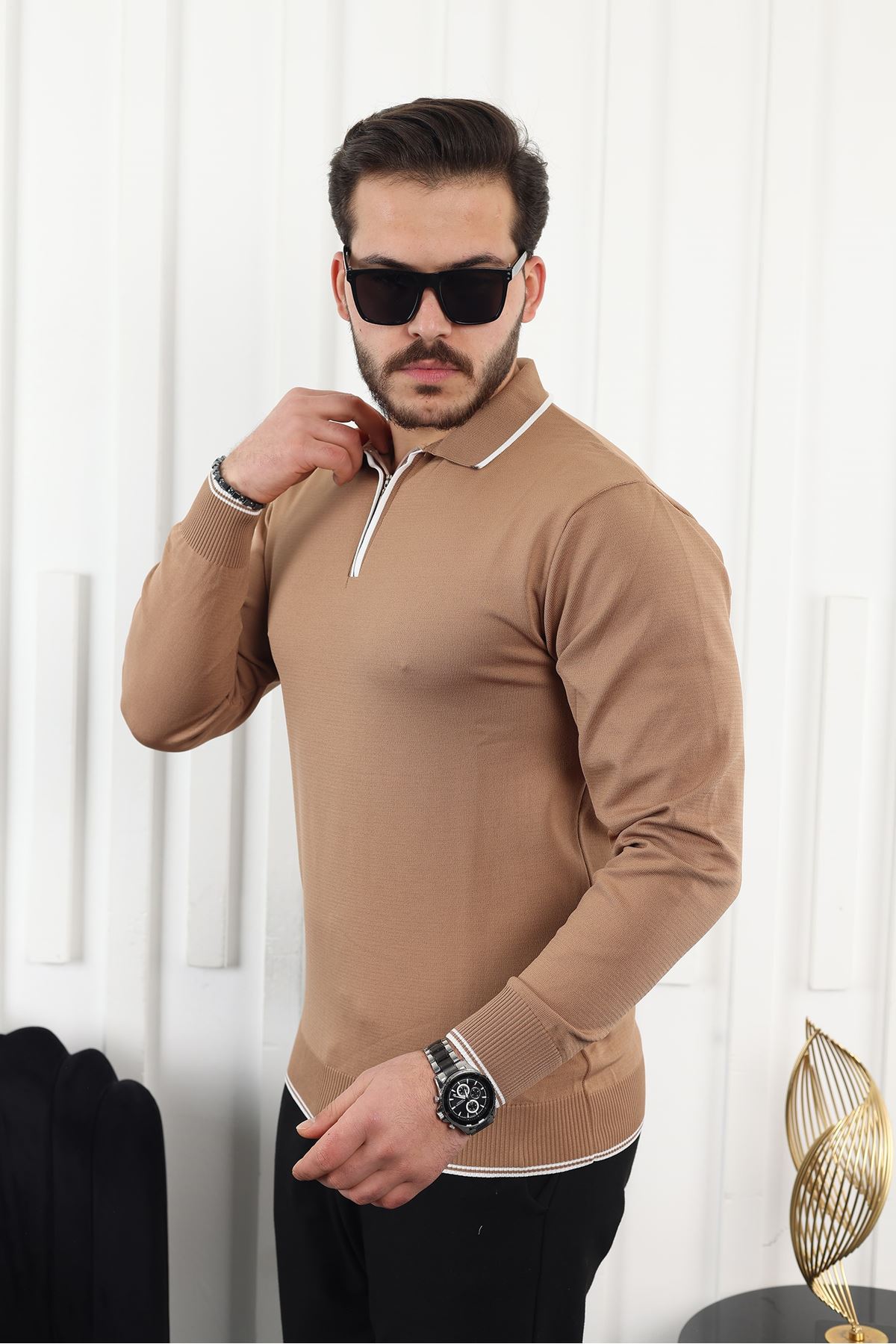 Fermuar Yaka Çizgi Detaylı Erkek Kazak SÜTLÜ KAHVE