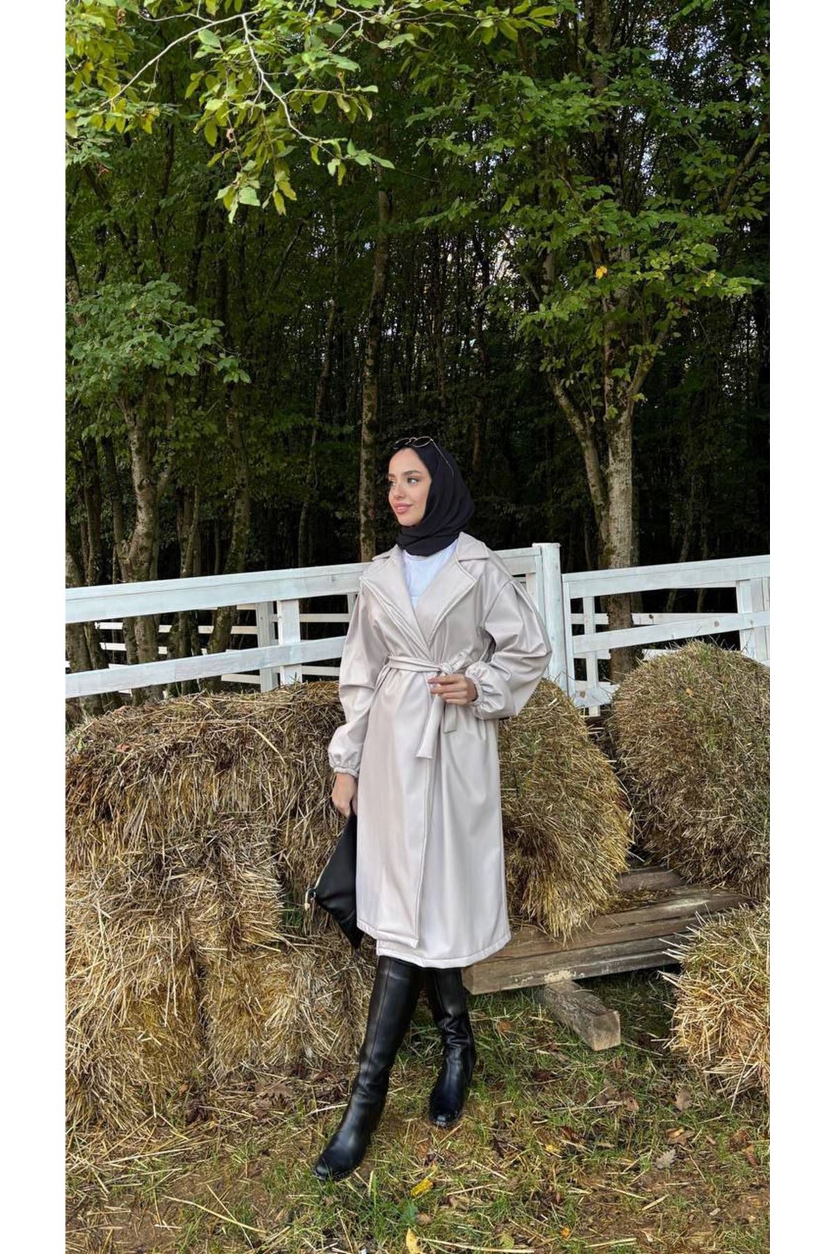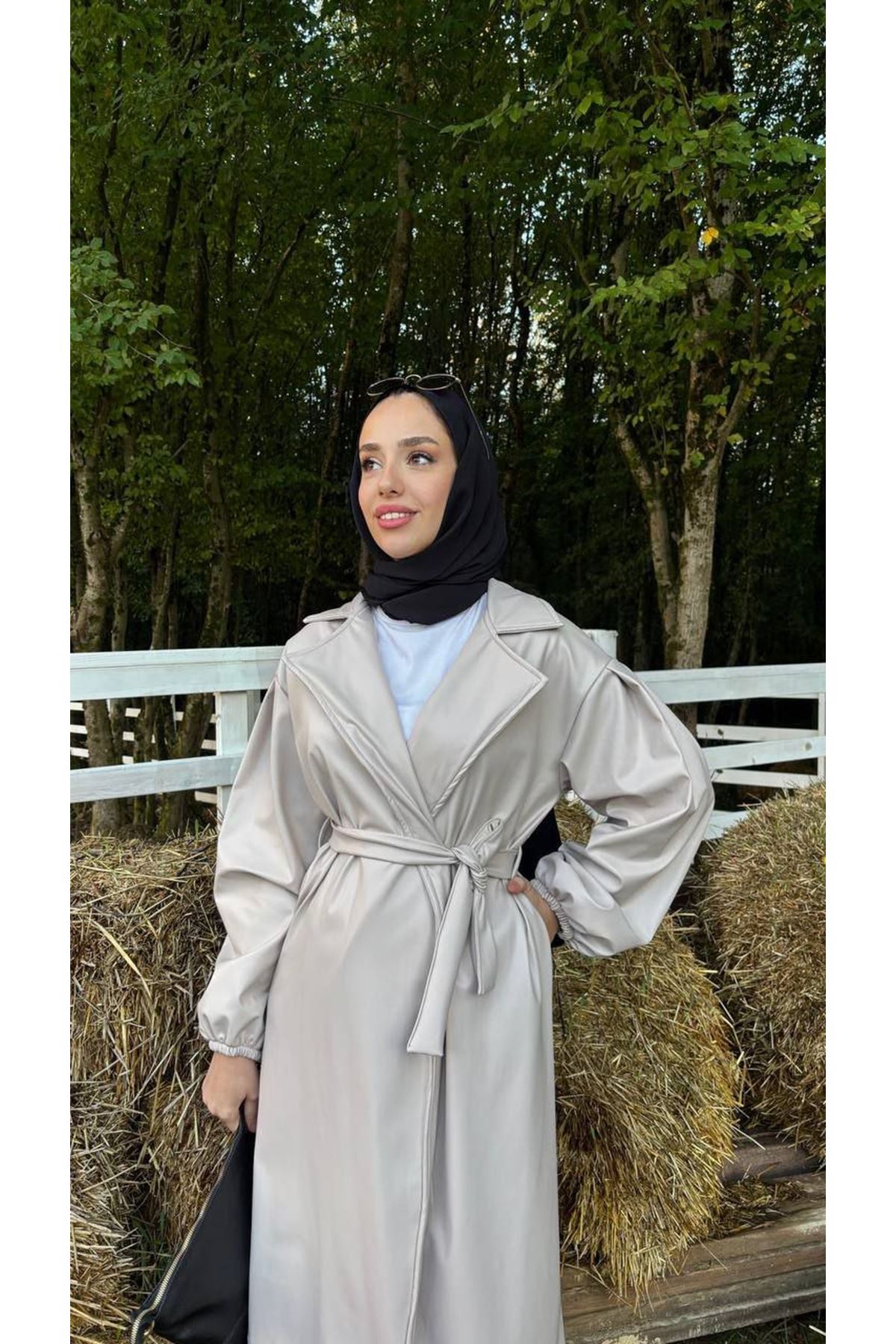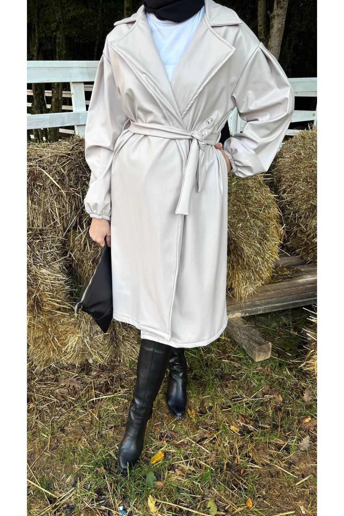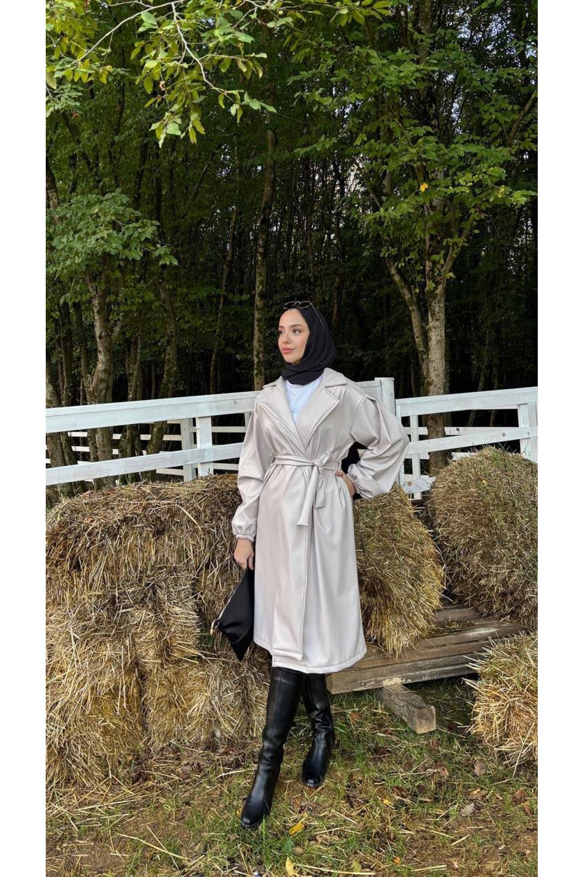 Kadın Belden Bağlamalı Balon Kol Deri Trenç A.GRİ