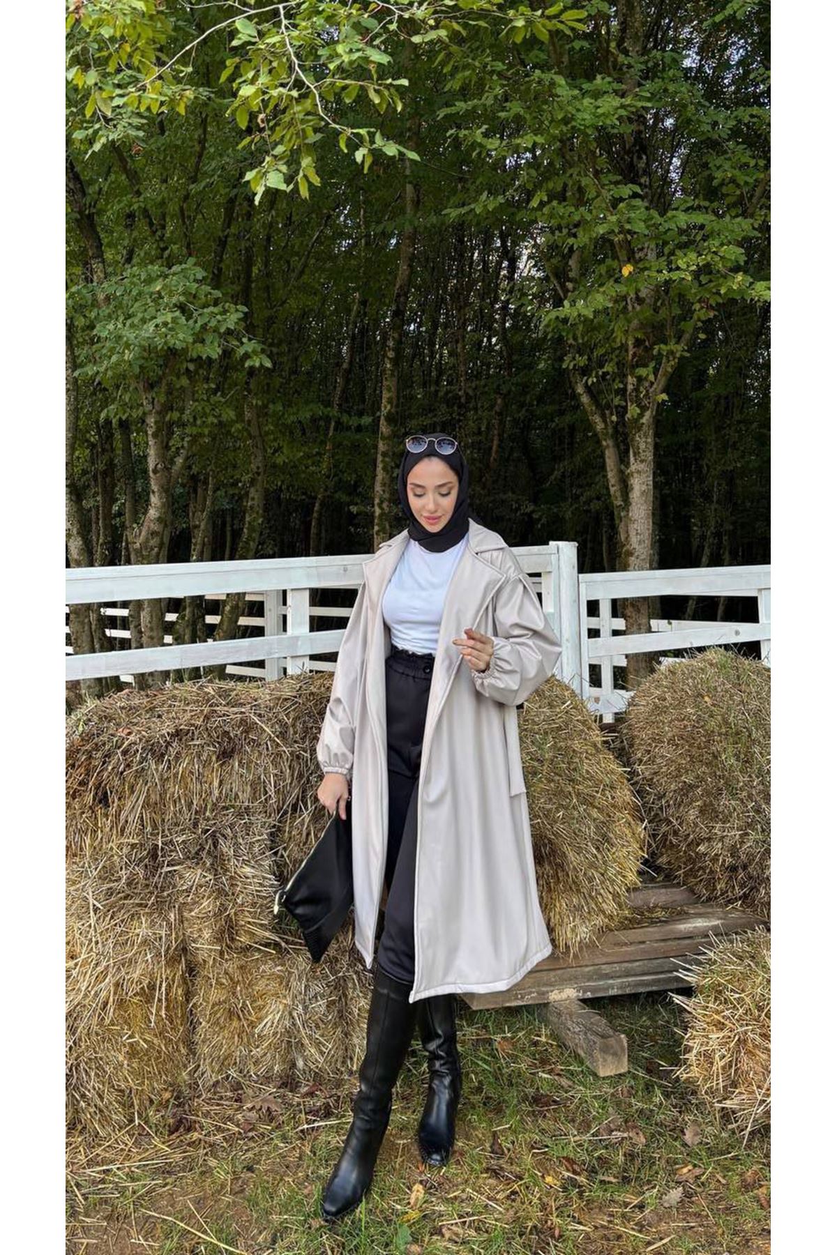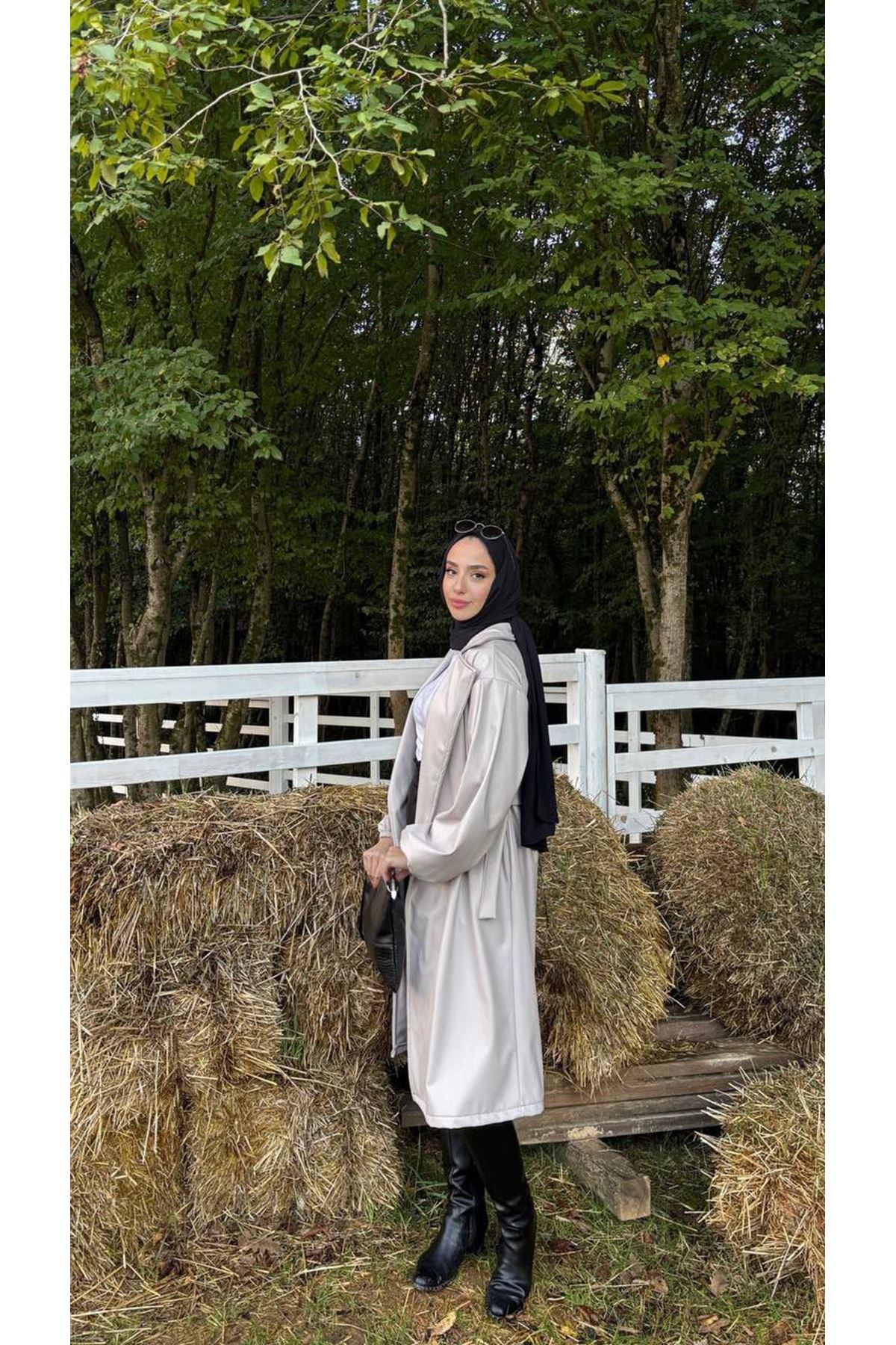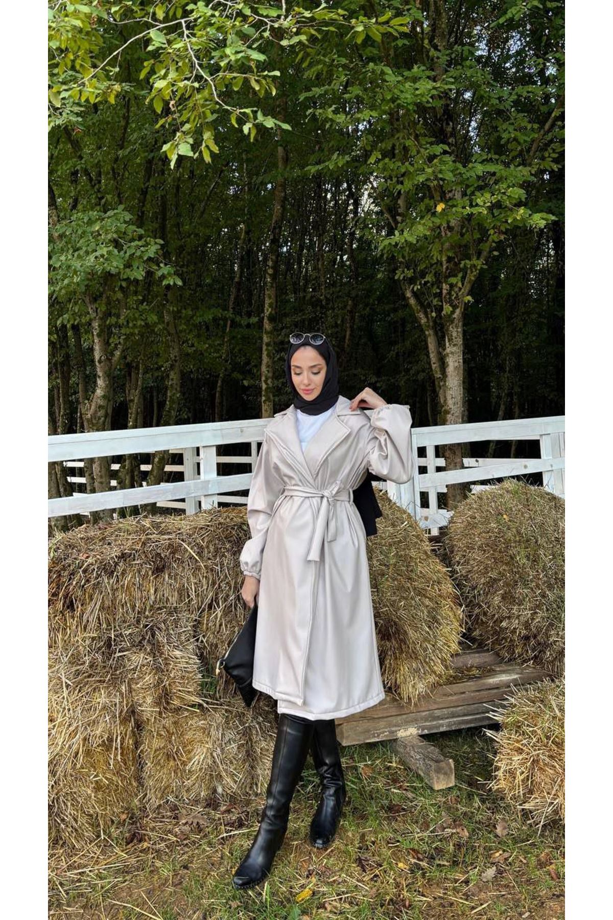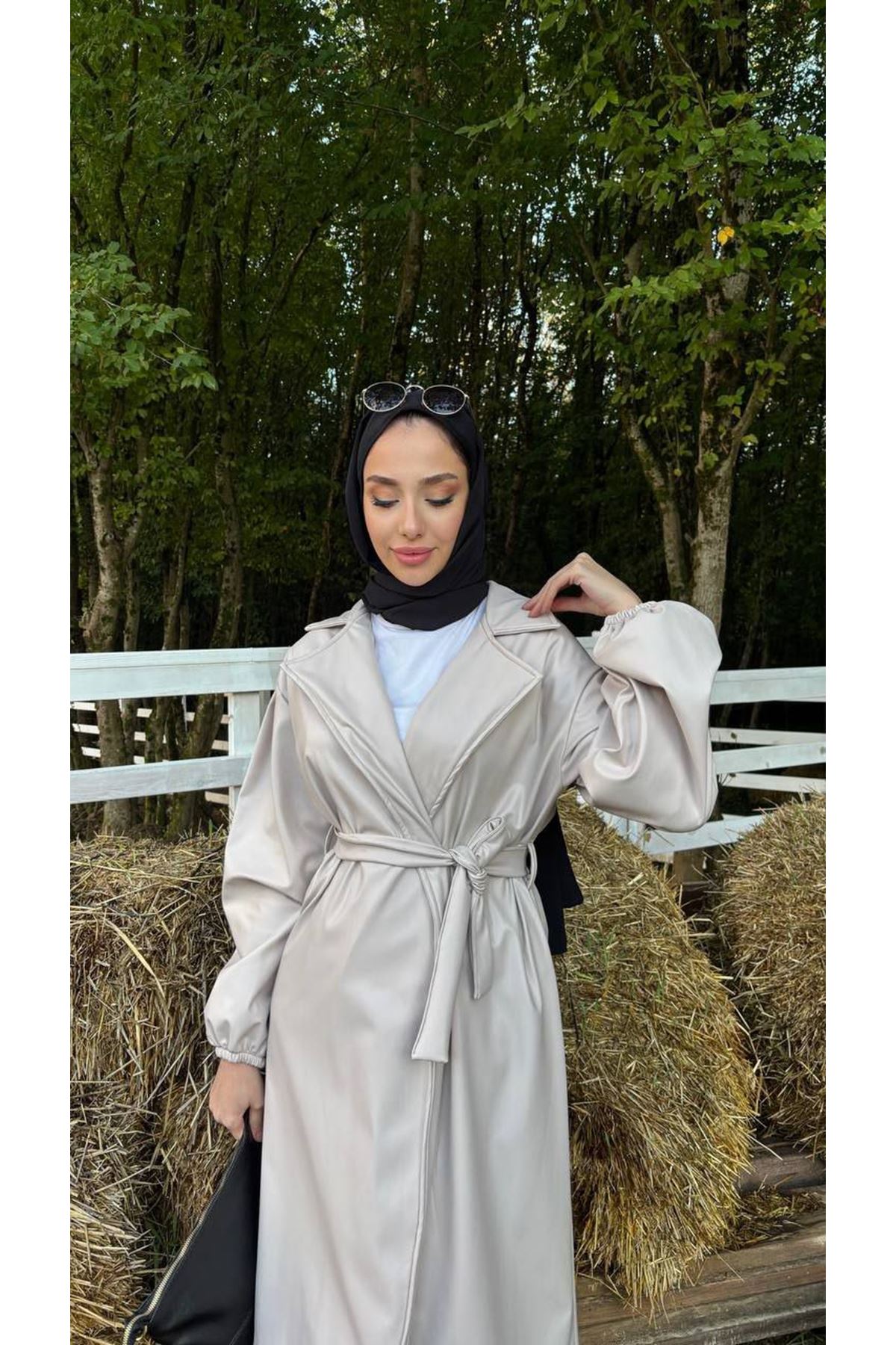 Kadın Belden Bağlamalı Balon Kol Deri Trenç A.GRİ
