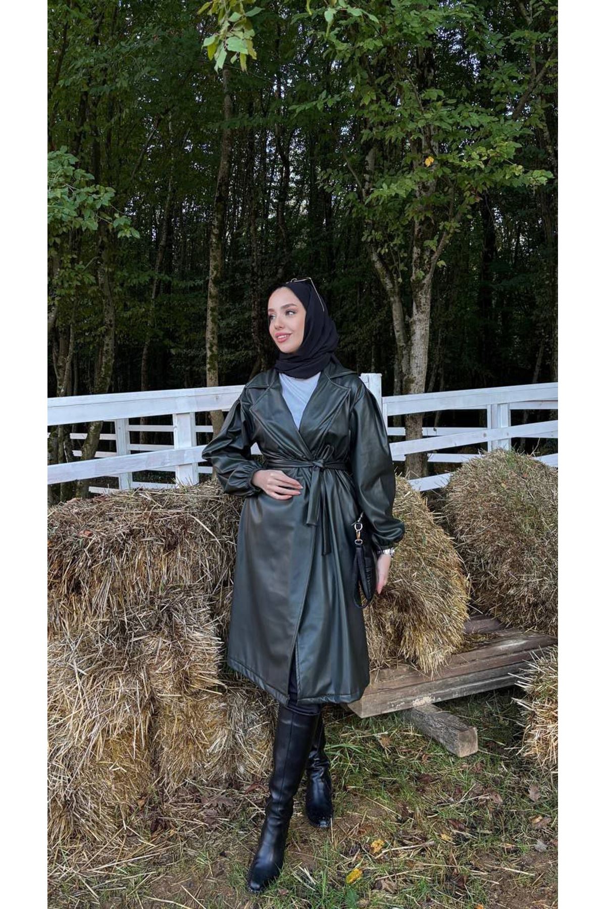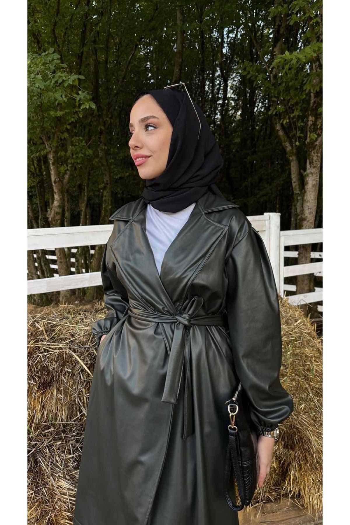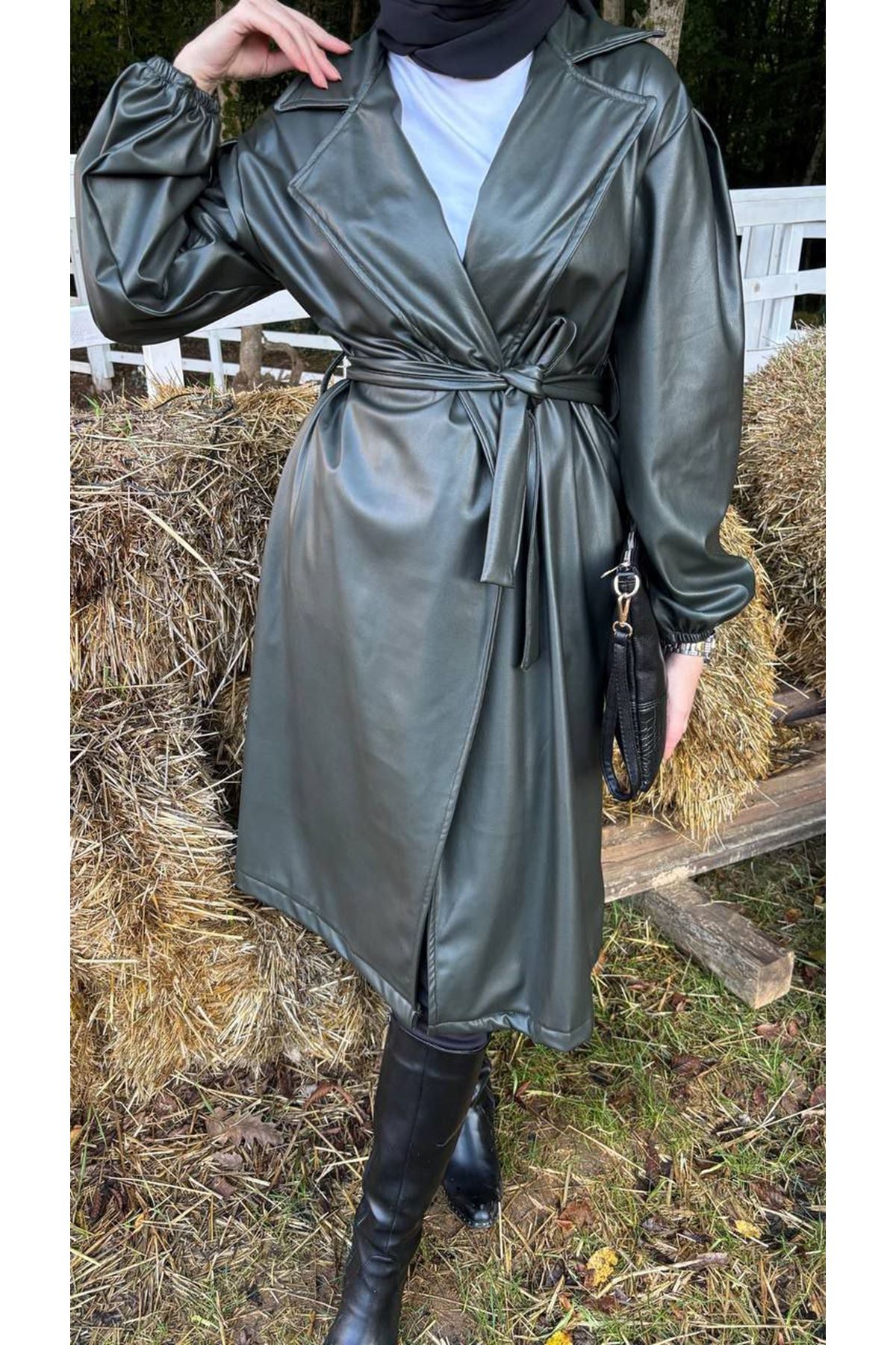 Kadın Belden Bağlamalı Balon Kol Deri Trenç HAKİ