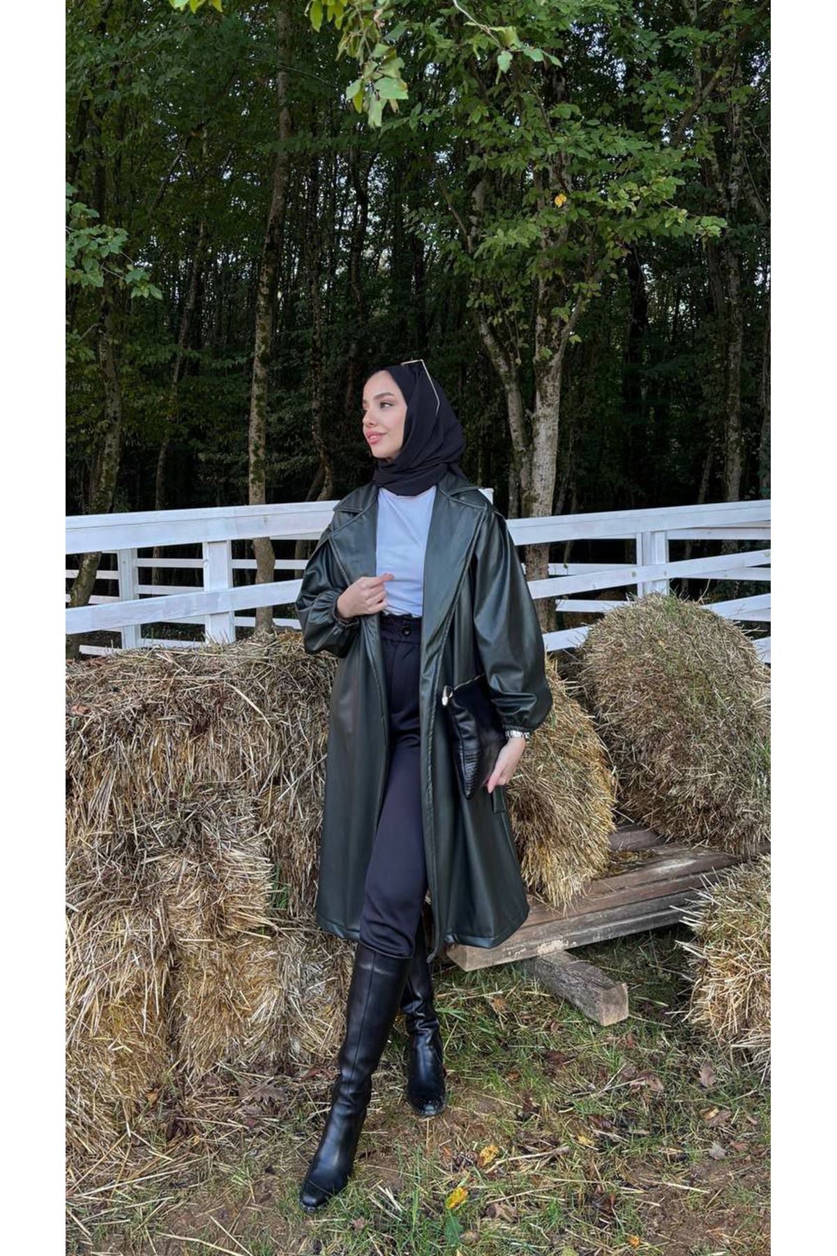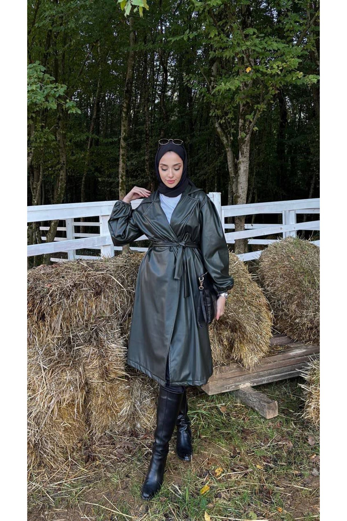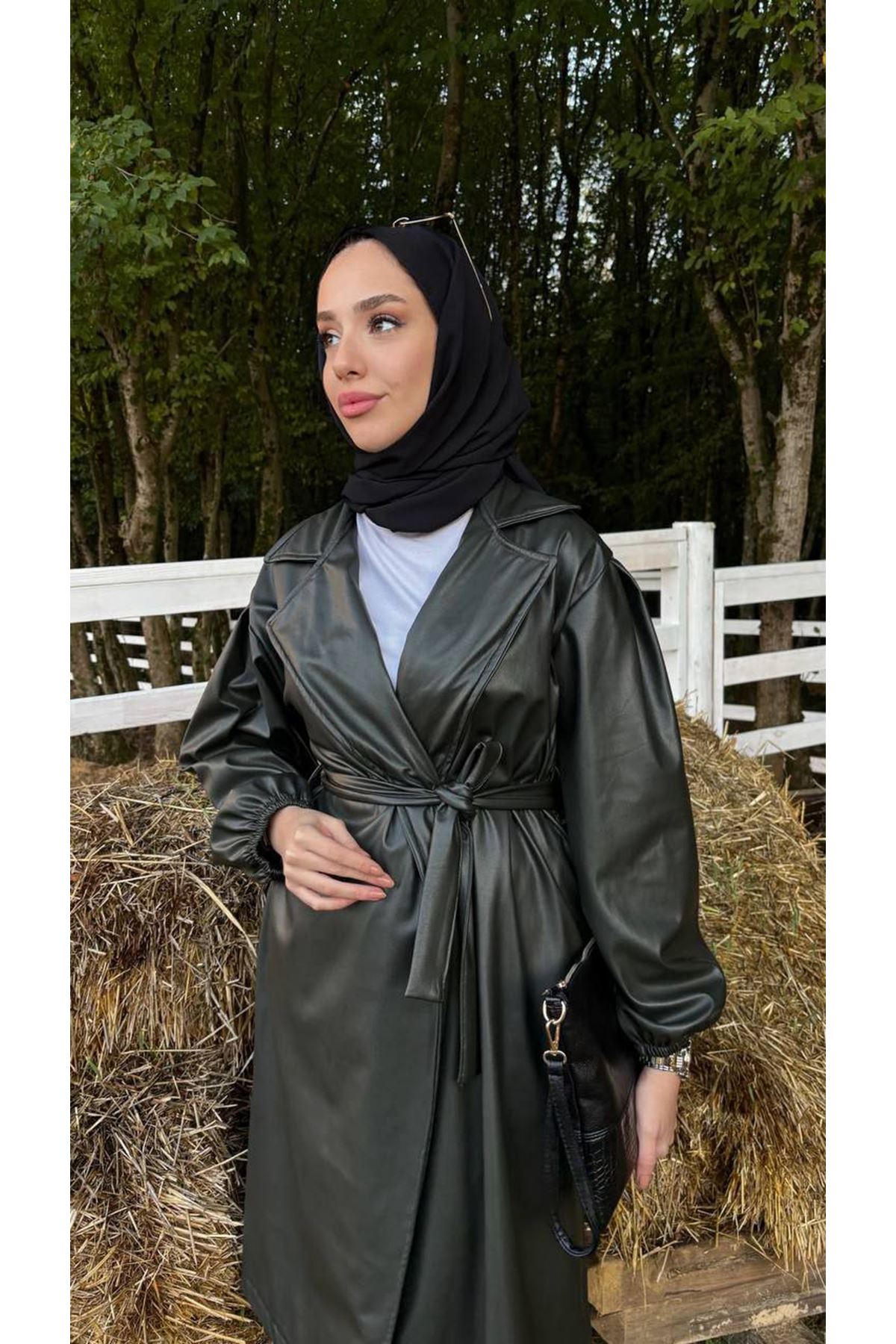 Kadın Belden Bağlamalı Balon Kol Deri Trenç HAKİ