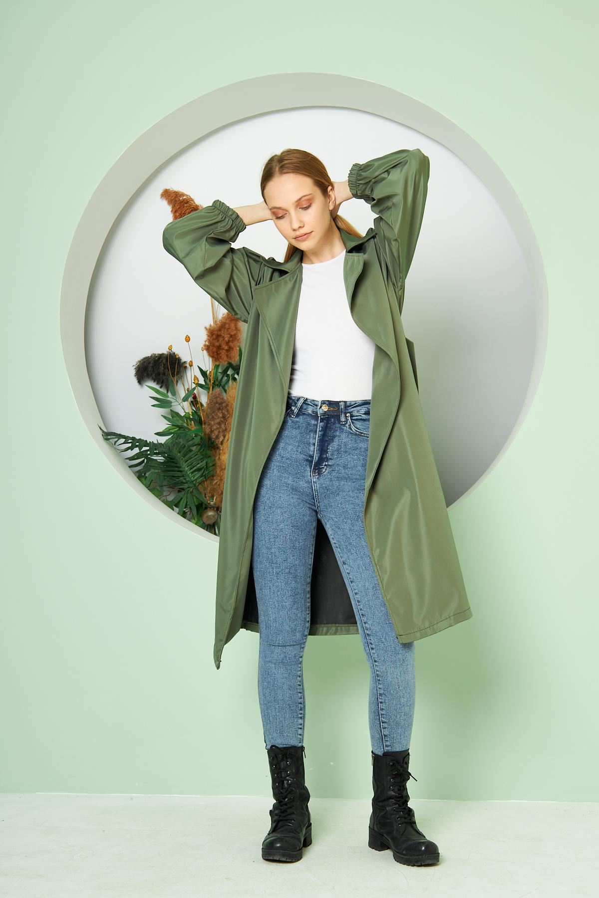 Kadın Belden Bağlamalı Balon Kol Trenç HAKİ