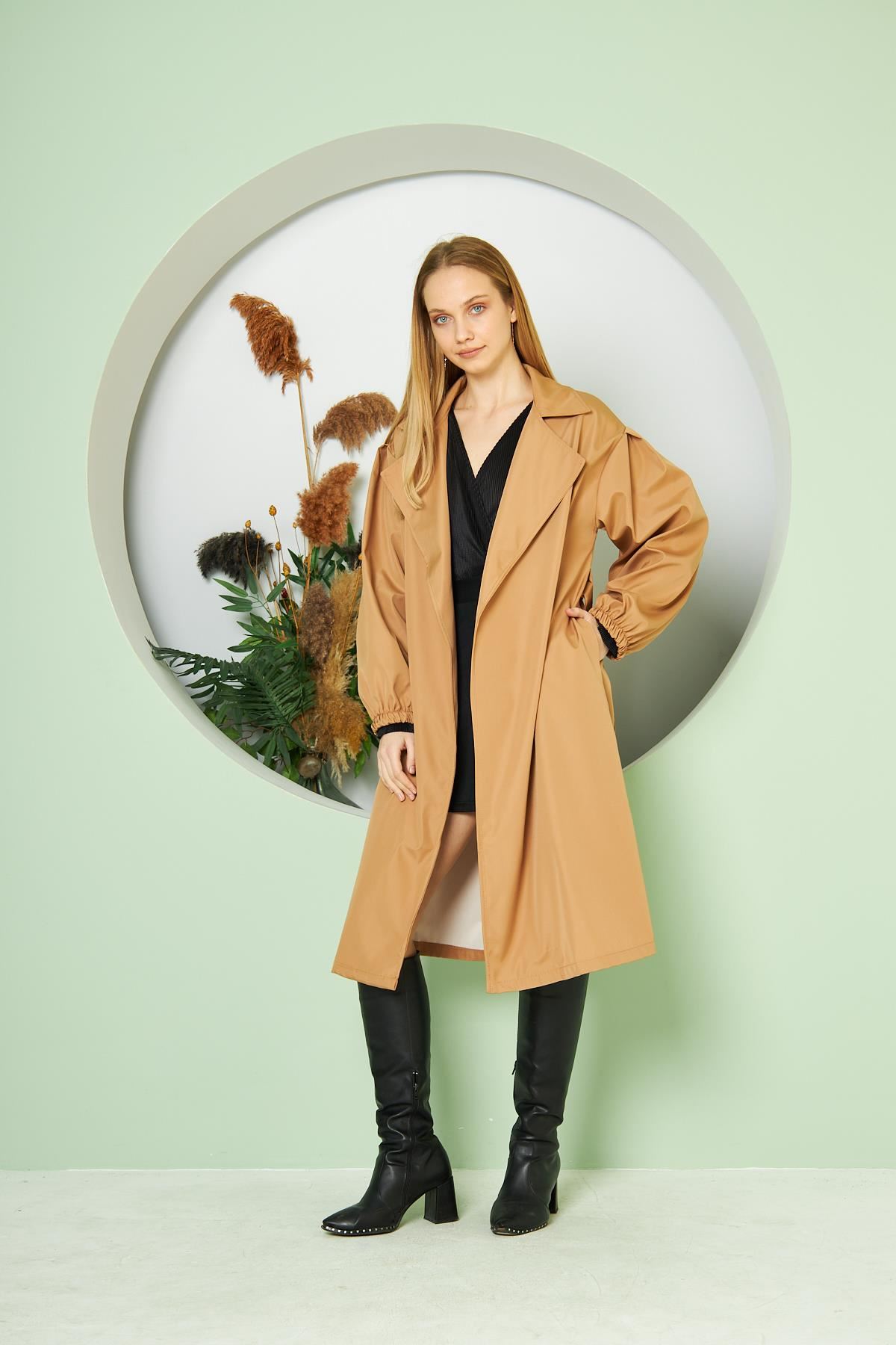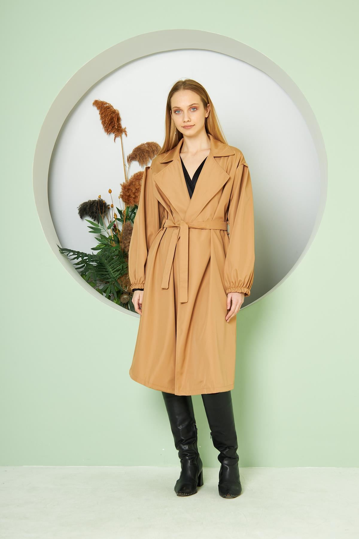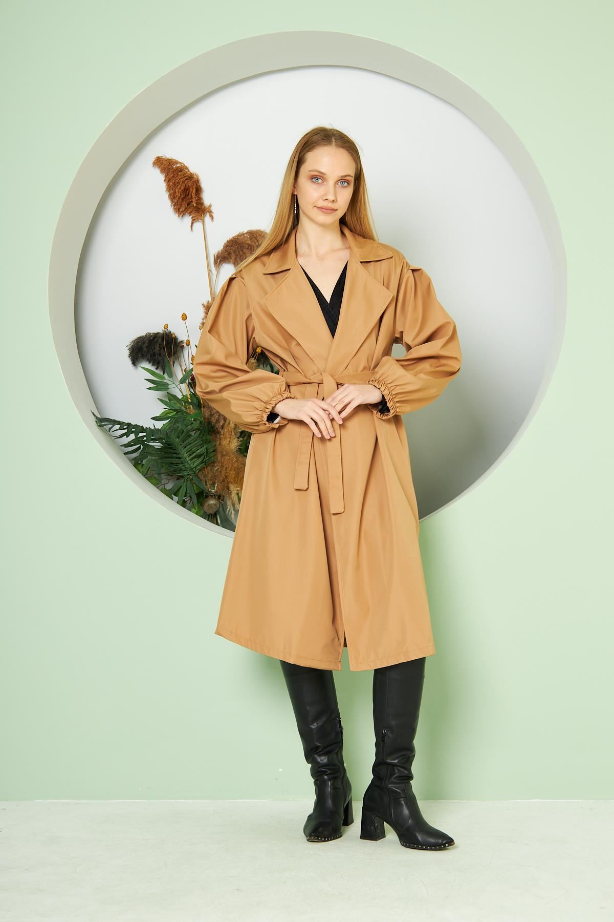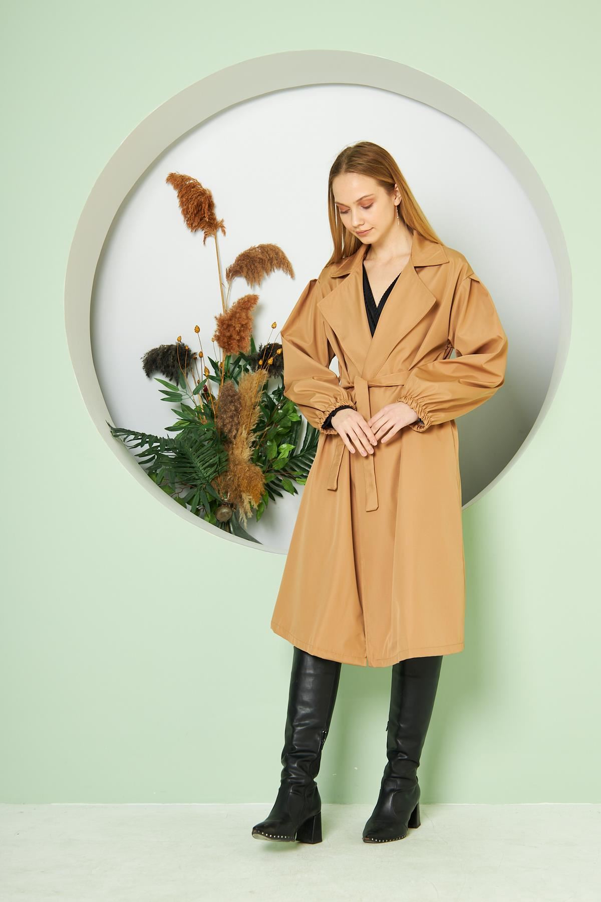 Kadın Belden Bağlamalı Balon Kol Trenç Taba