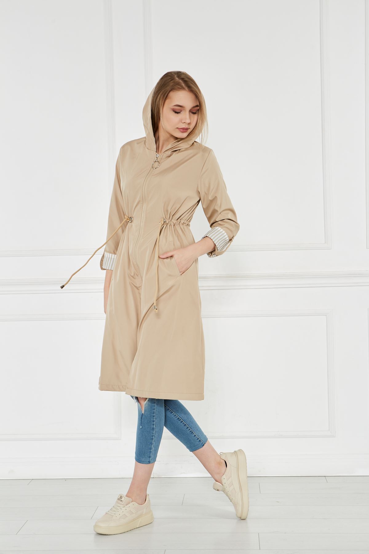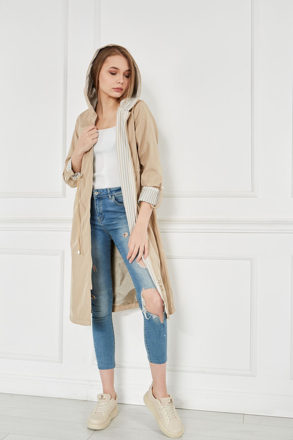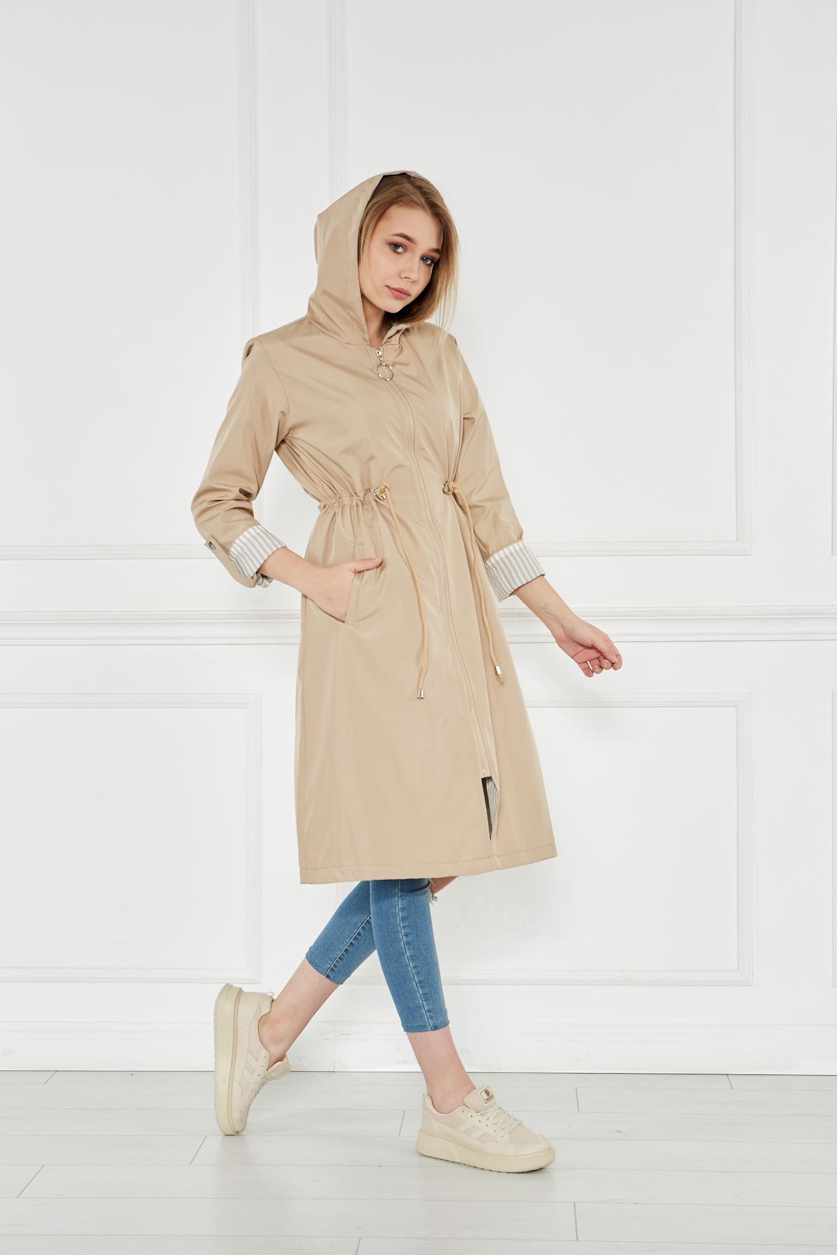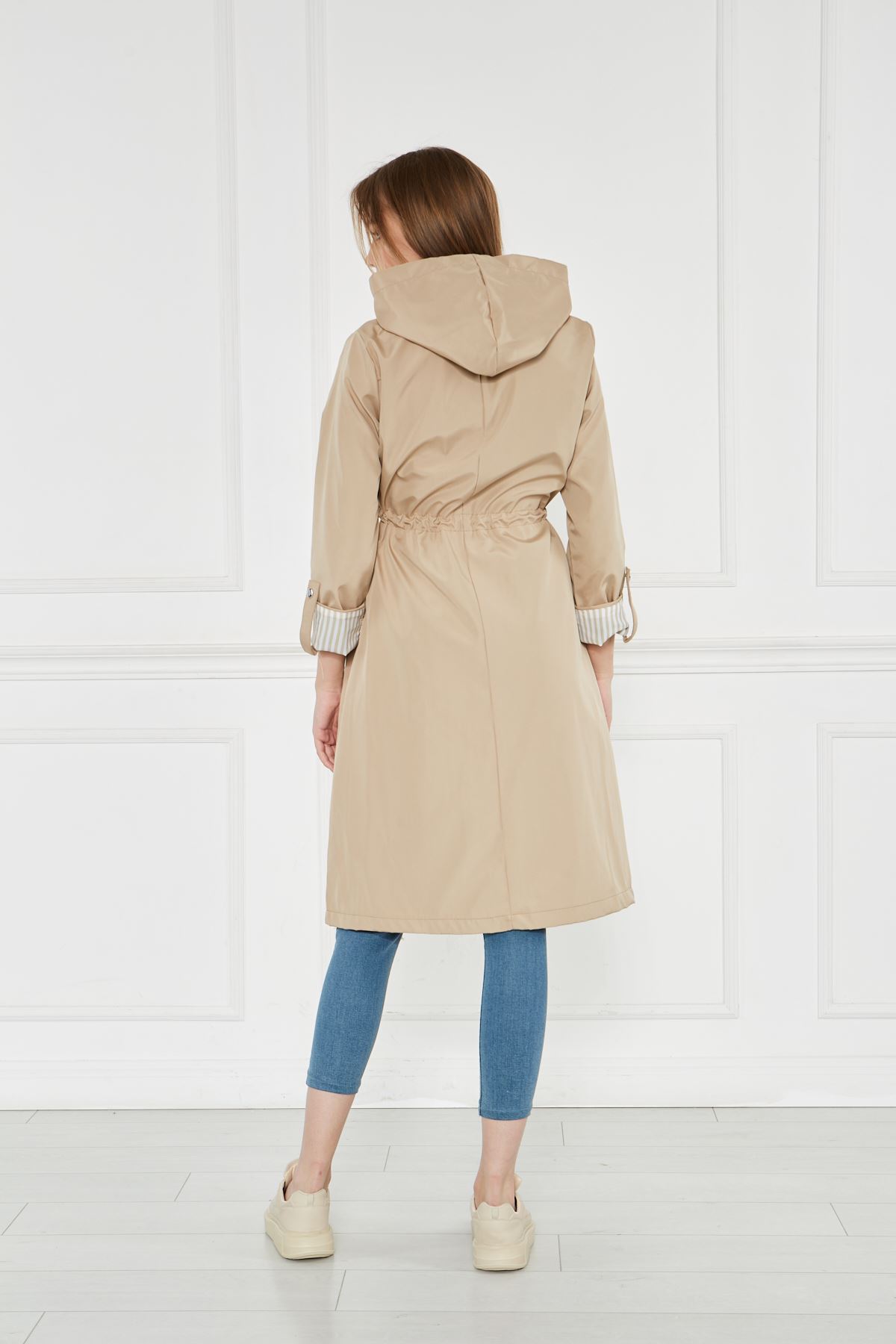 Kadın Beli Büzgülü Su İtici Kapüşonlu Trençkot KREM