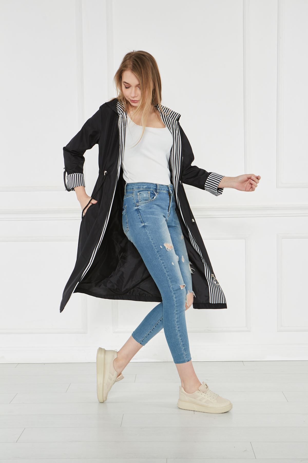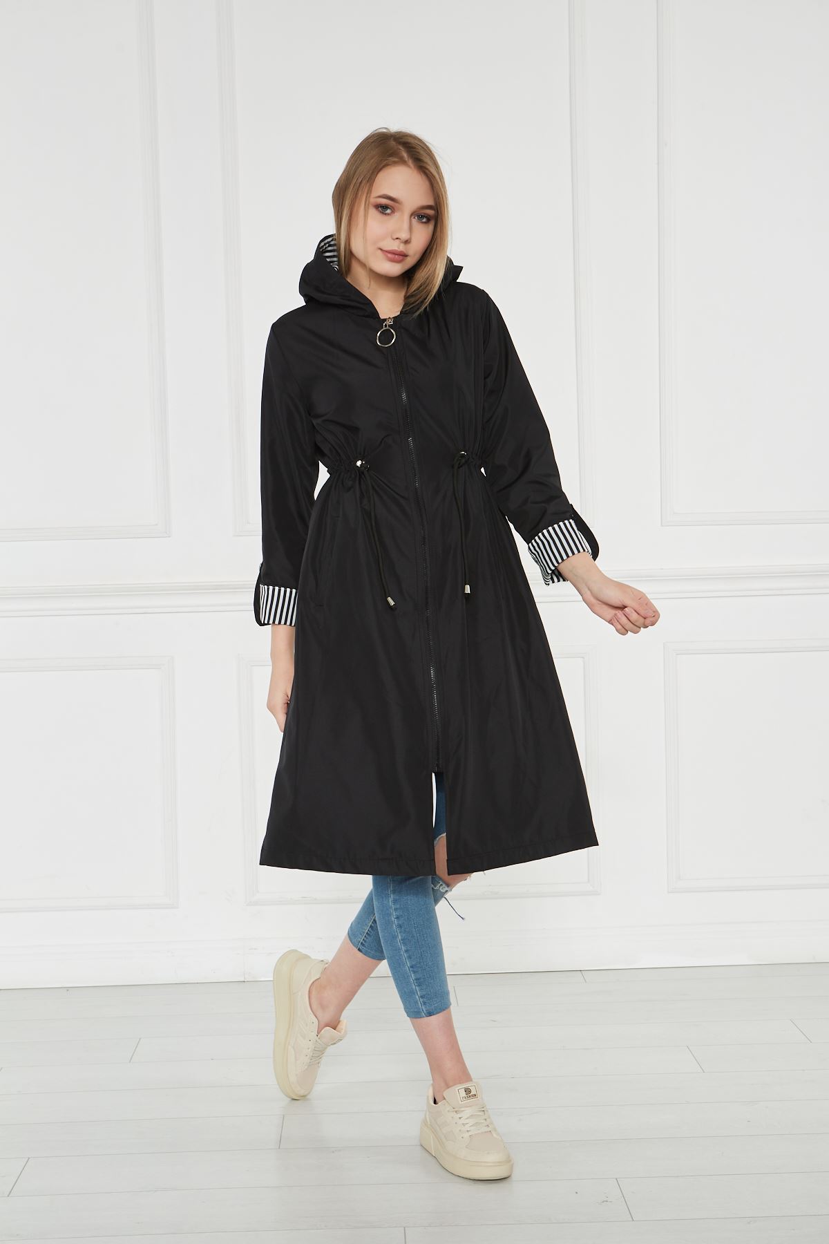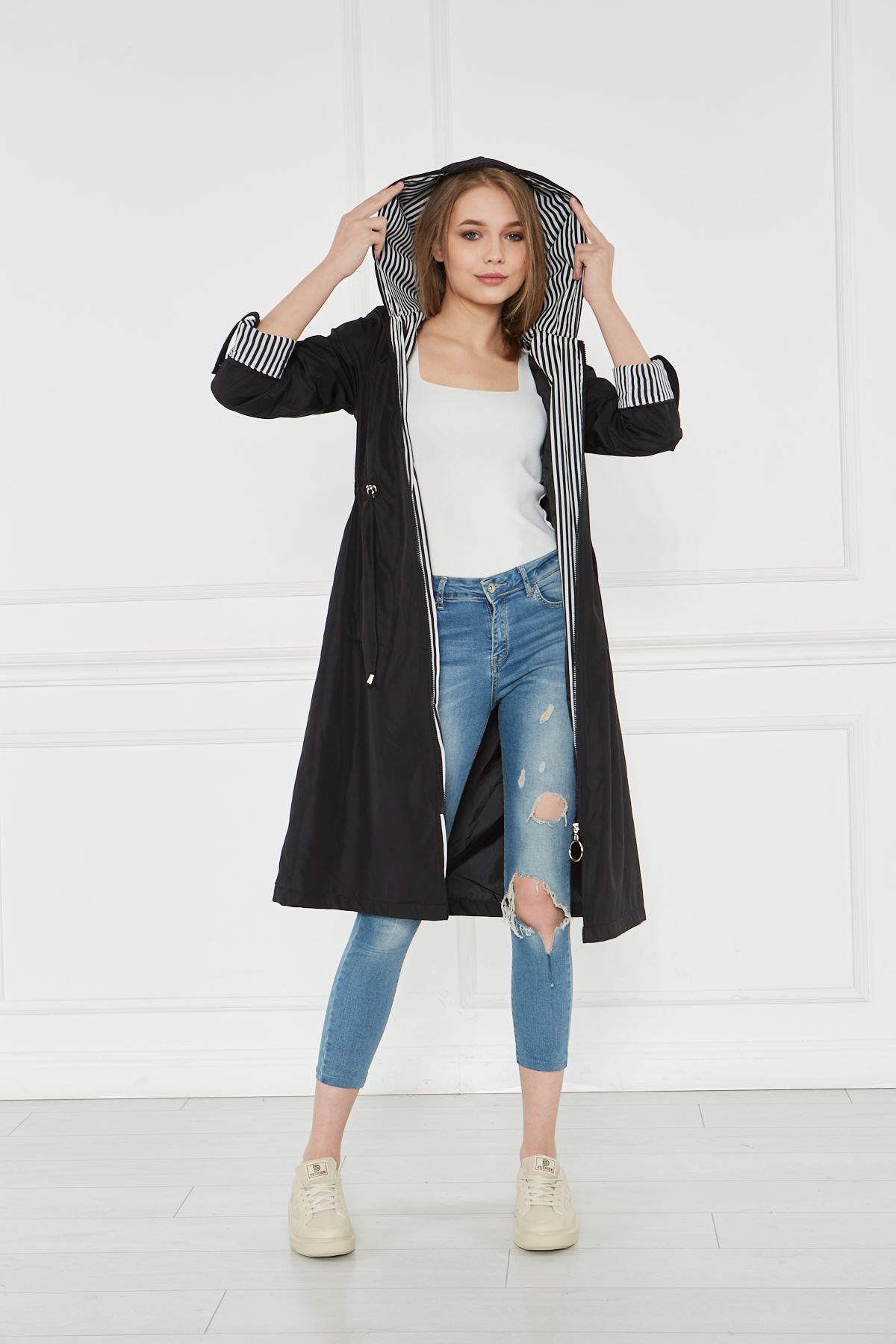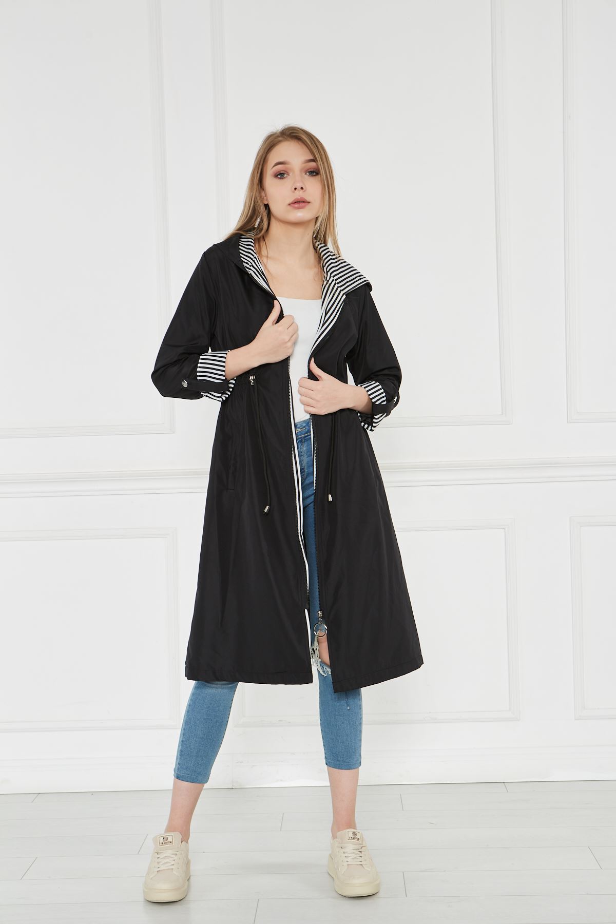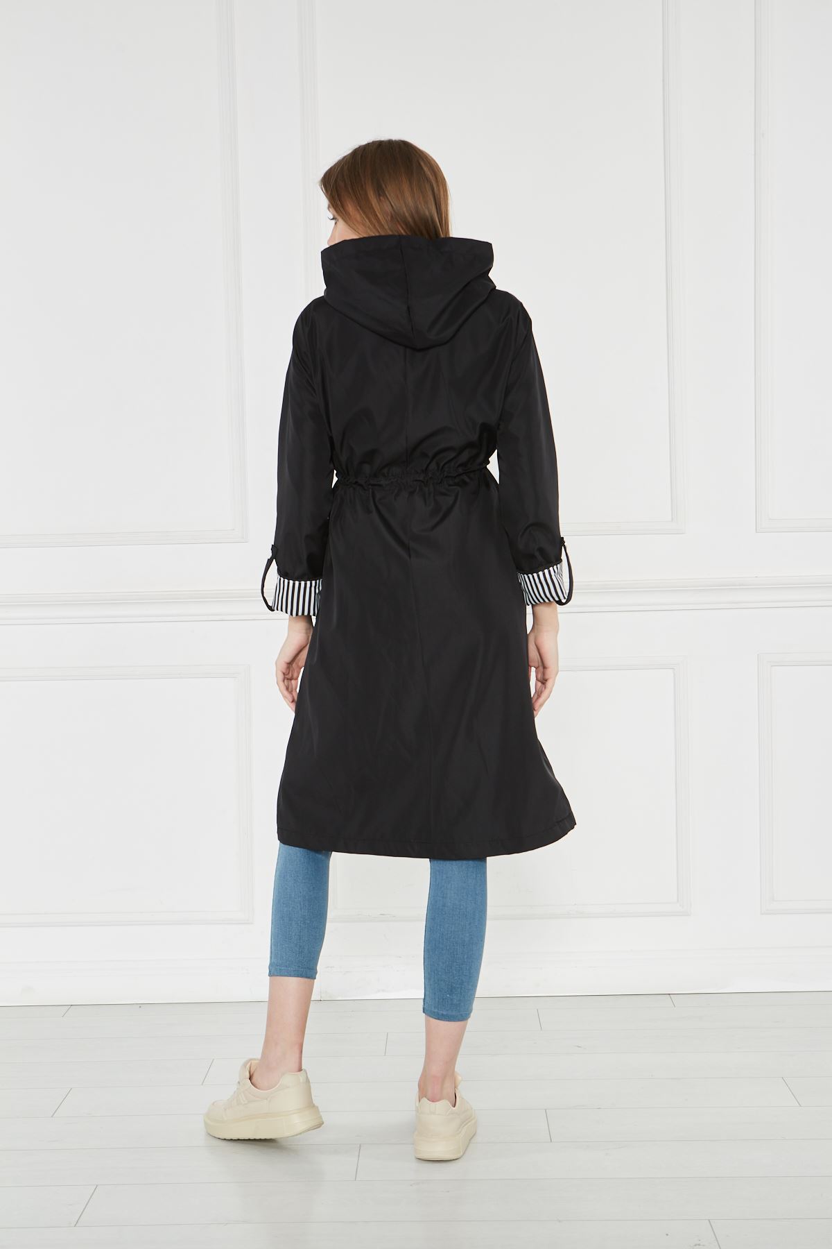 Kadın Beli Büzgülü Su İtici Kapüşonlu Trençkot SİYAH