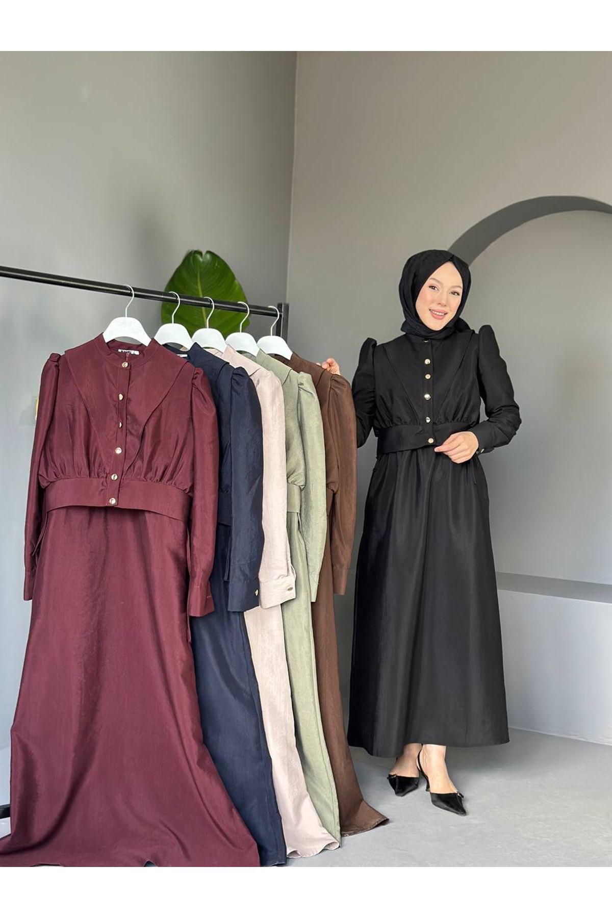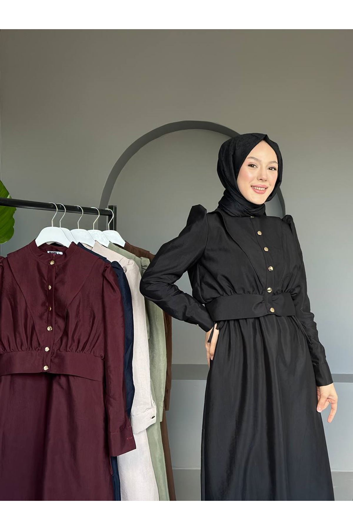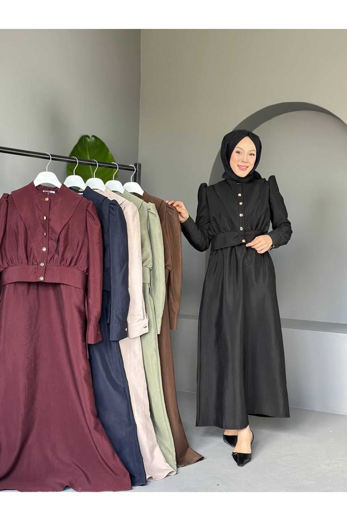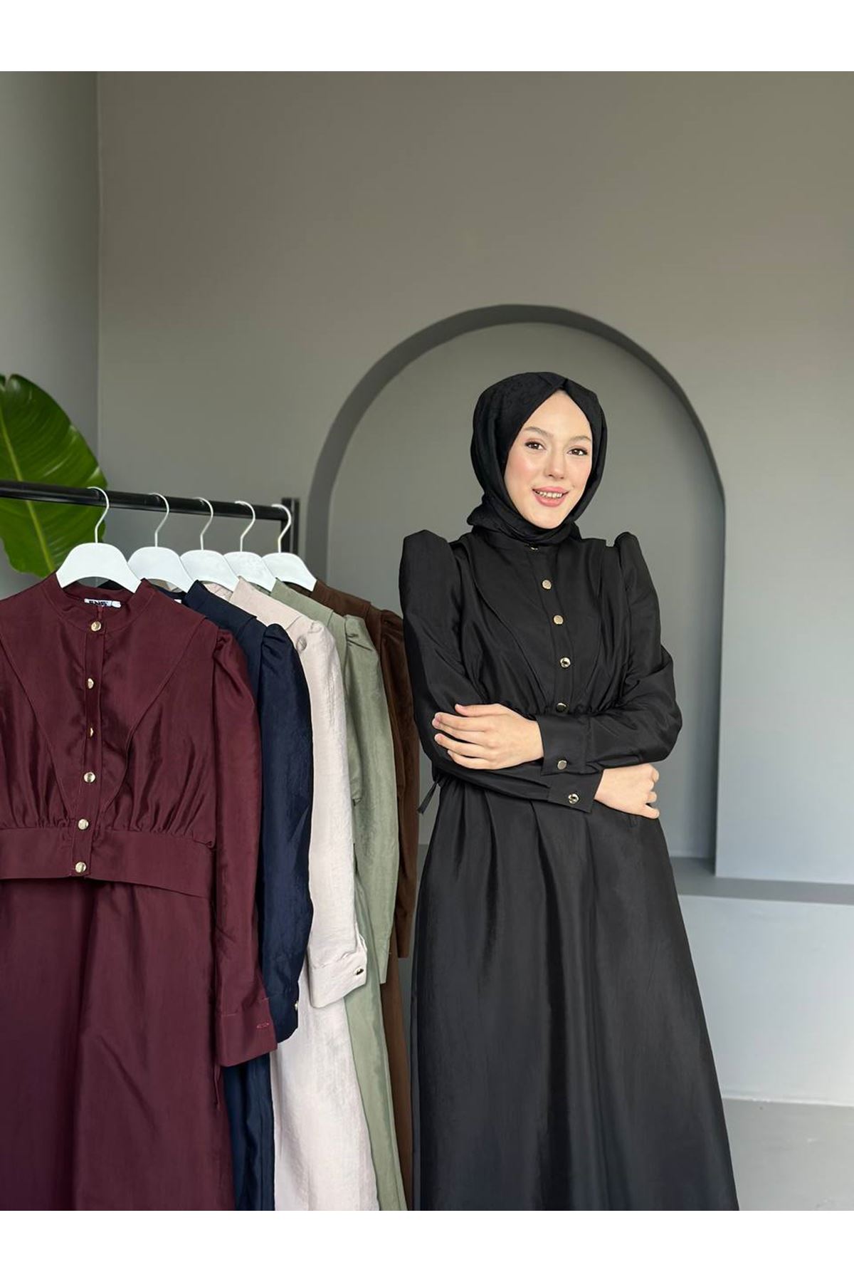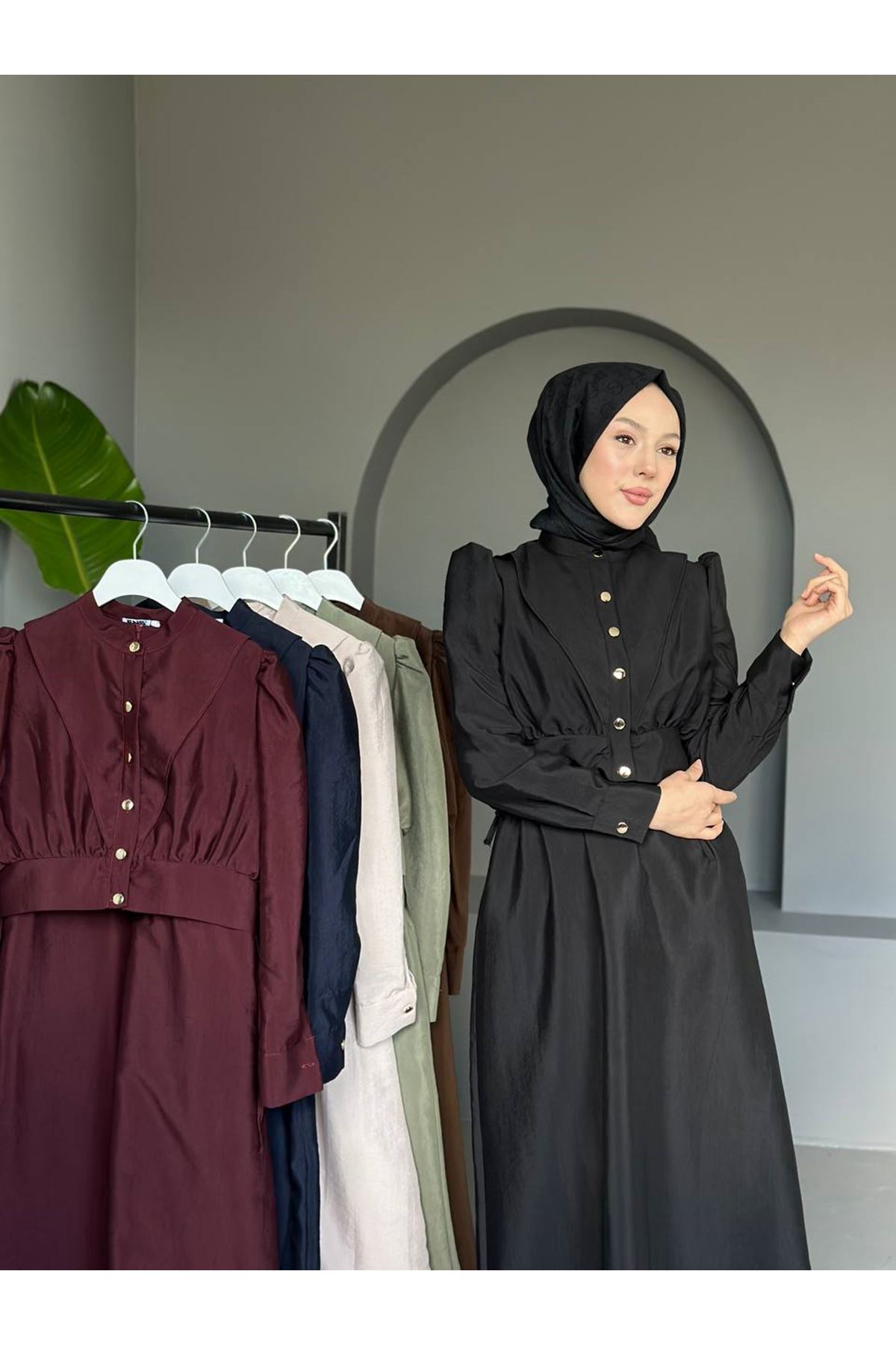 Kadın Büzgülü Balon Kol Düğmeli Uzun Elbise