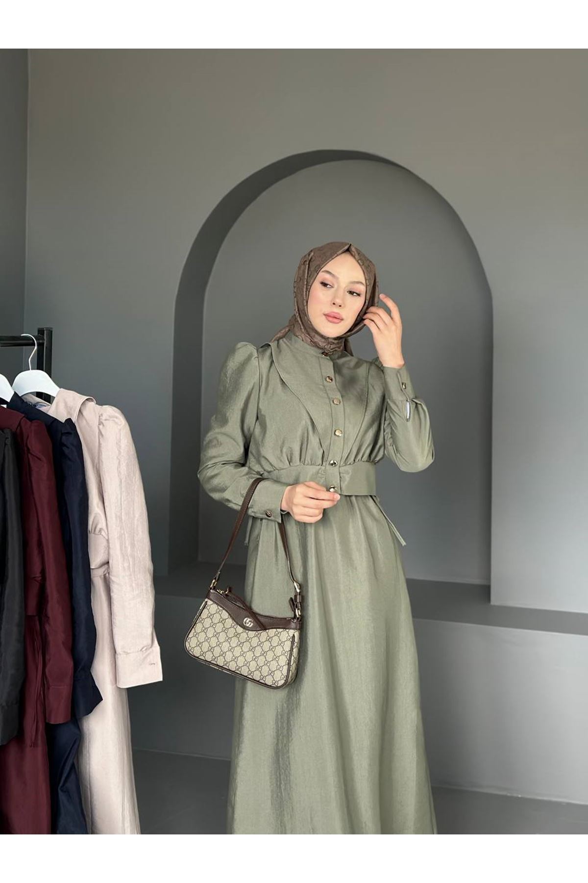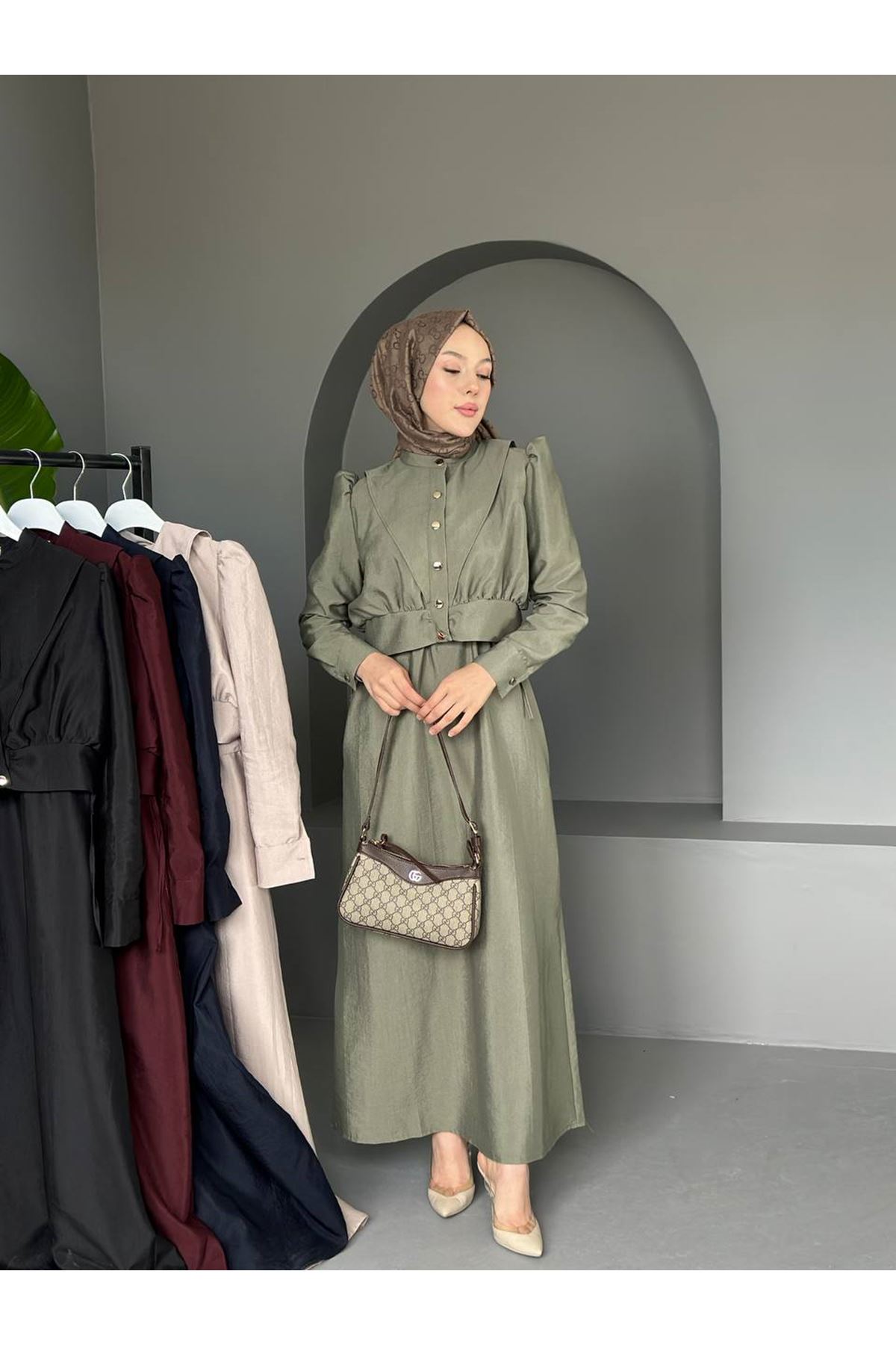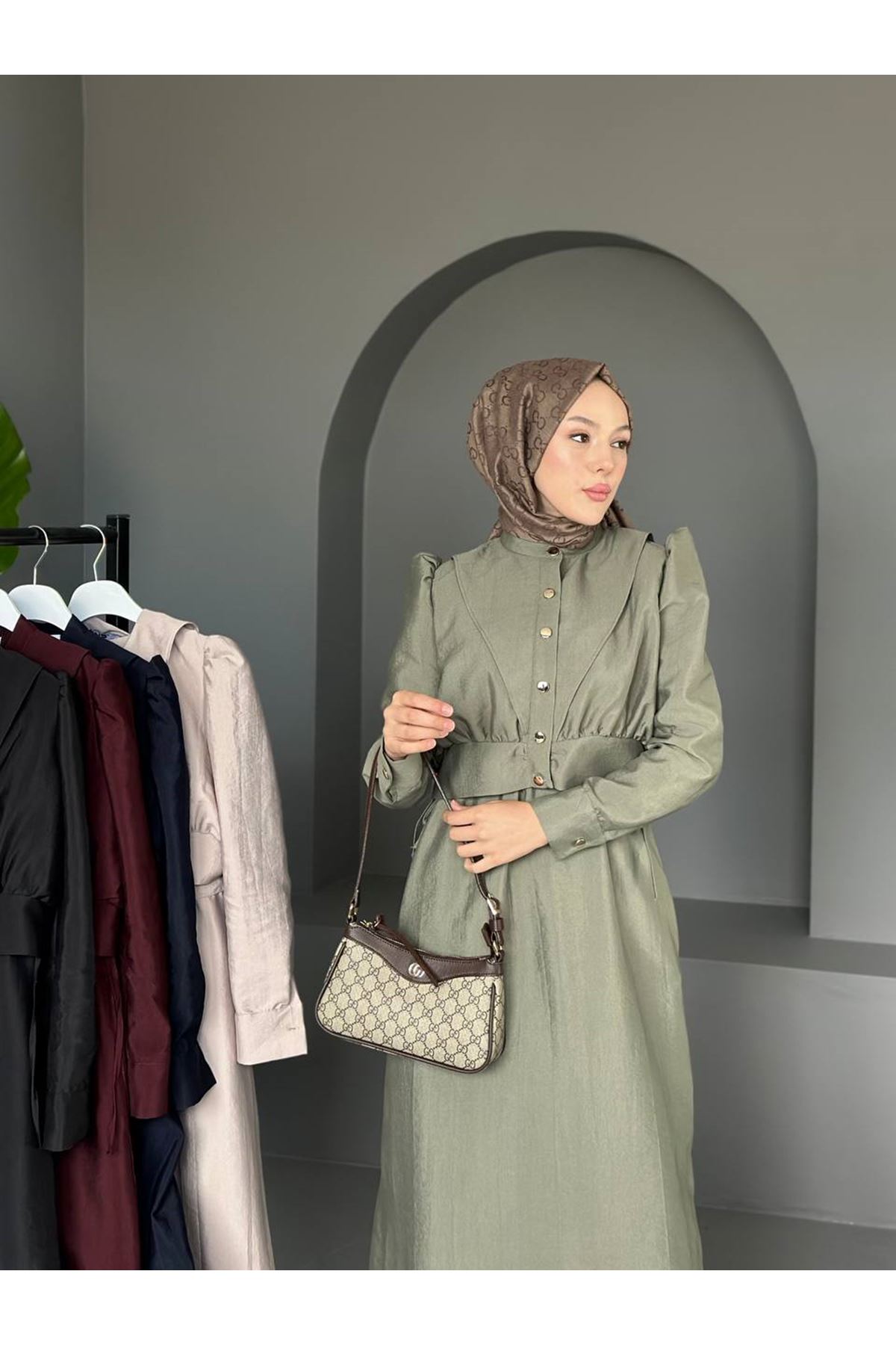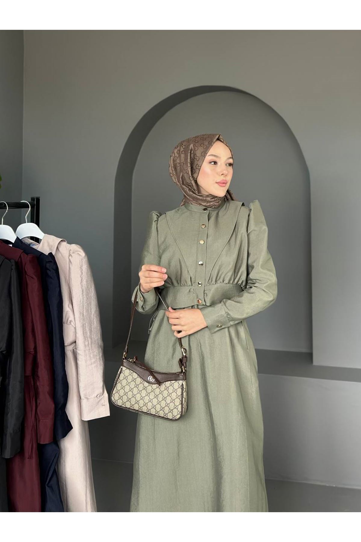 Maya Kumaş Beli Büzgülü Elbise FISTIK YEŞİLİ