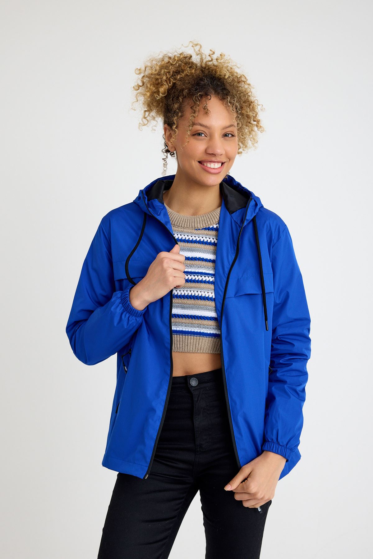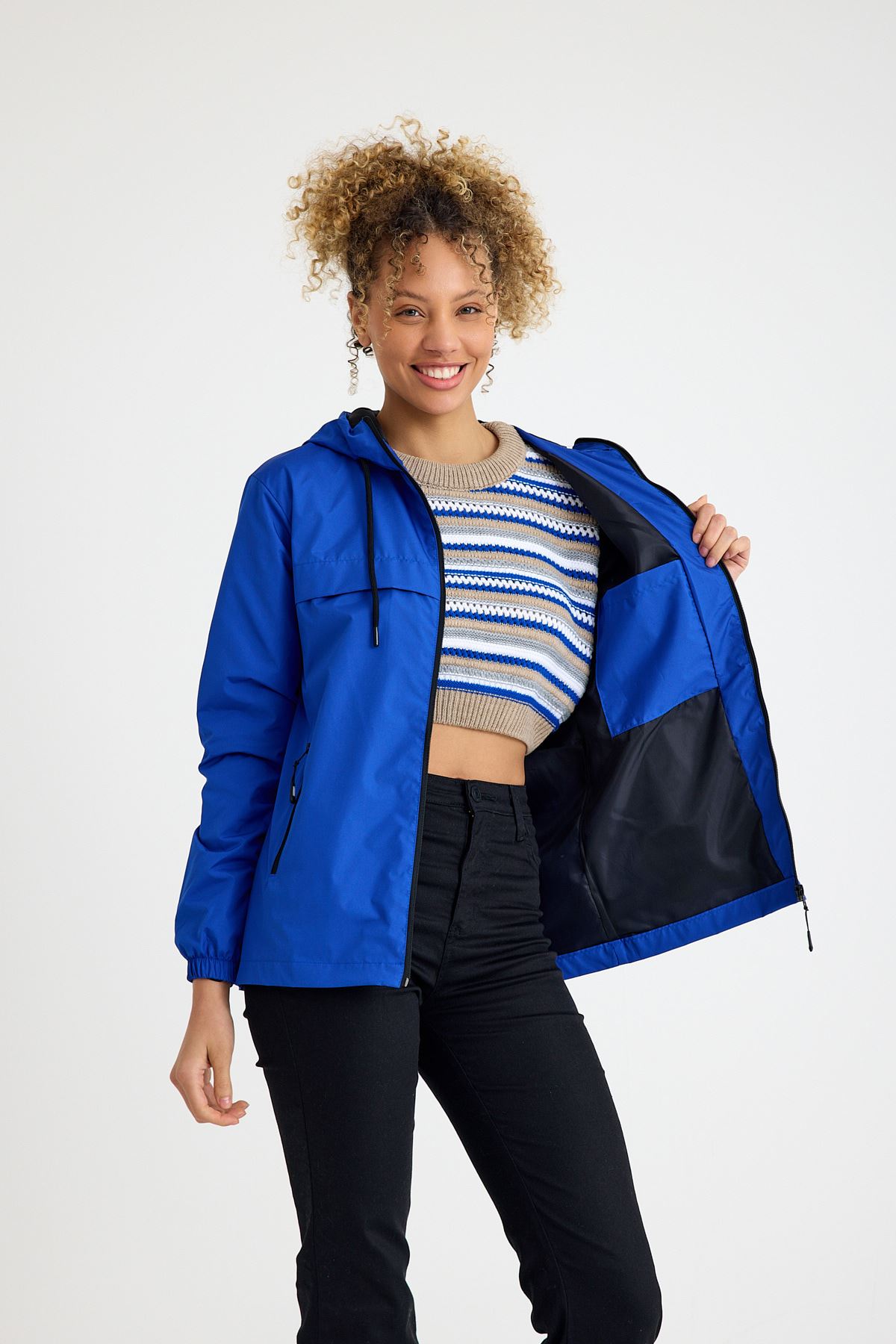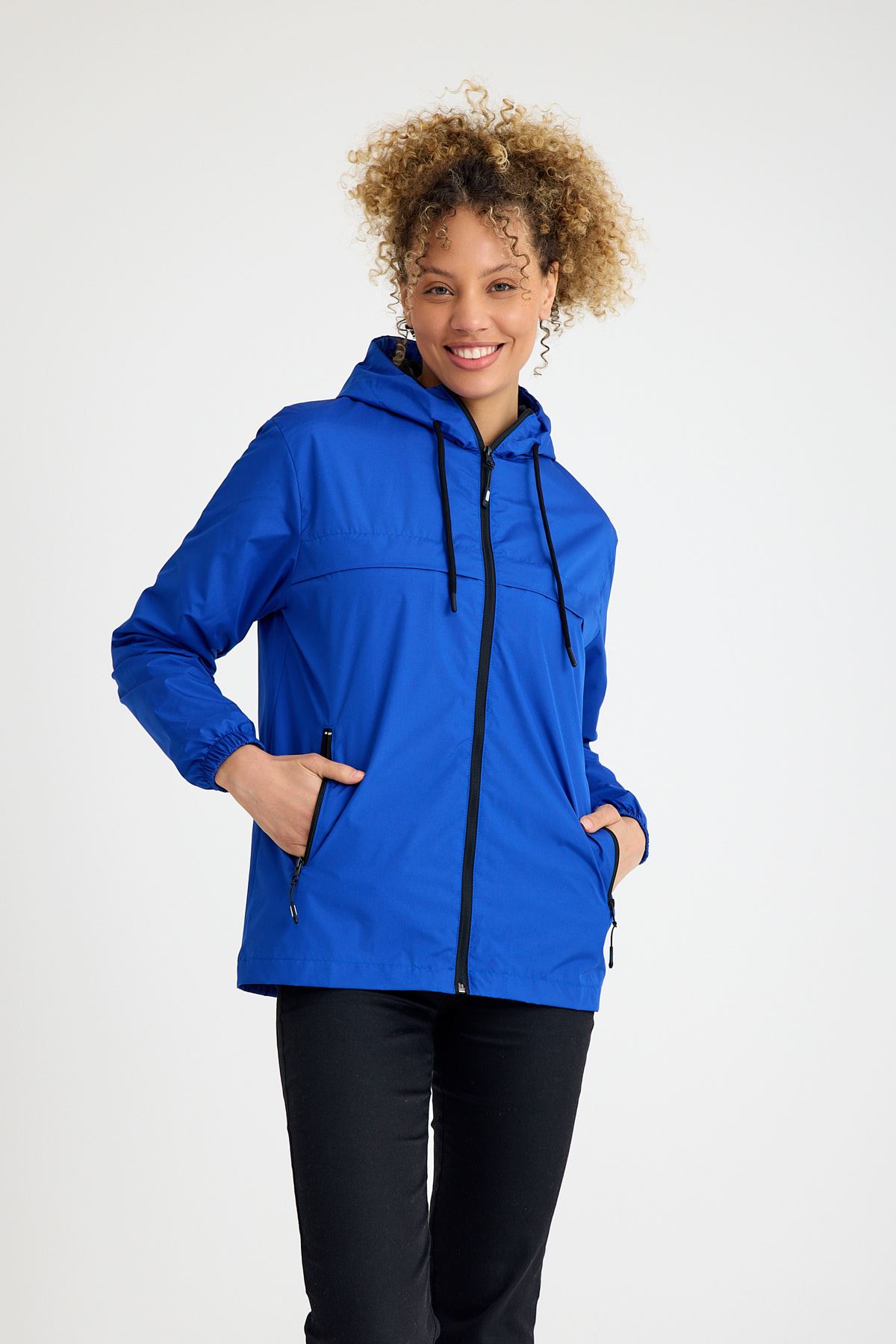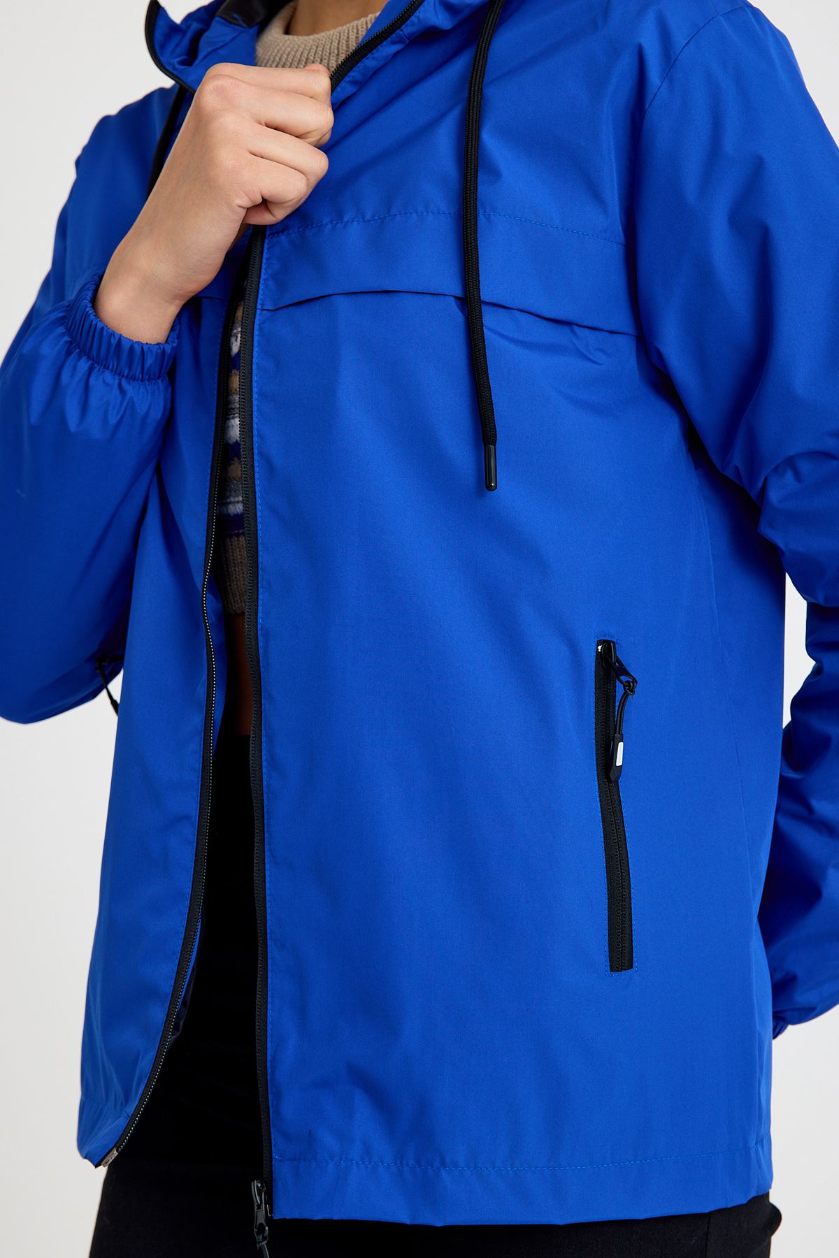 Kadın Içi Astarlı Suya Dayanıklı Kapüşonlu Cepli Yağmurluk SAKS MAVİ