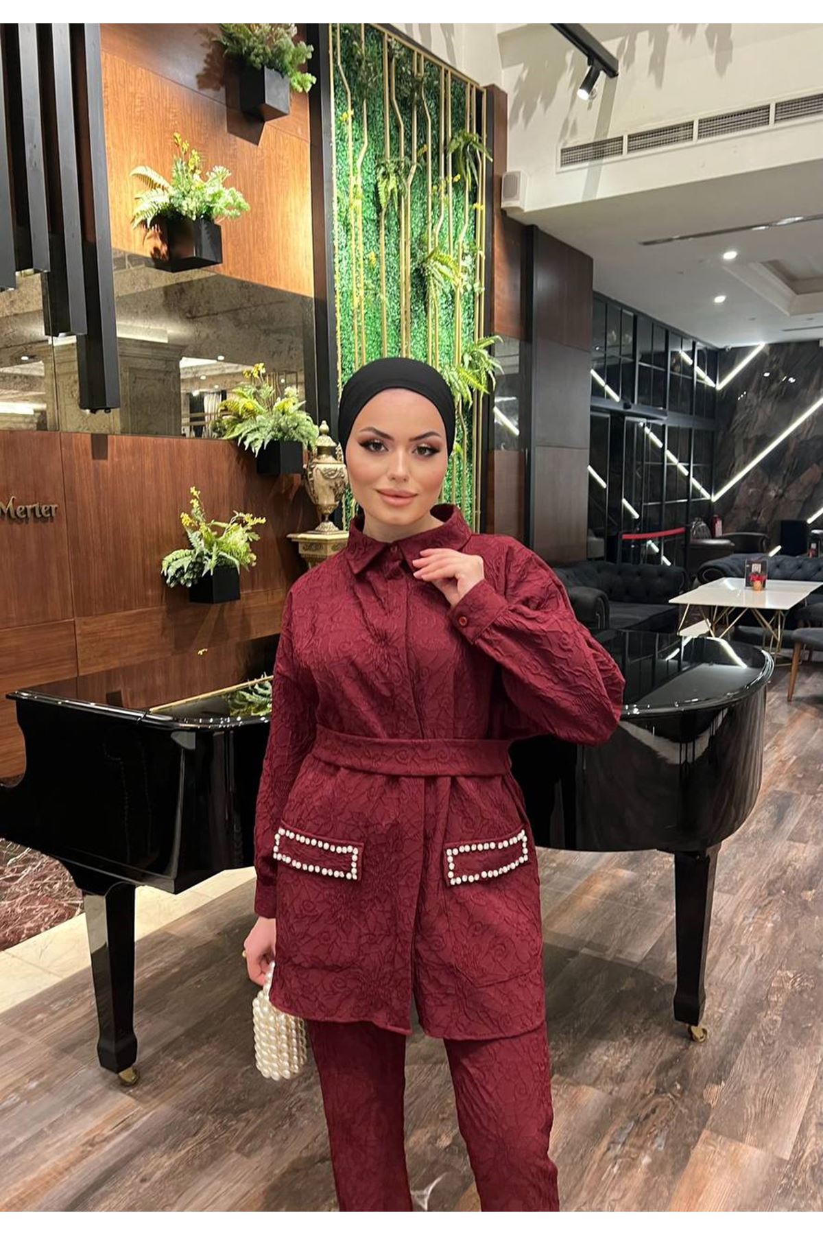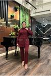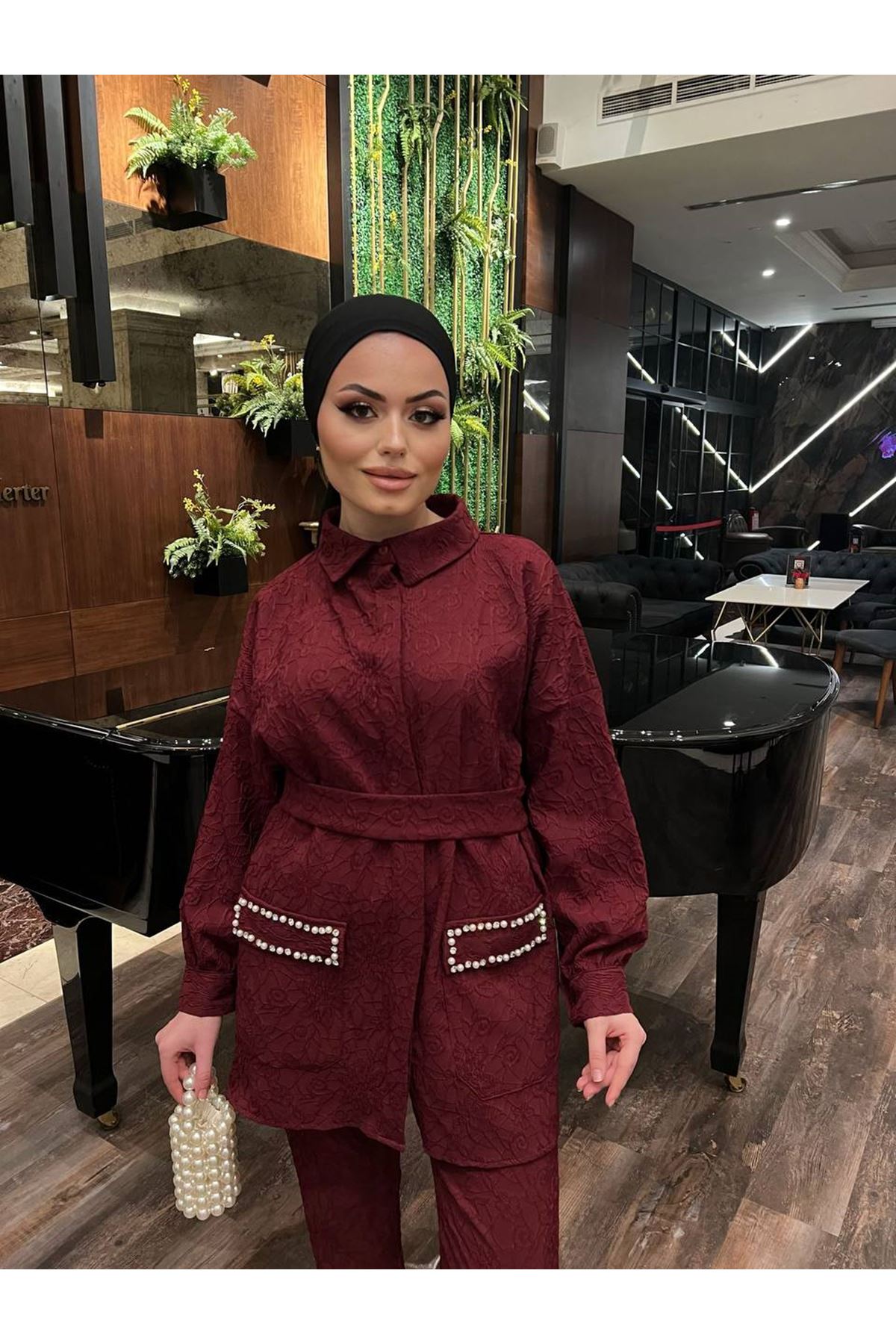Kadın Jakarlı Bel Kuşaklı Cep Taşlı Alt Üst Takım BORDO