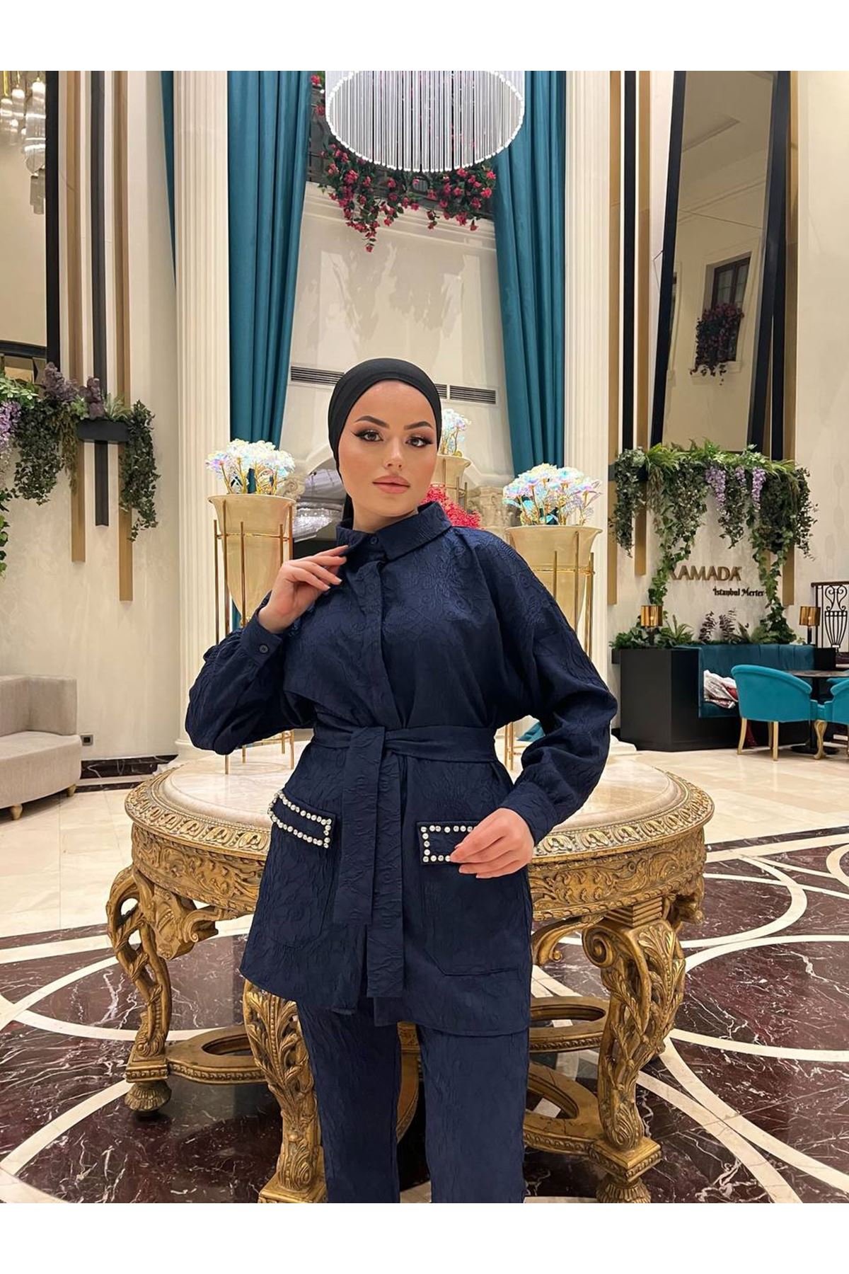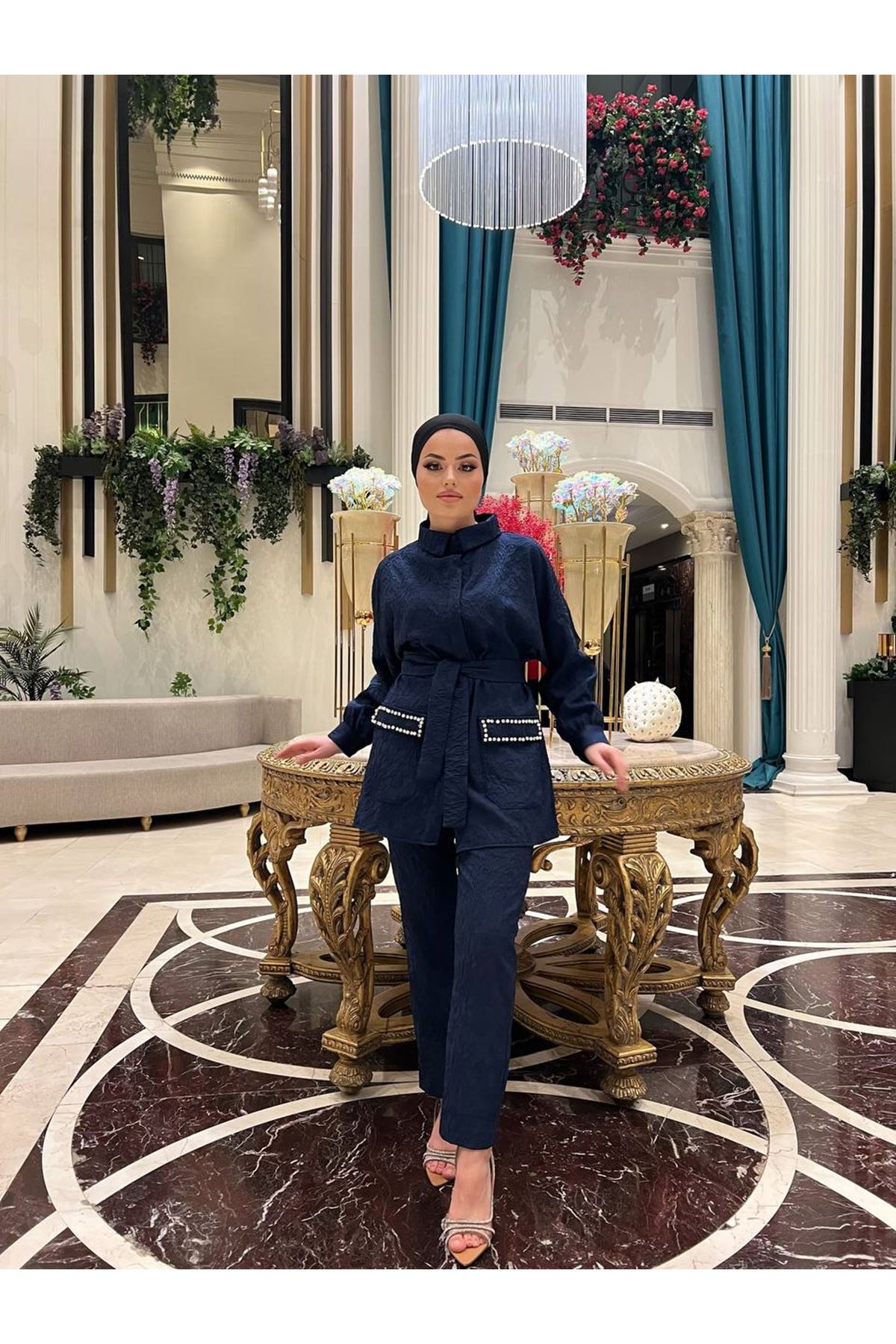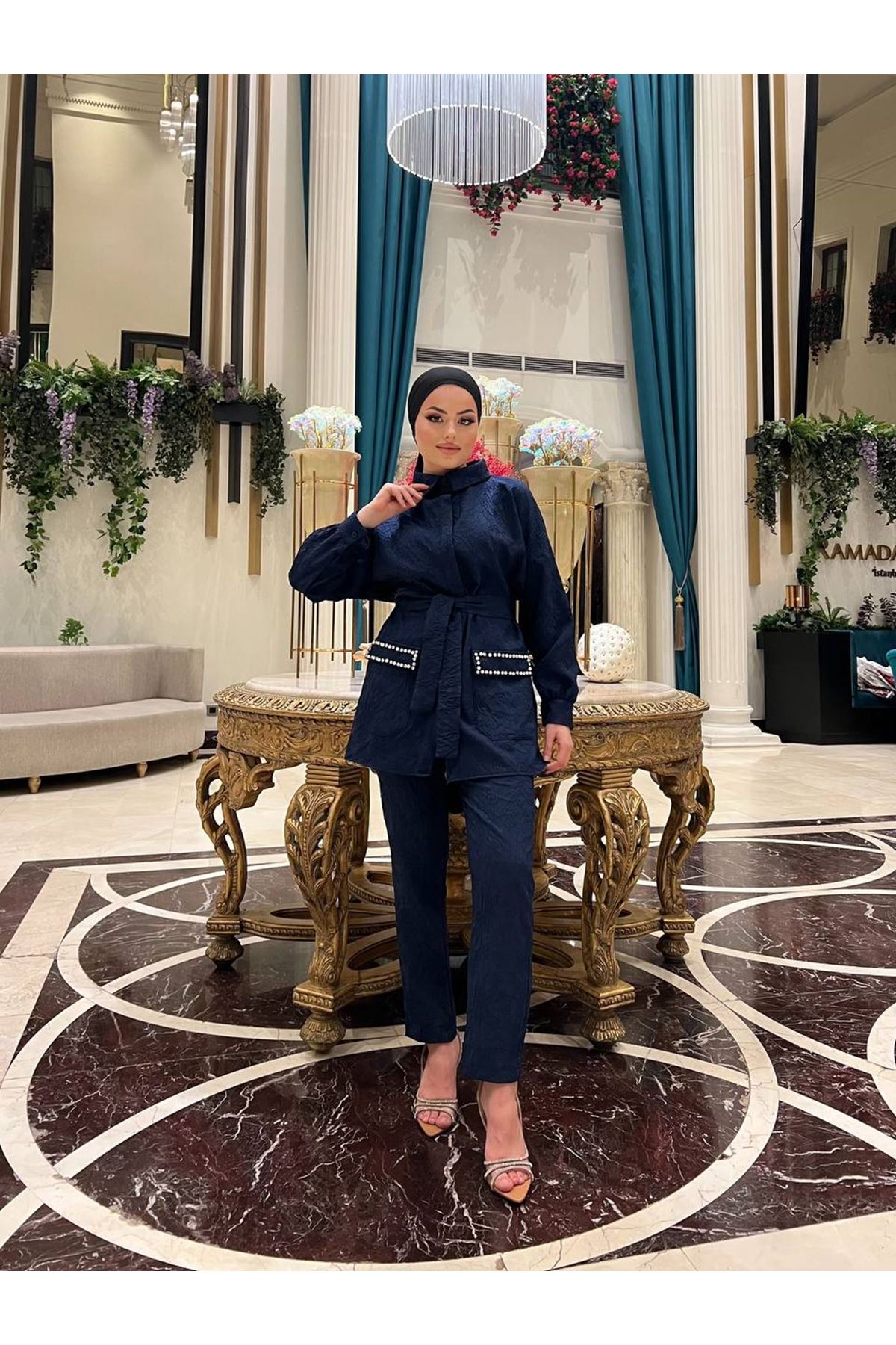 Kadın Jakarlı Bel Kuşaklı Cep Taşlı Alt Üst Takım LACİVERT
