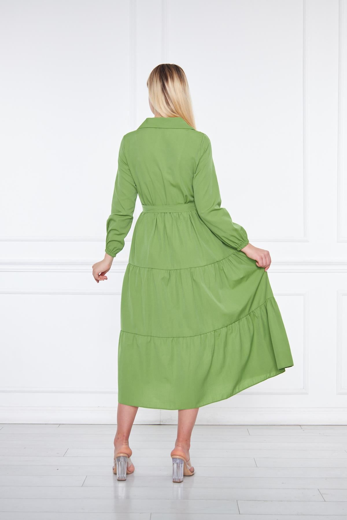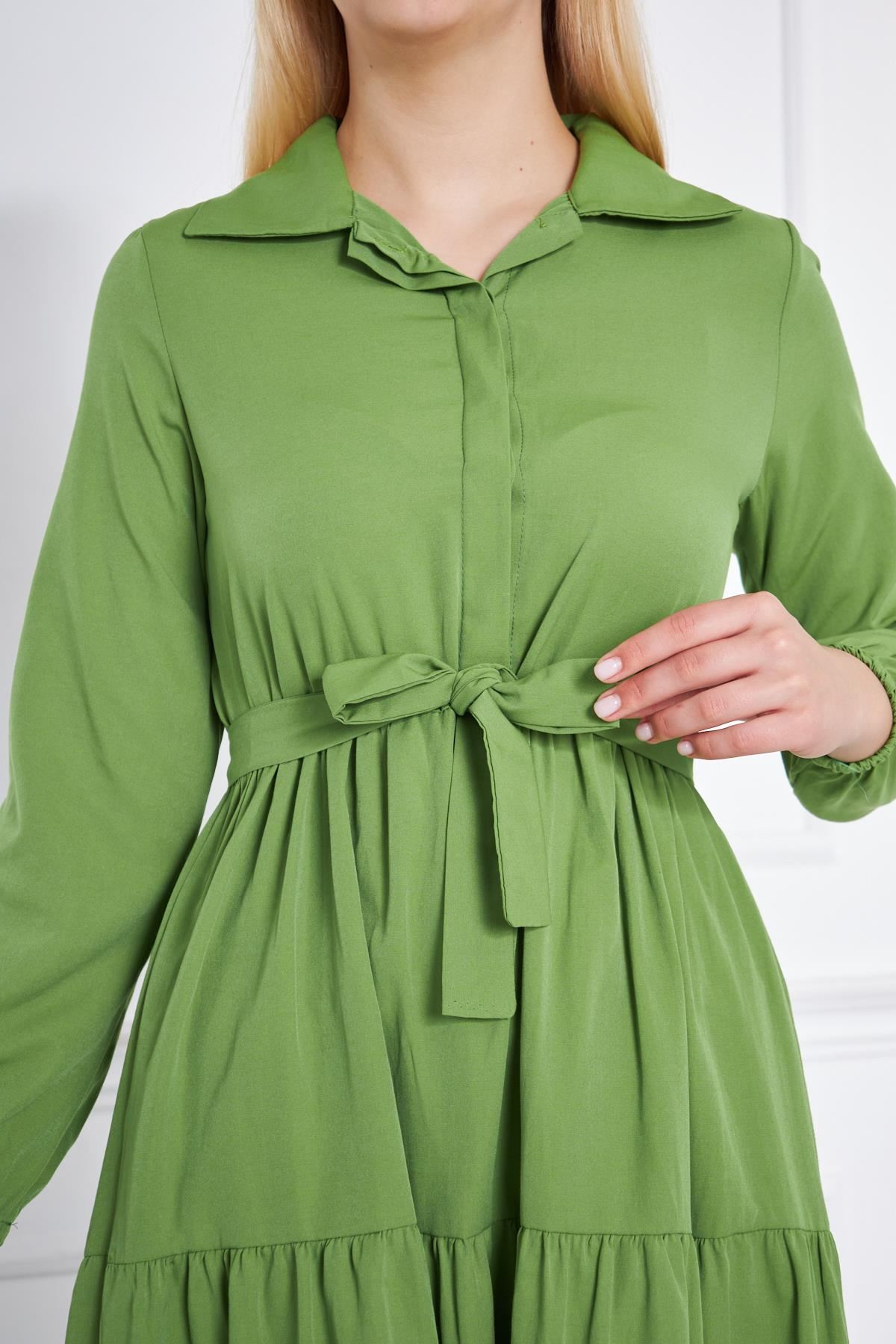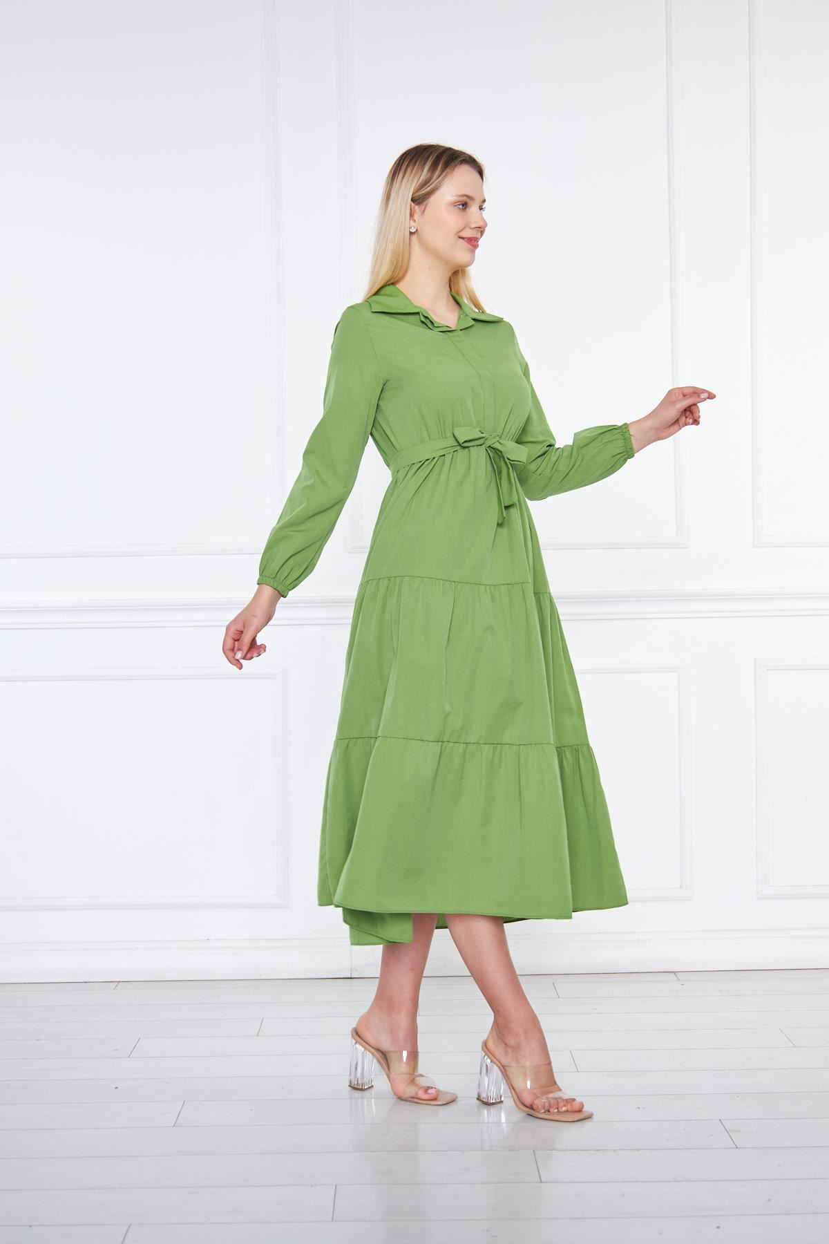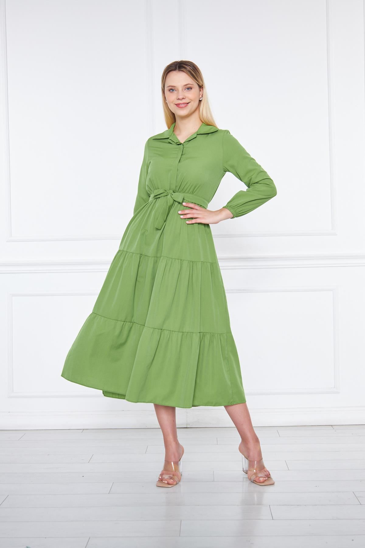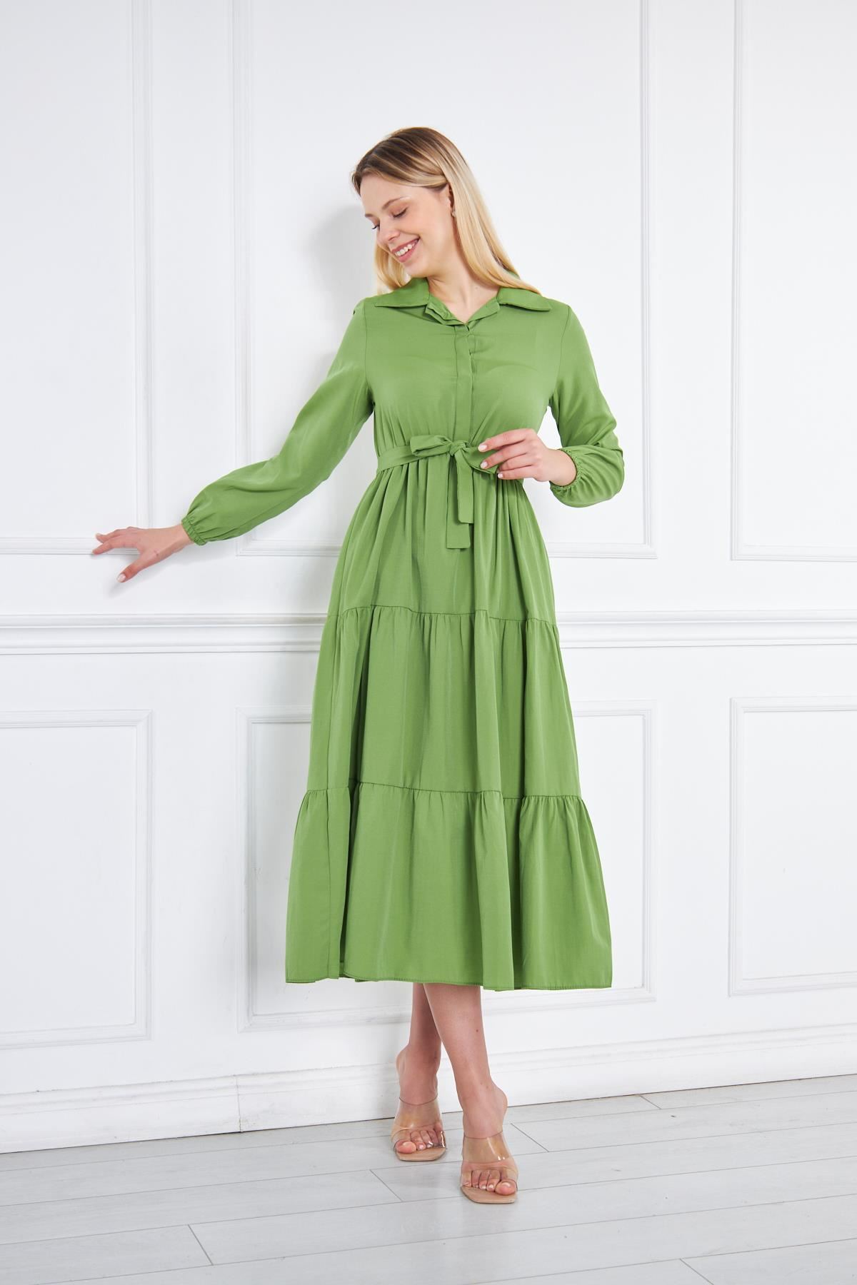 Kadın Katlı Gömlek Yaka Elbise YAĞ YEŞİLİ