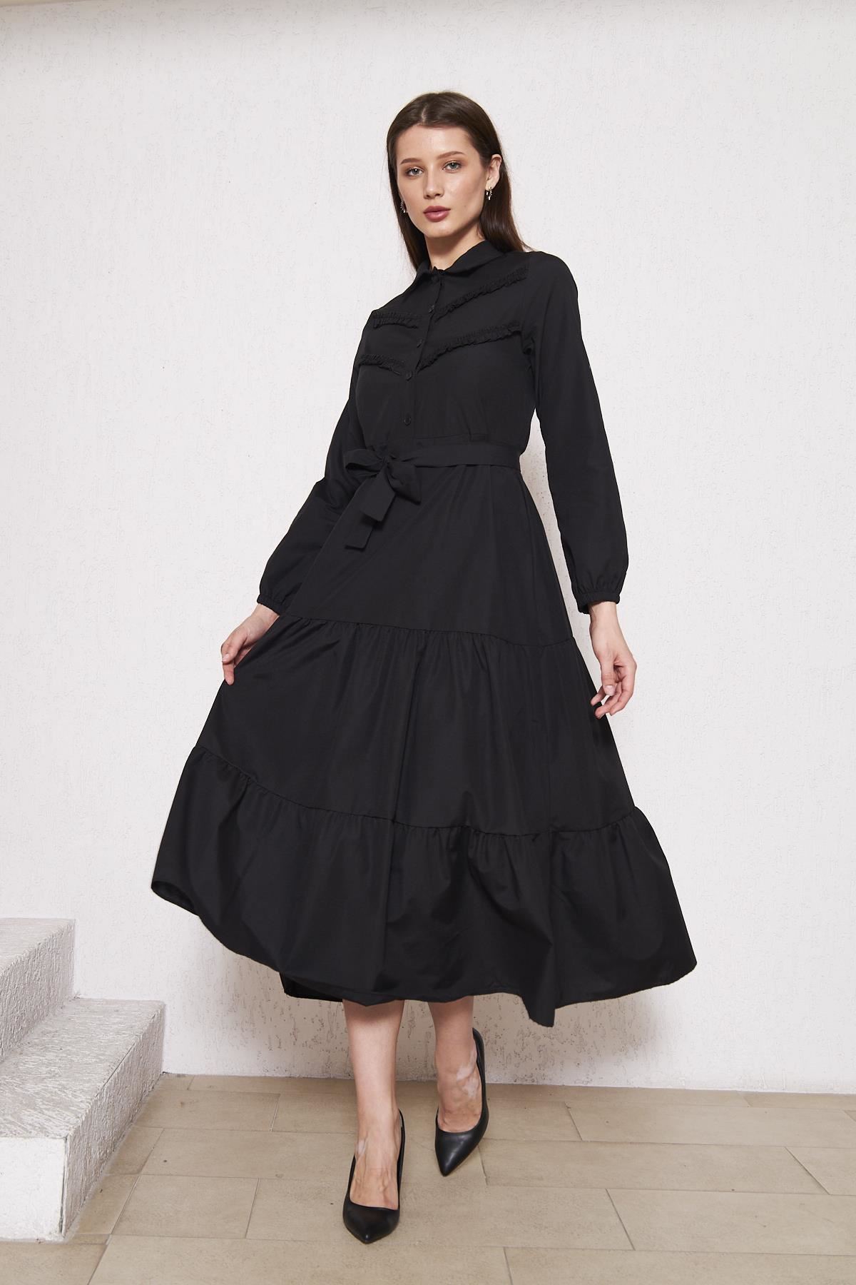 Kadın Katlı Pilise Detaylı Gömlek Yaka Elbise SİYAH