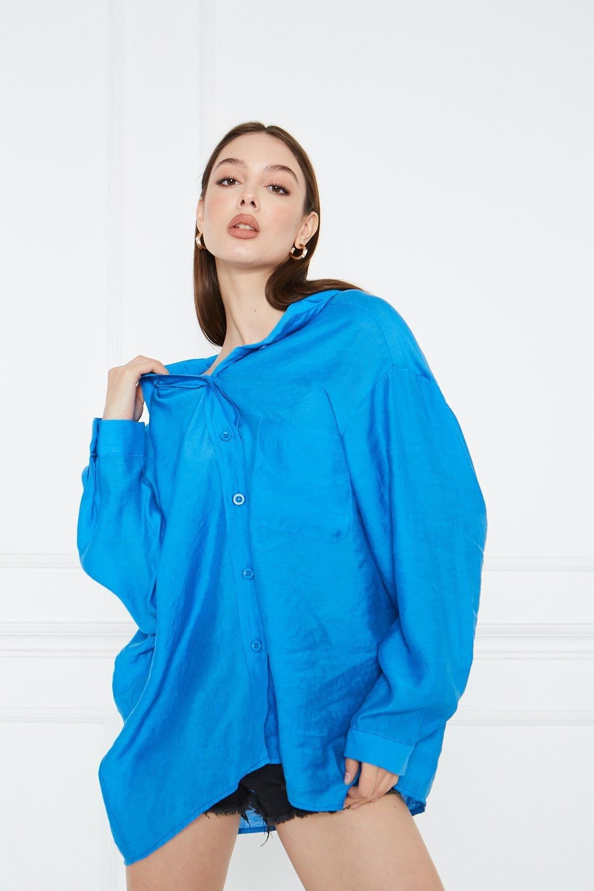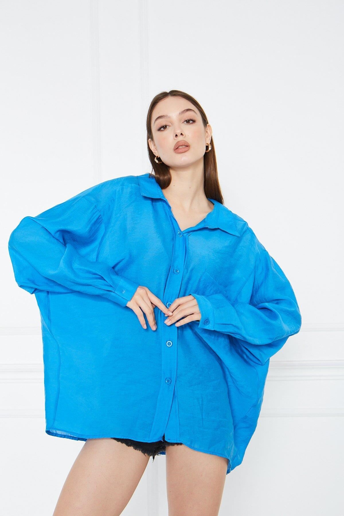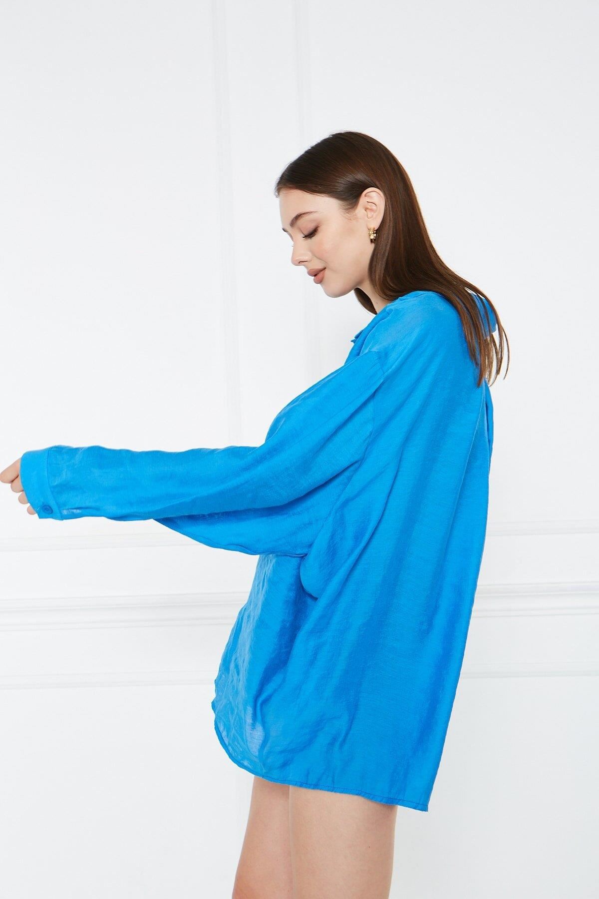 KADIN OVERSİZE UZUN BASİC GÖMLEK MAVİ