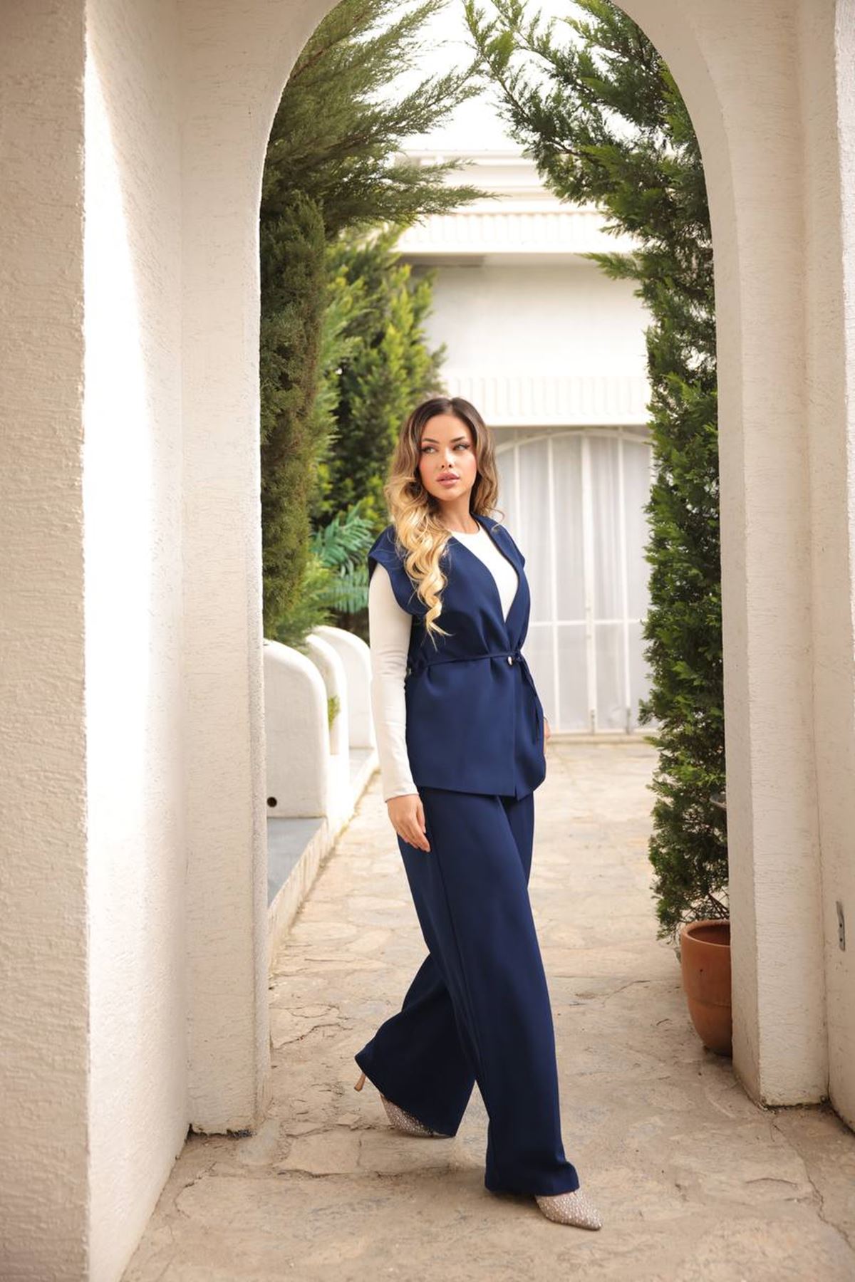 Kadın Şık Uzun Yelek Bol Paça Palazzo Pantolon Yelekli Takım LACİVERT