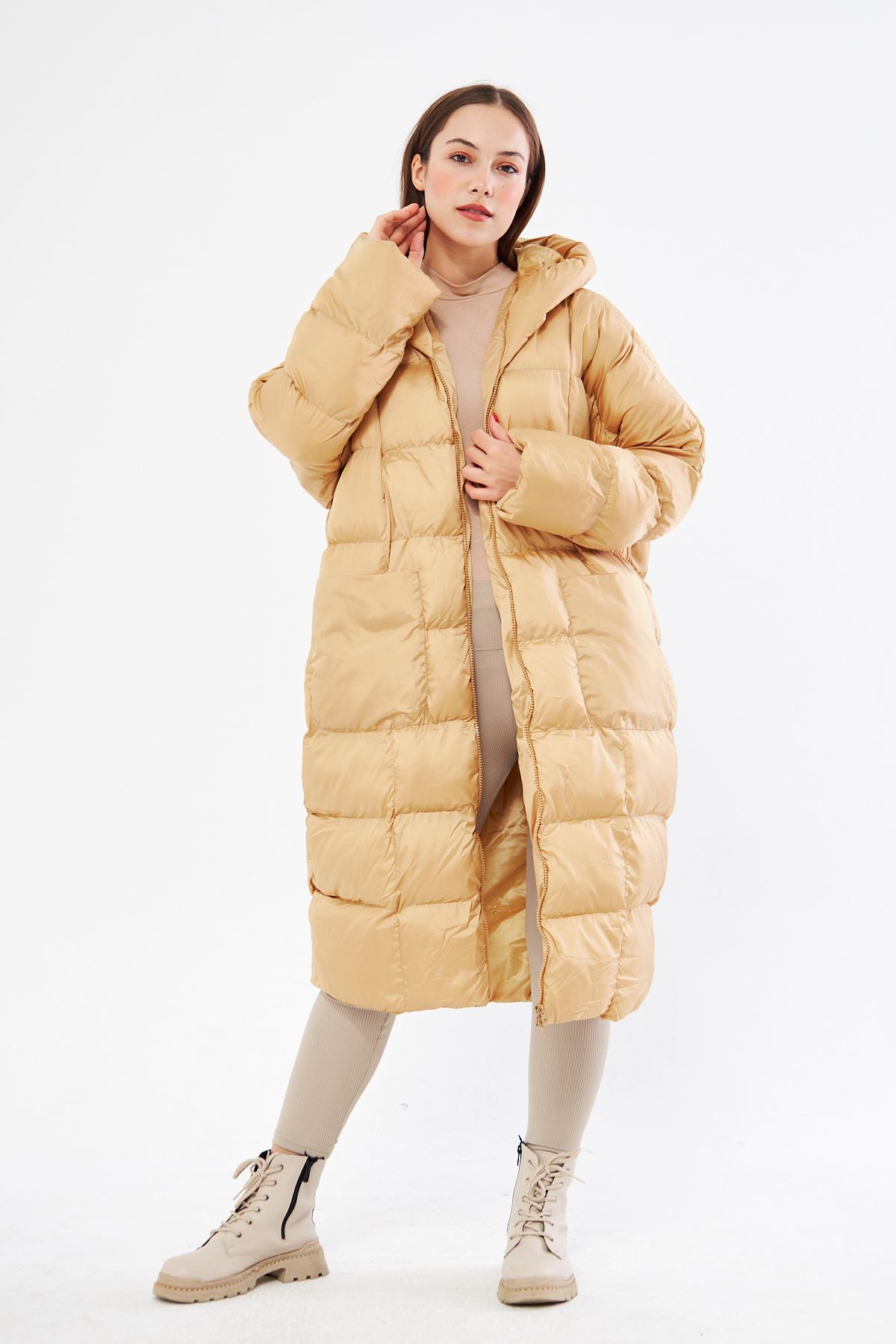 Kadın Siyah Kapüşonlu Uzun Oversize Şişme Mont GOLD