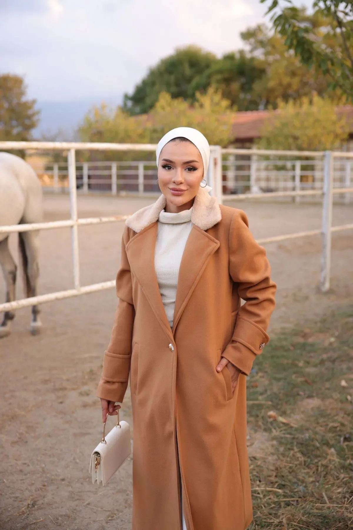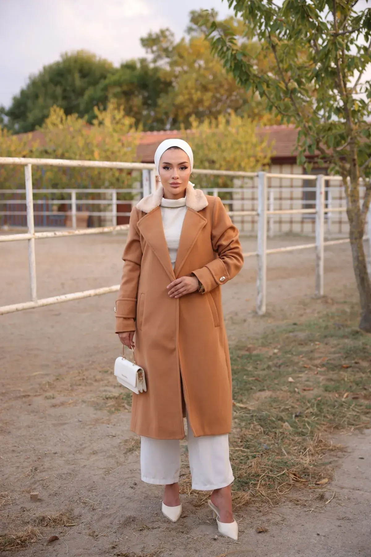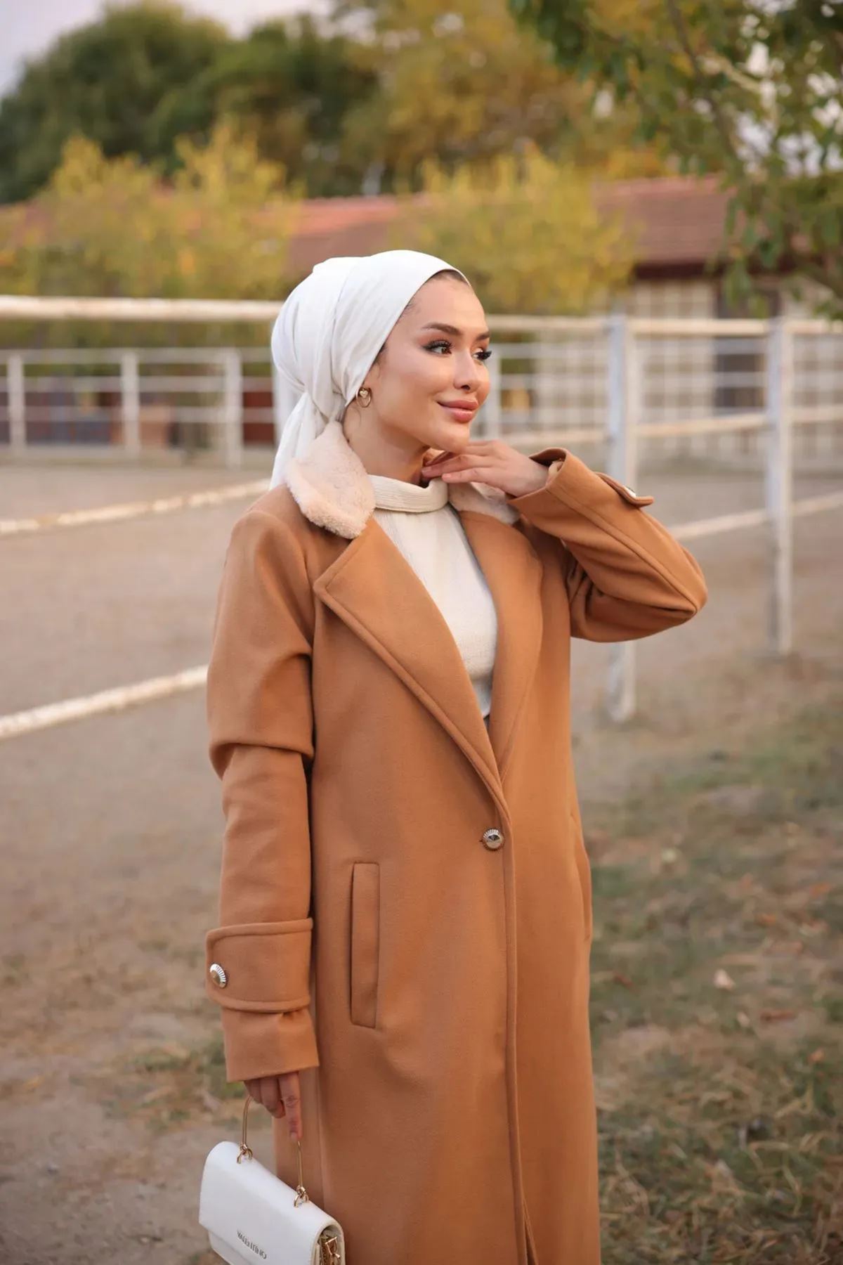 Kadın Yaka Kürk Detaylı Kışlık Kaşe Kaban Taba