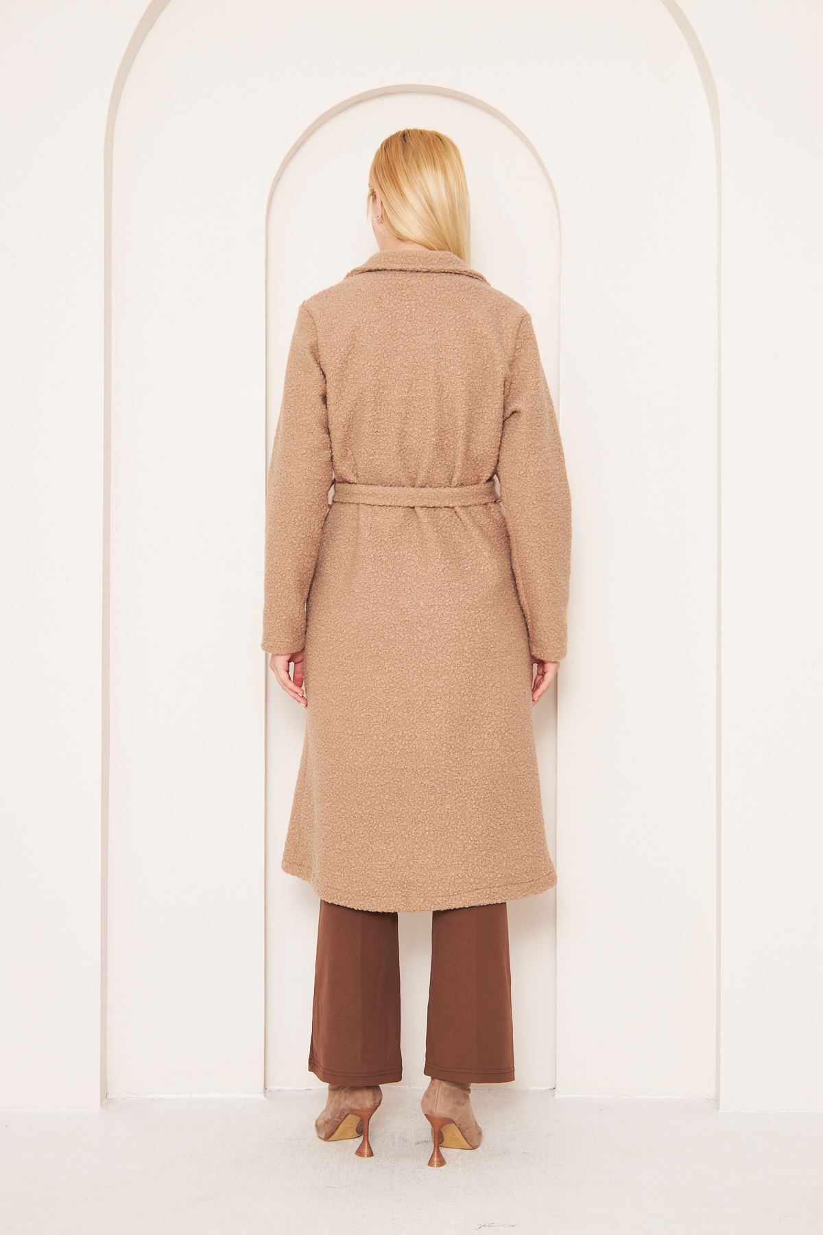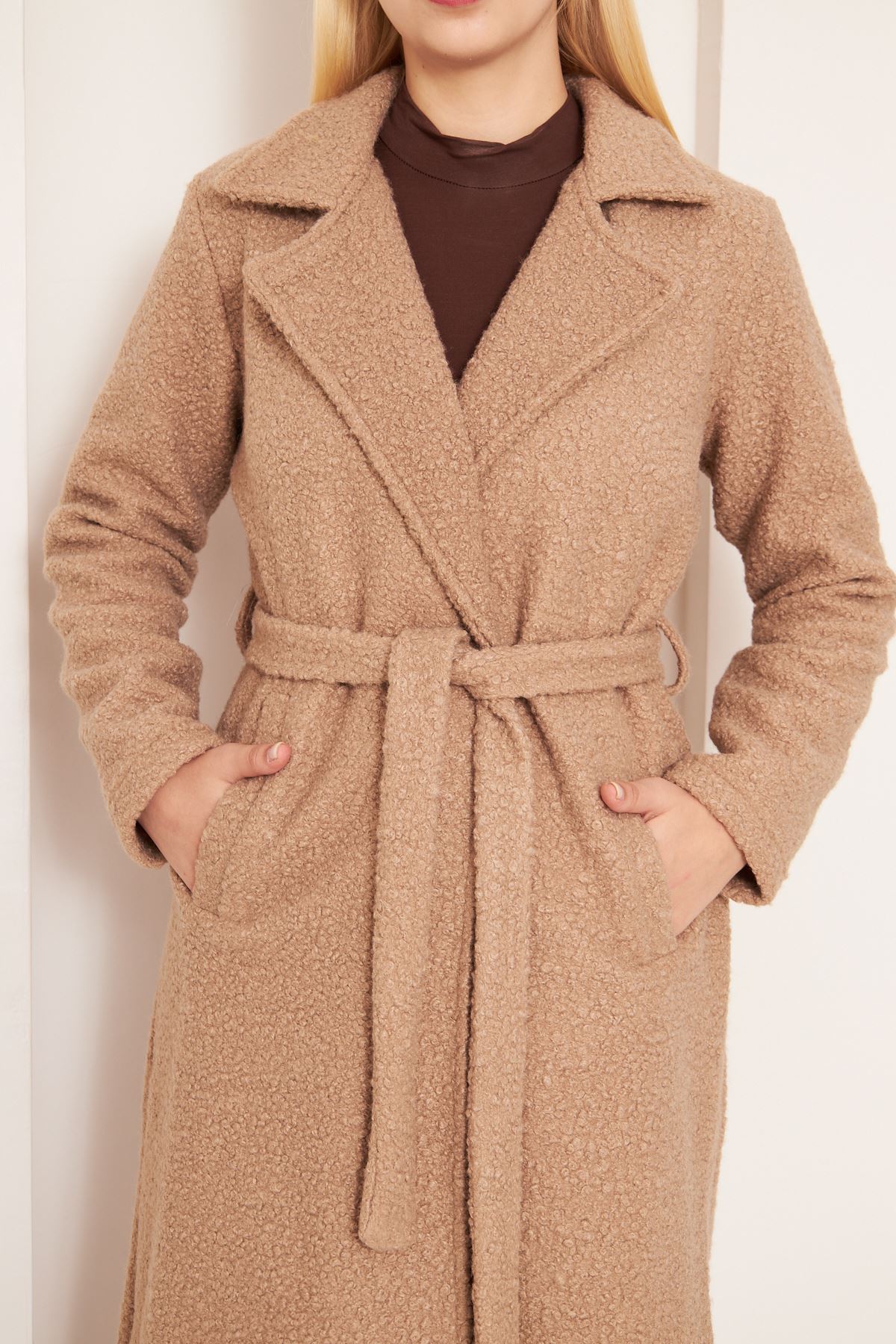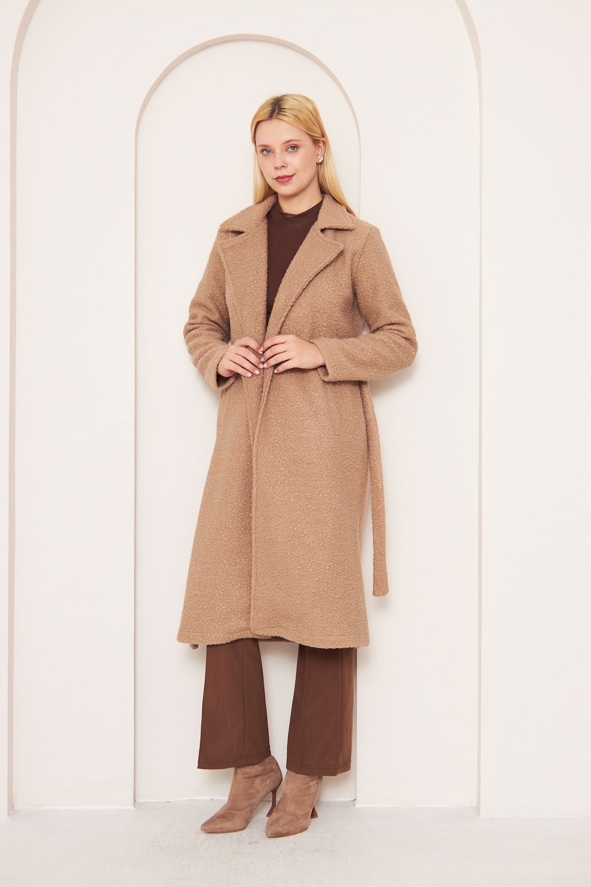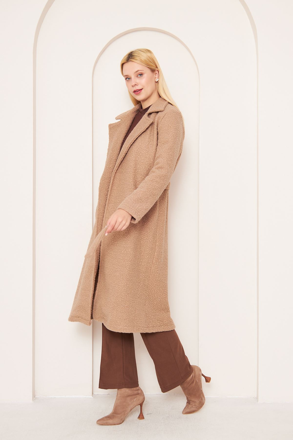 Kadın Yün Karışımlı Astarsız Buklet Kaban KAHVE