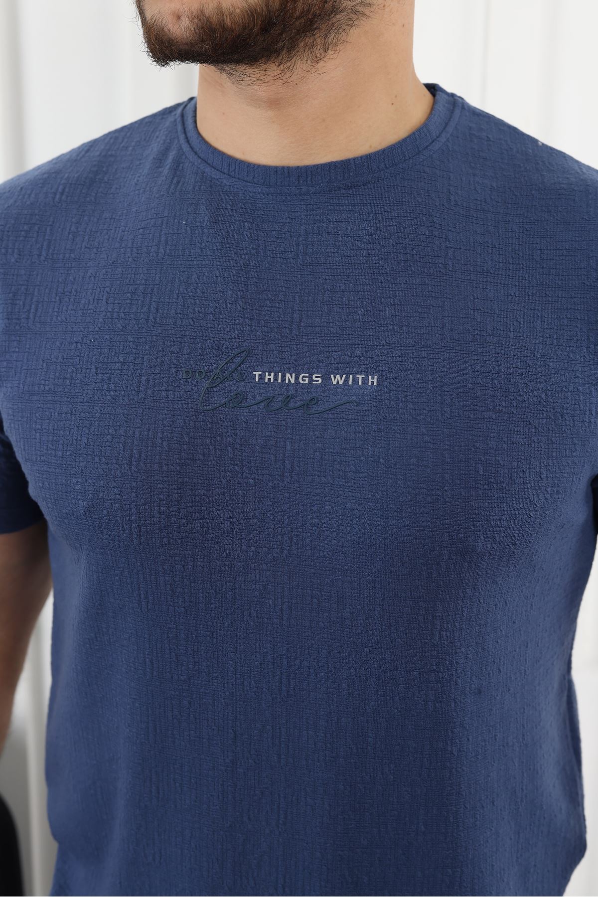 Kendinden Desenli Baskılı T-Shirt LACİVERT