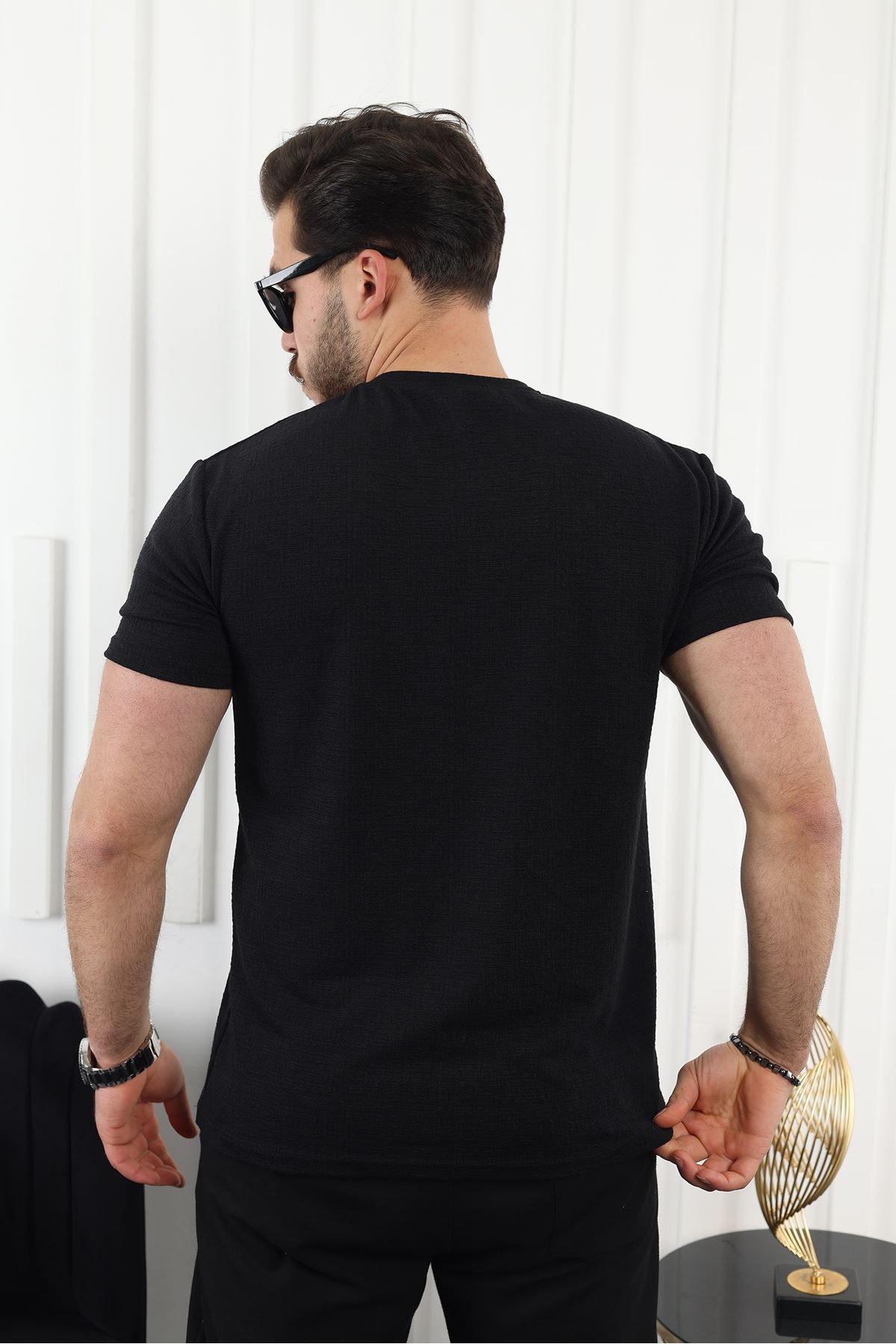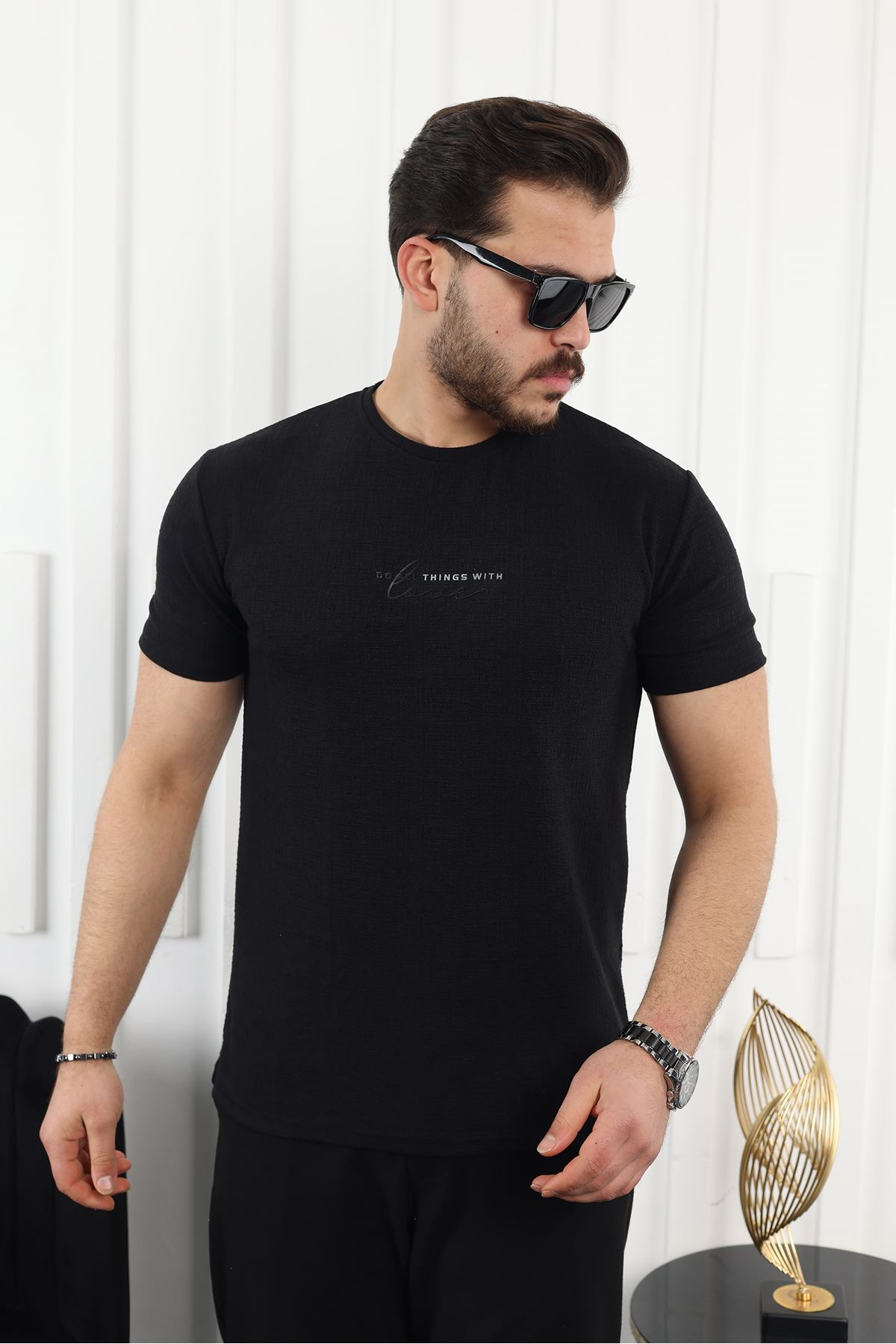 Kendinden Desenli Baskılı T-Shirt SİYAH