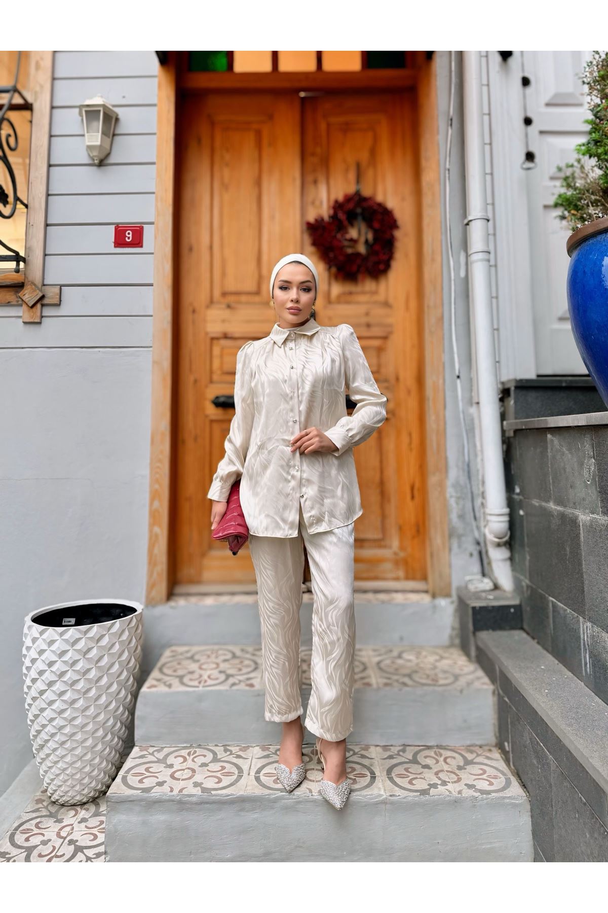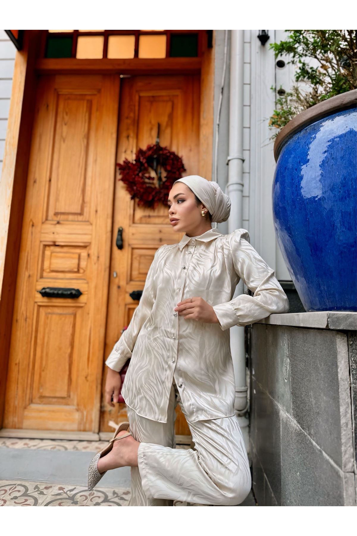 Kendinden Desenli Gömlekli Takım KREM