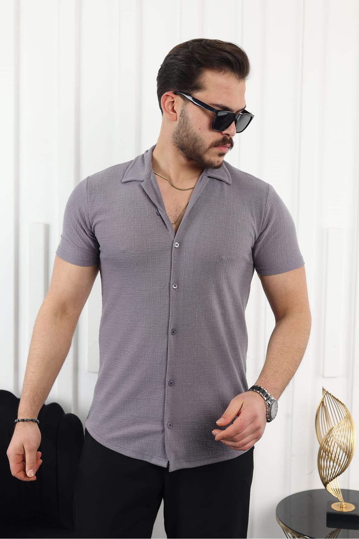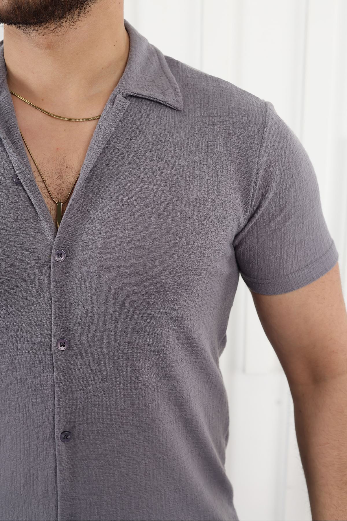 Kendinden Desenli Kısa Kol Keten Gömlek FÜME