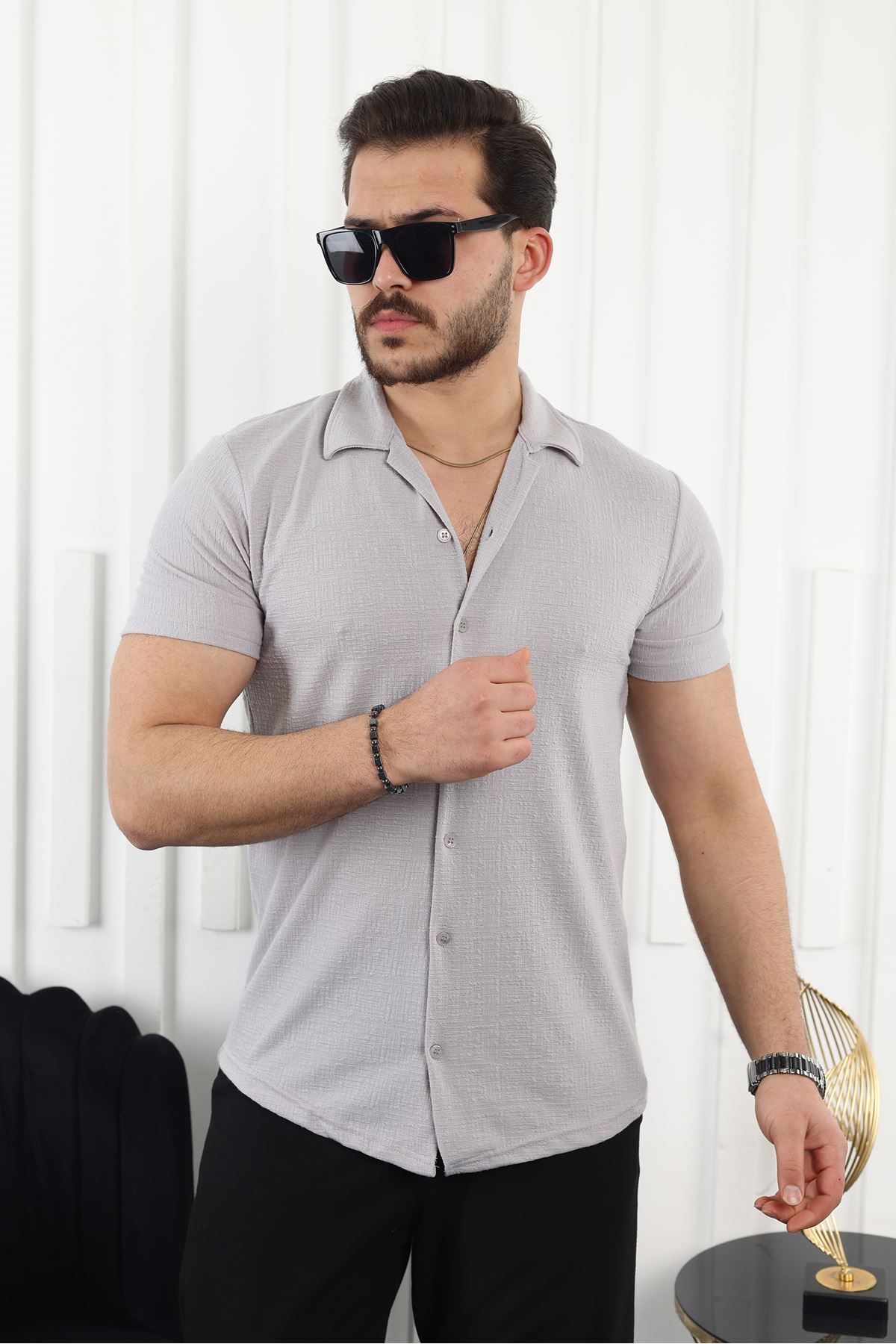 Kendinden Desenli Kısa Kol Keten Gömlek GRİ