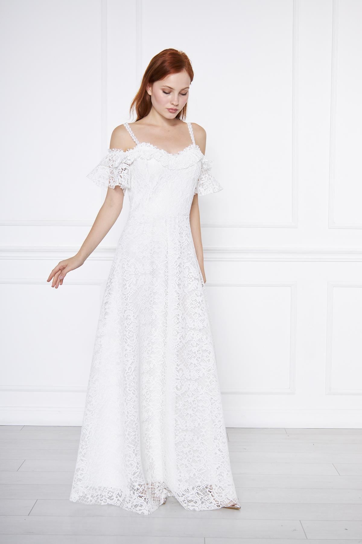Kolları Fırfırlı Askılı Uzun Dantel Abiye Elbise BEYAZ